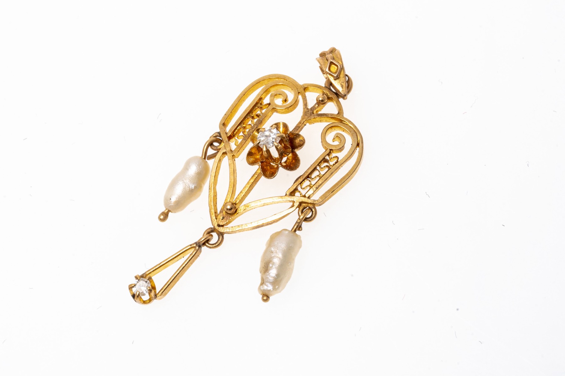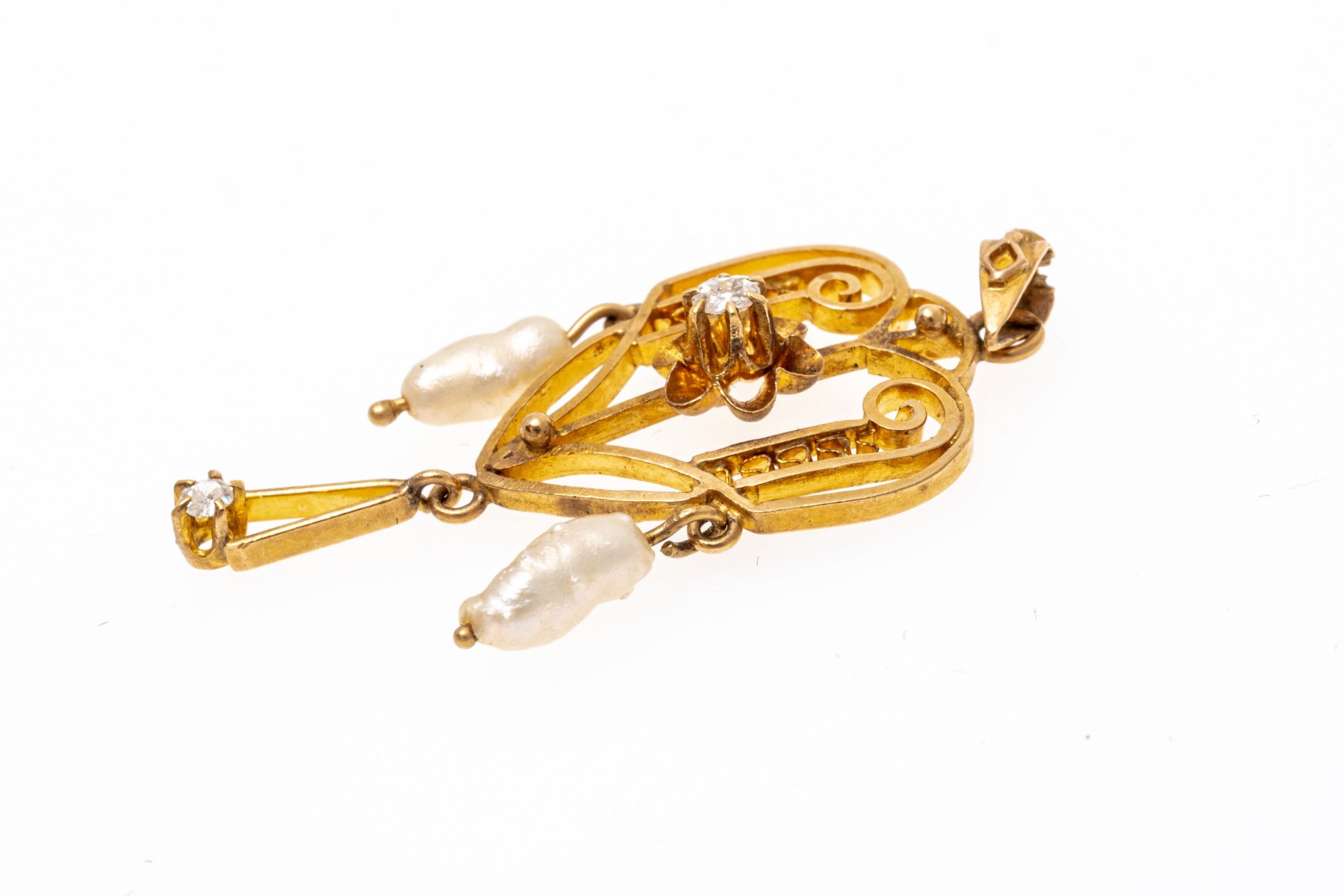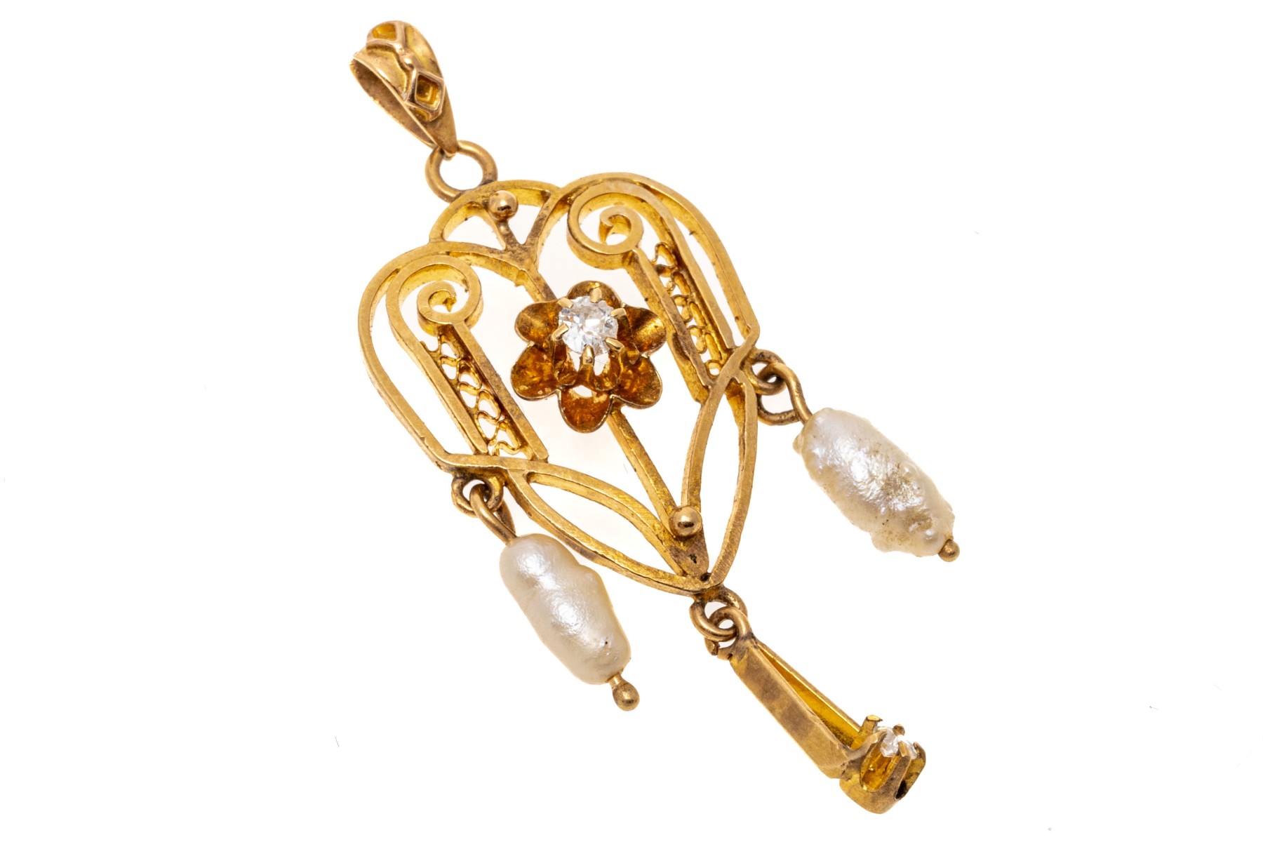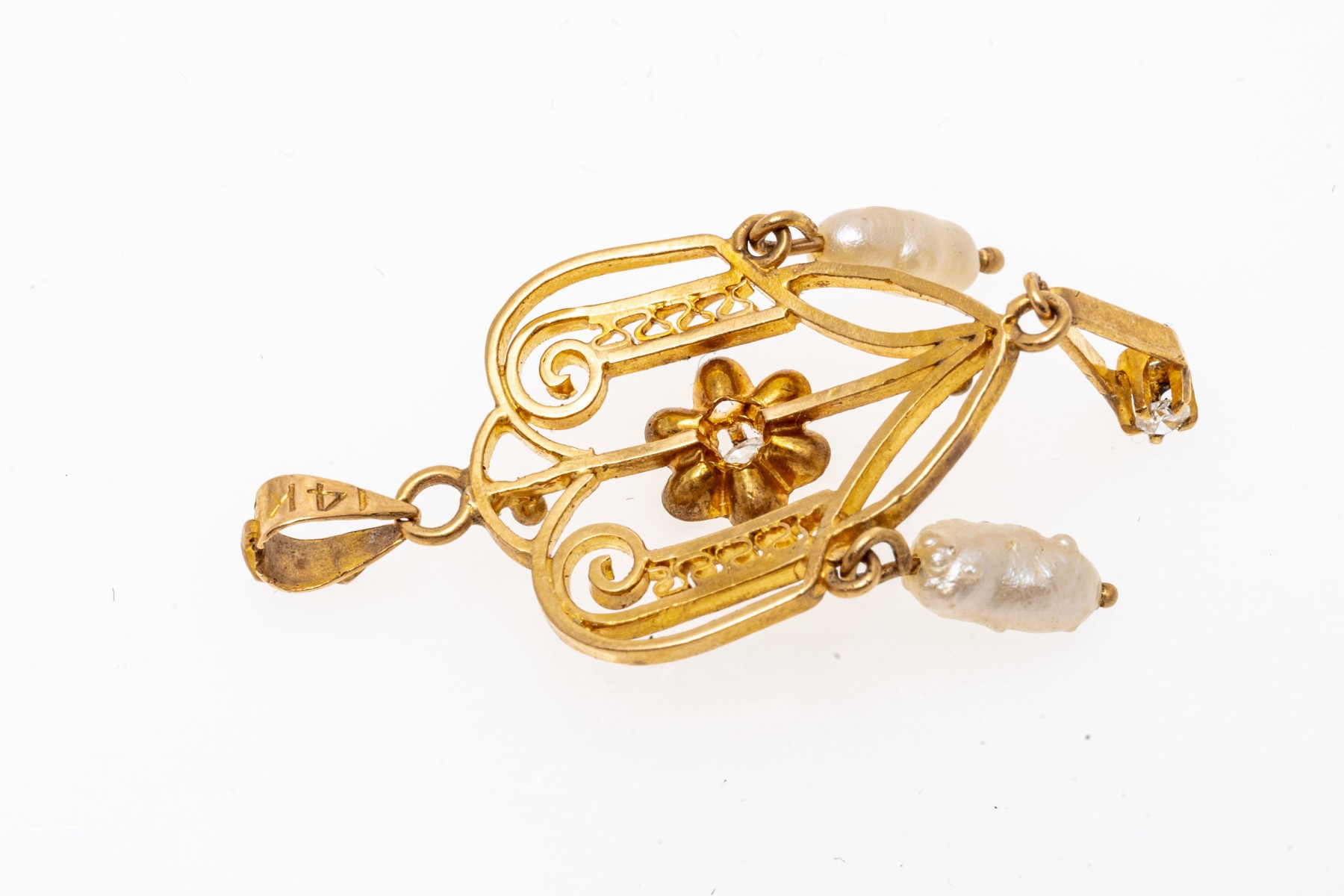 14k yellow gold lovely filigree lavaliere pendant, with cultured freshwater pearls and diamonds, approximately 0.04 TCW, prong set, finished with a patterned style bale