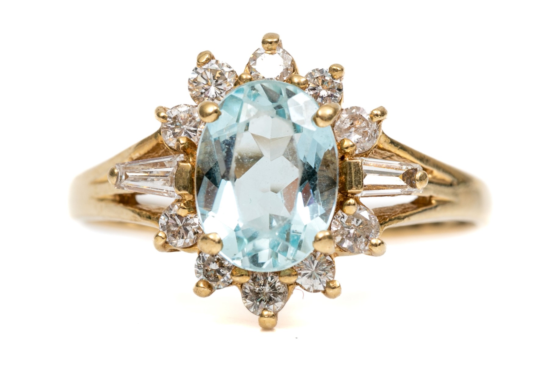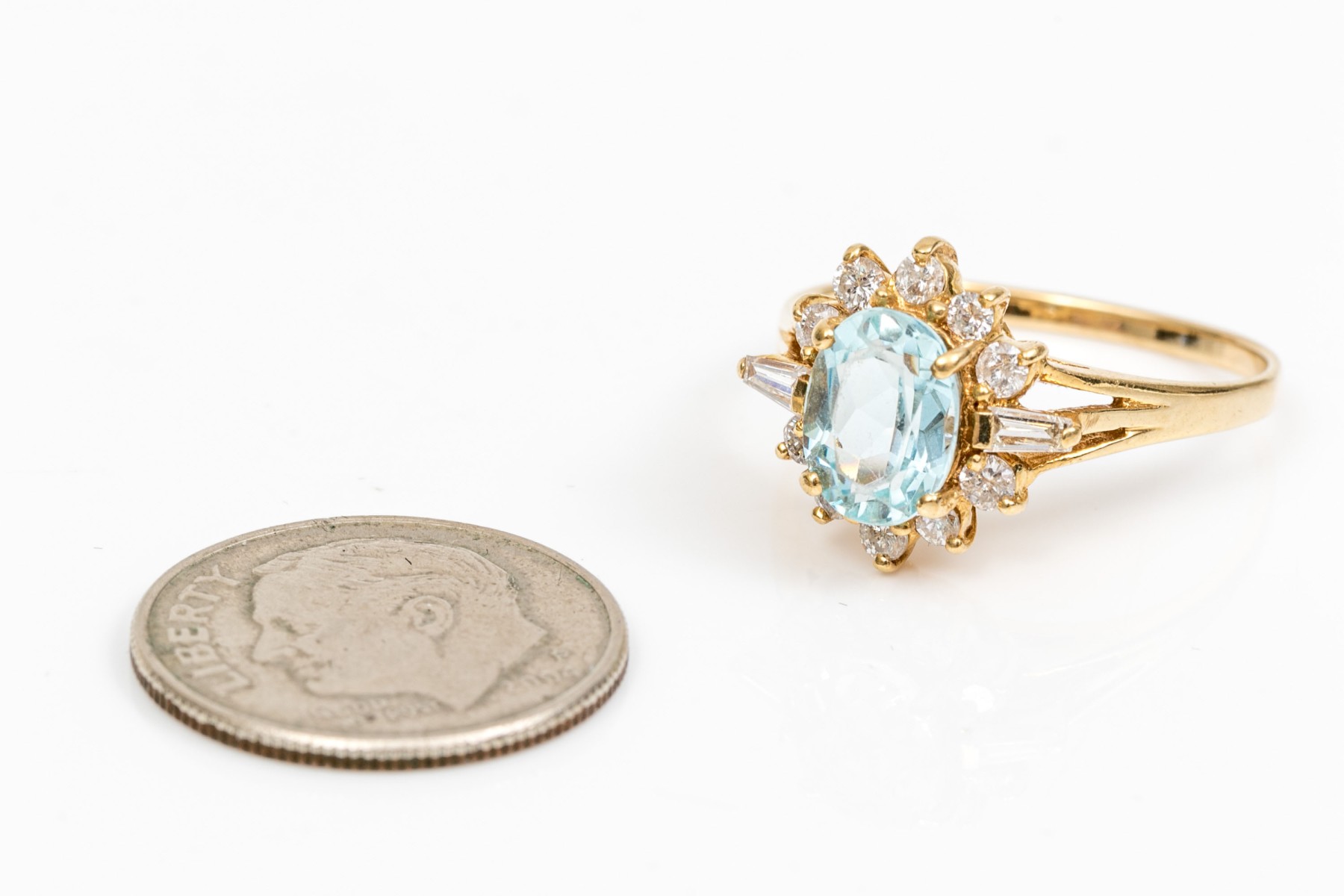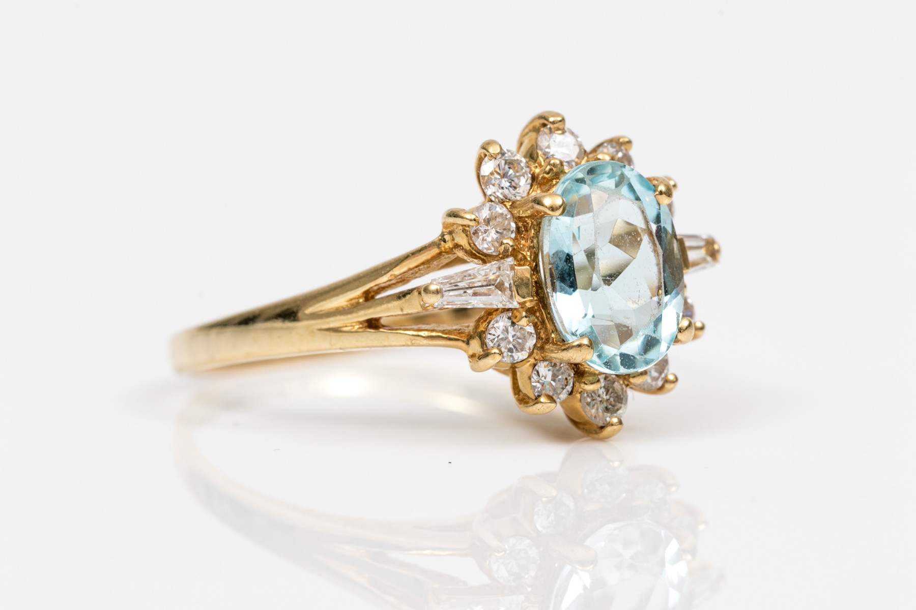 14k yellow gold lovely oval aquamarine and diamond halo ring, size 6.75, diamonds app. 0.20, aquamarine is app. 1.01 CTS, prong set