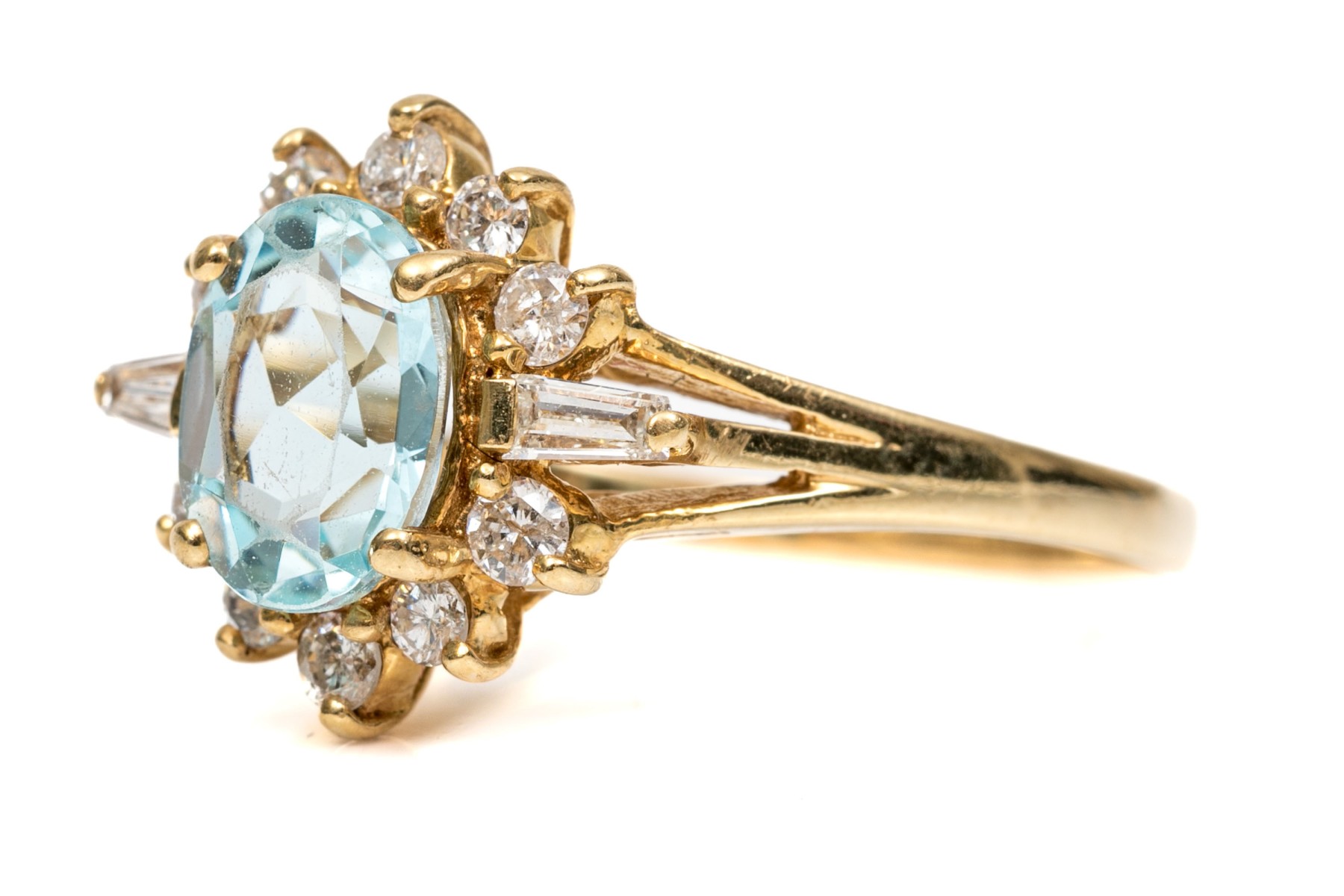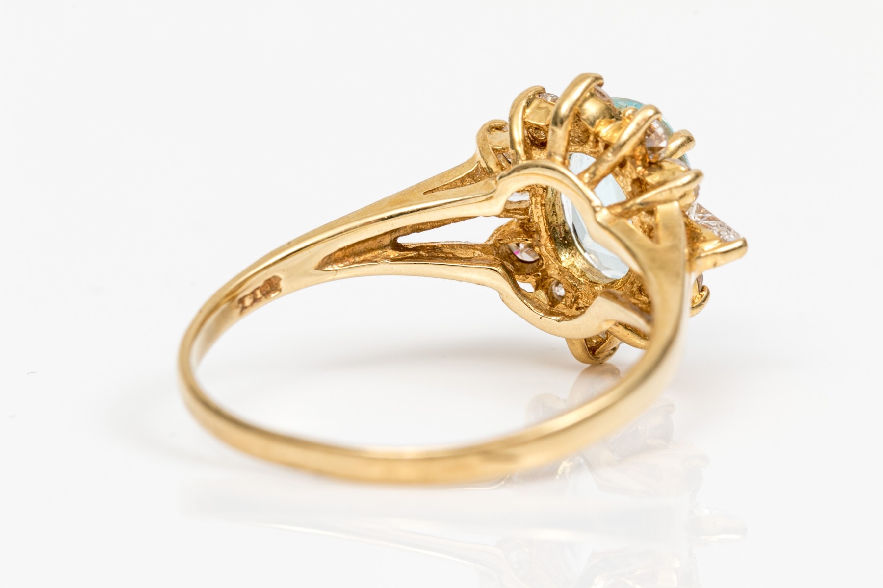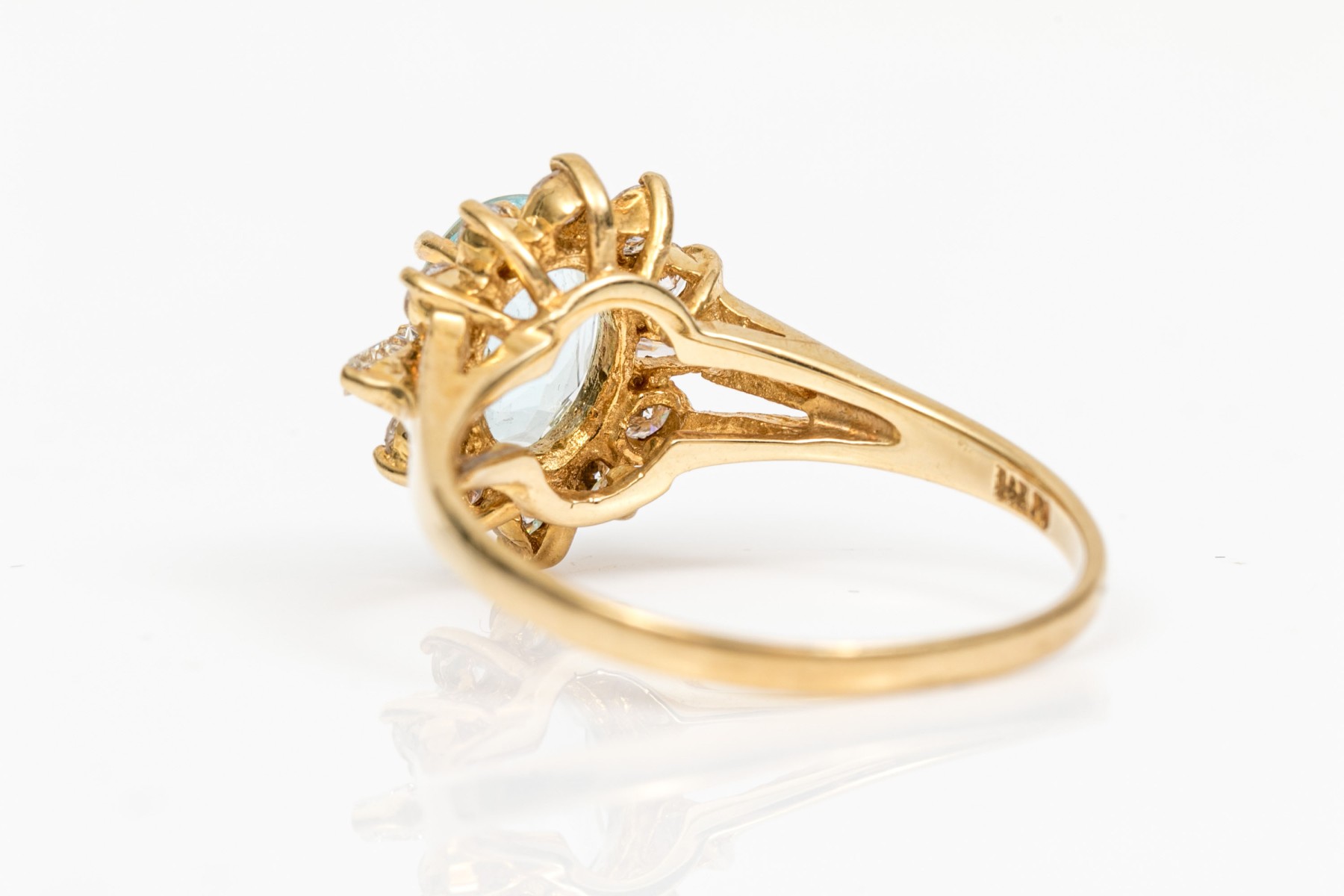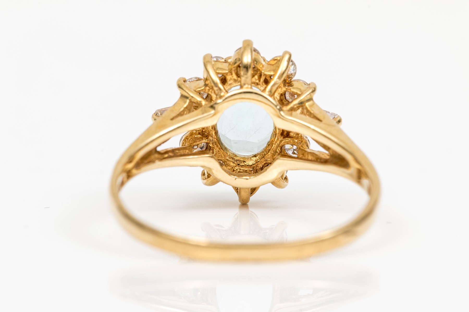 14k yellow gold lovely oval aquamarine and diamond halo ring, size 6.75, diamonds app. 0.20, aquamarine is app. 1.01 CTS, prong set