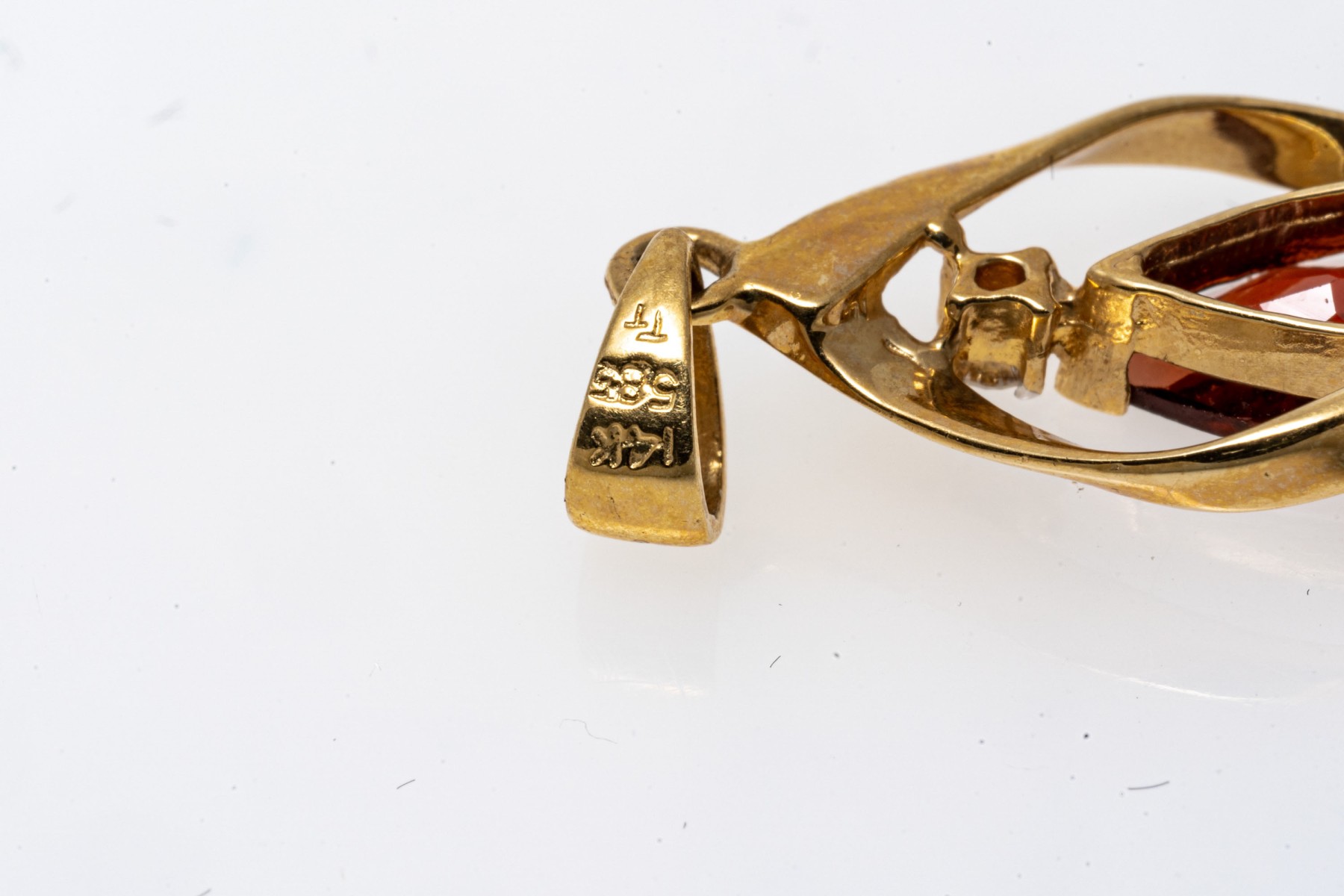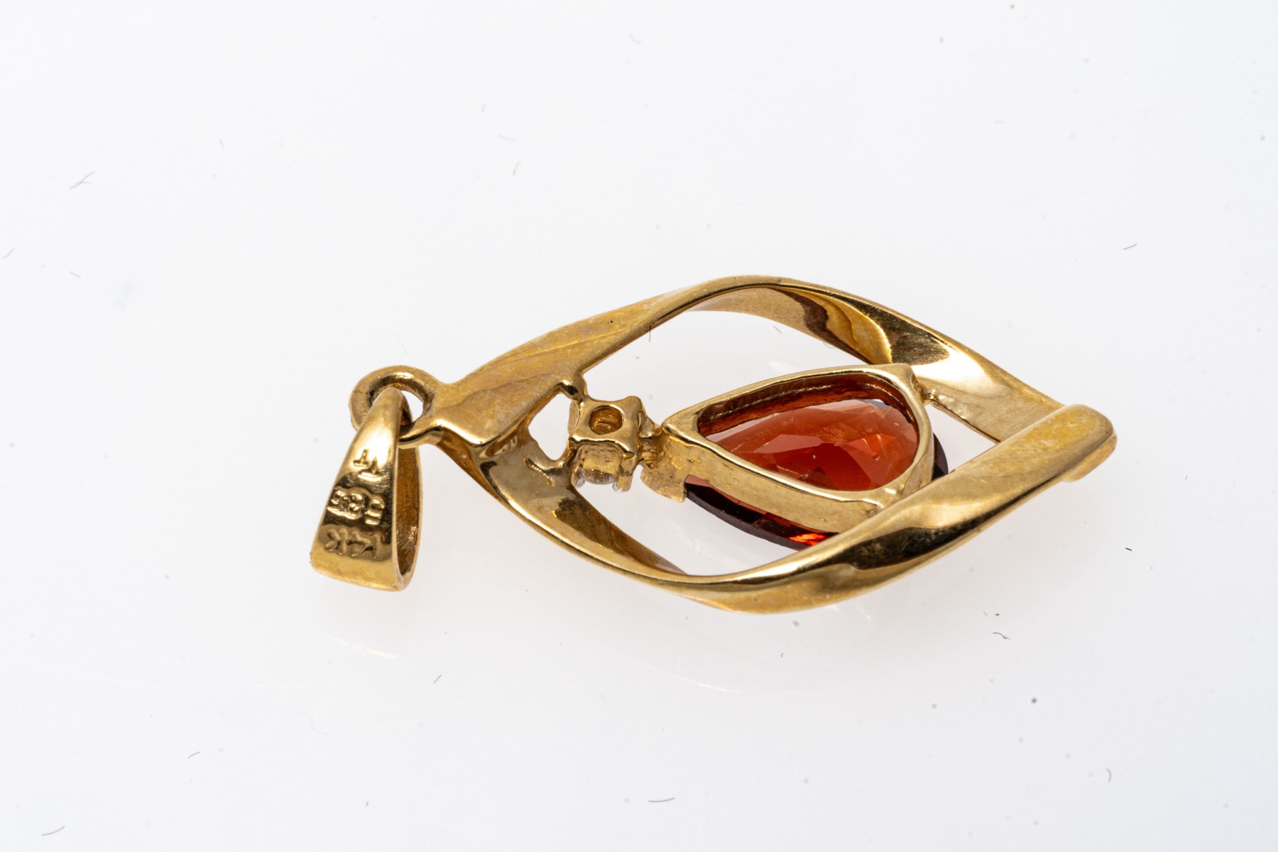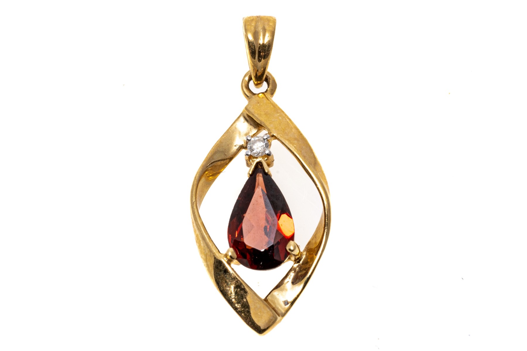 14k yellow gold lovely swirl pendant, featuring a pear shaped garnet, approximately 0.77 CTS, prong set, topped with a round faceted diamond, approximately 0.015 CTS, prong set finished with a ribbed style bale