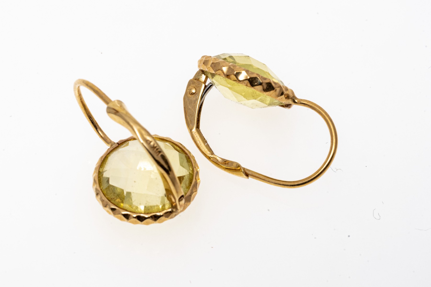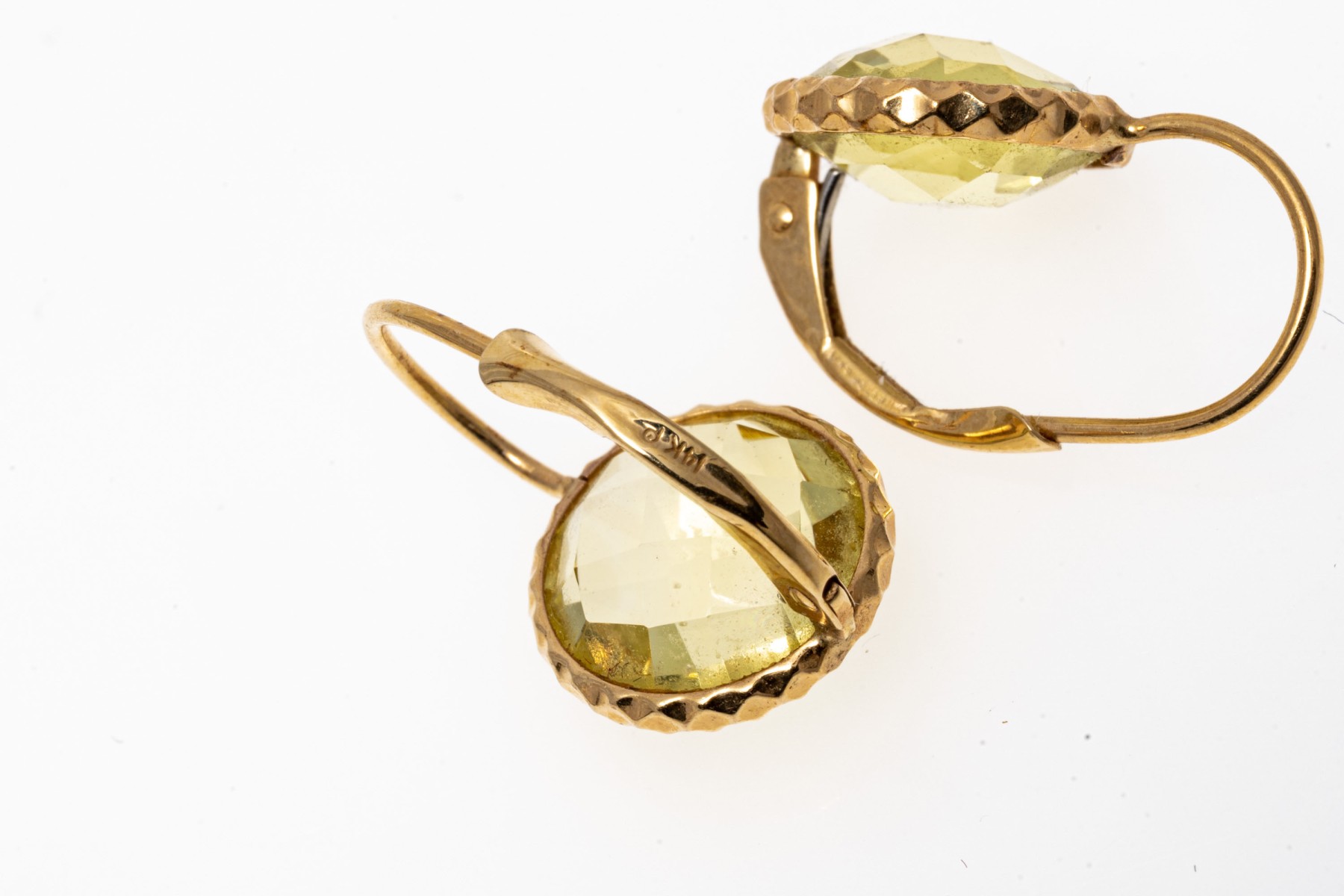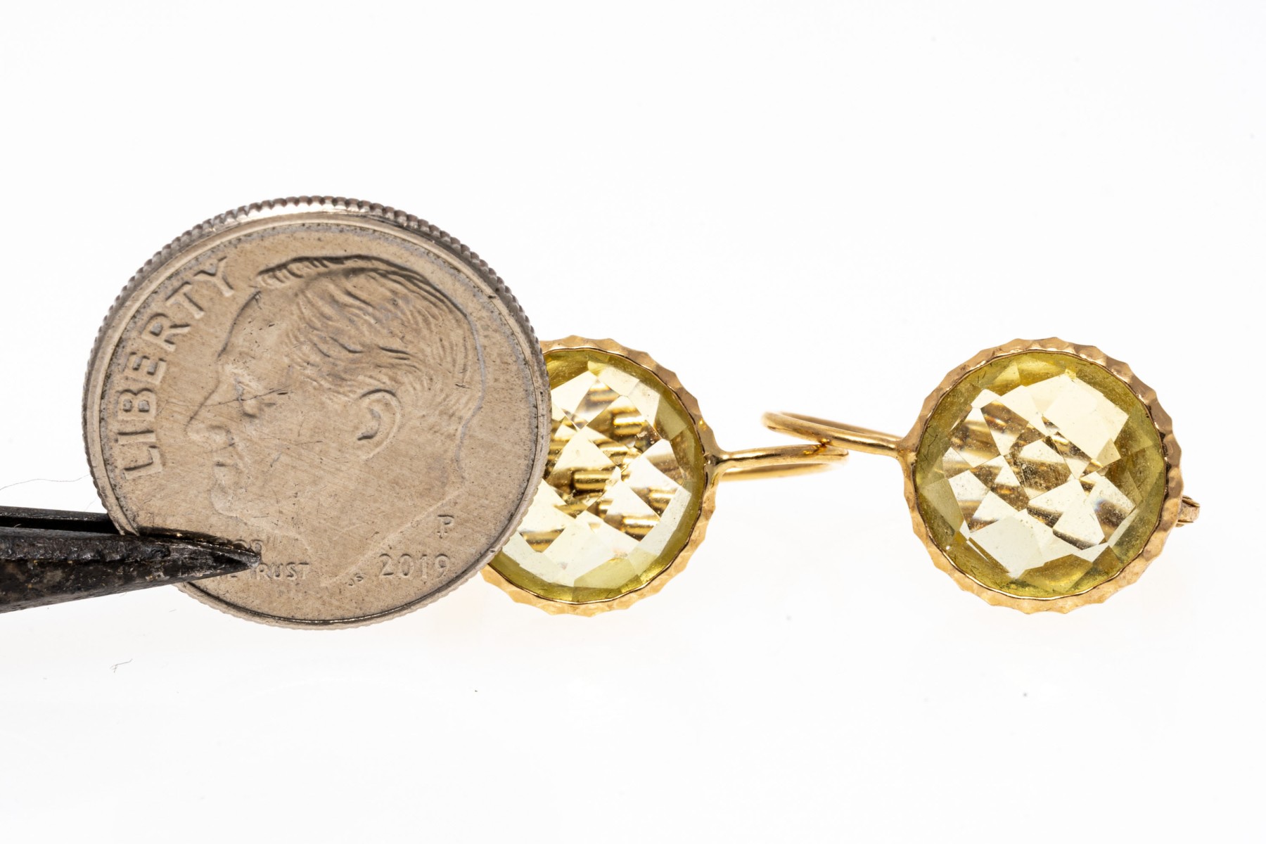 14k yellow gold lovely round checkerboard yellow citrine earrings, approximately 4.26 TCW, bezel set. The earrings are finished with wires with lever style backs