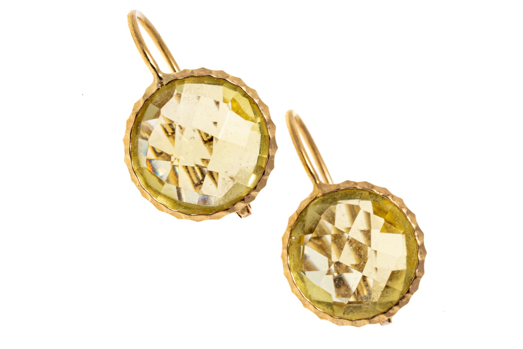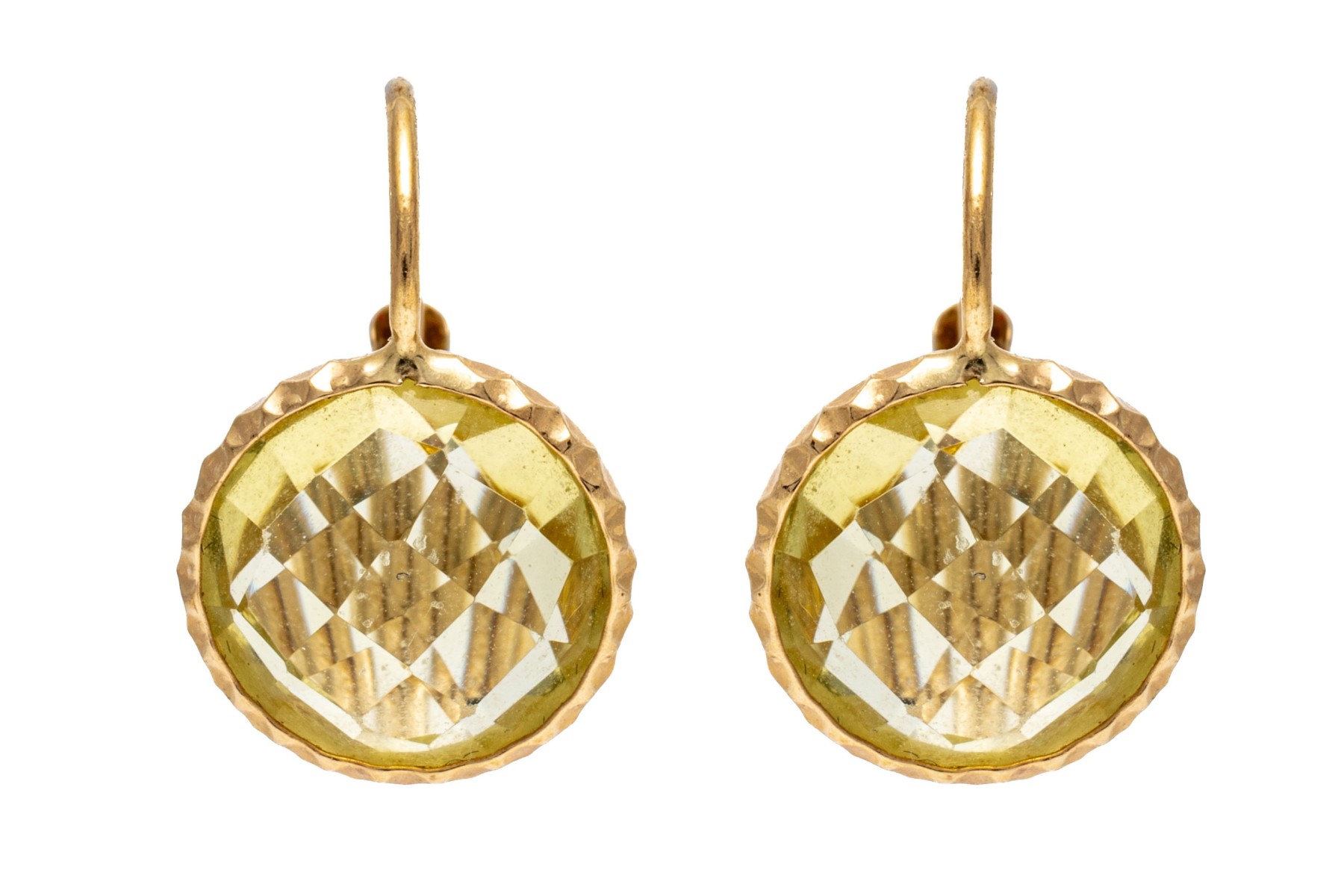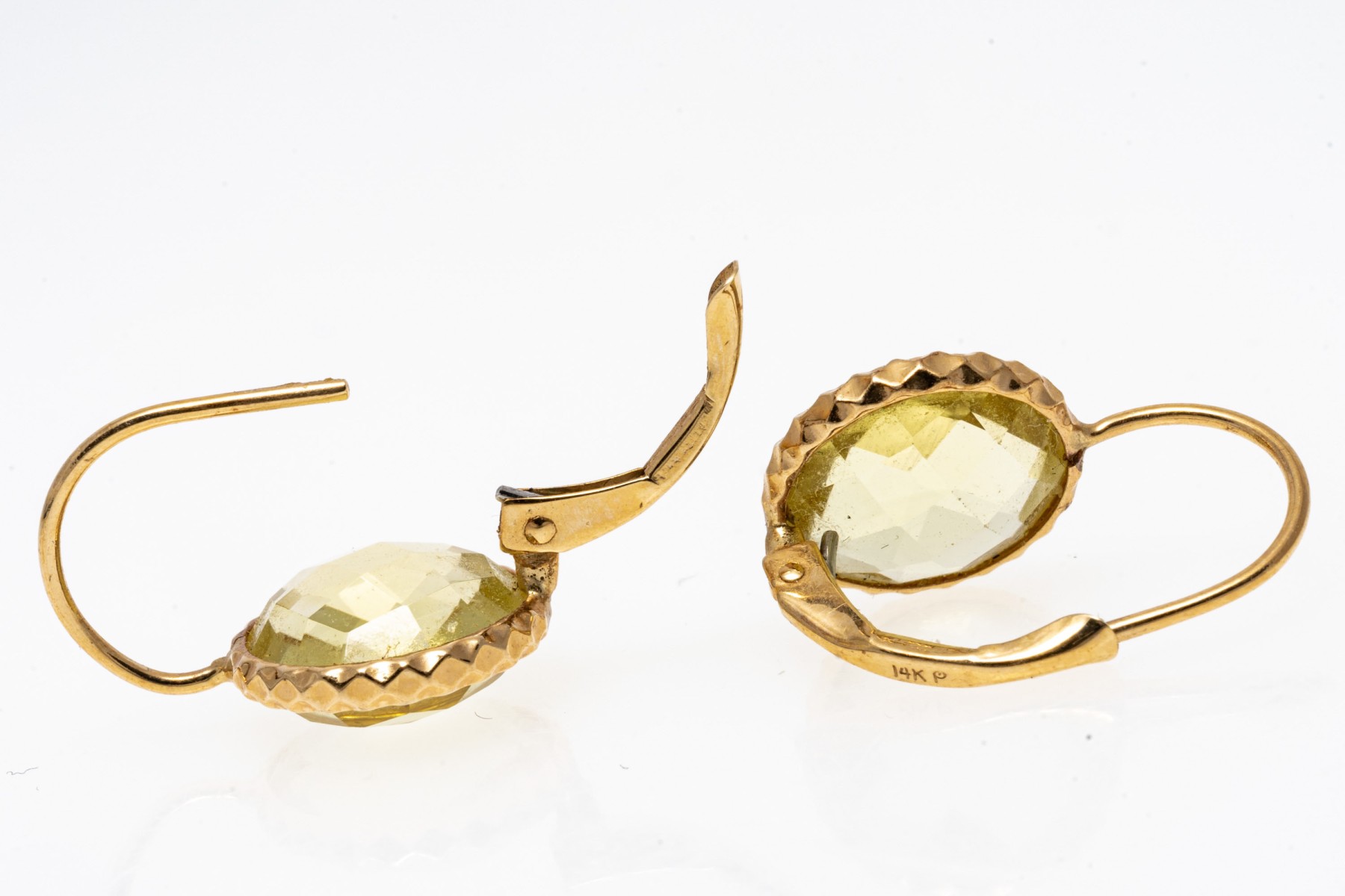 14k yellow gold lovely round checkerboard yellow citrine earrings, approximately 4.26 TCW, bezel set. The earrings are finished with wires with lever style backs
