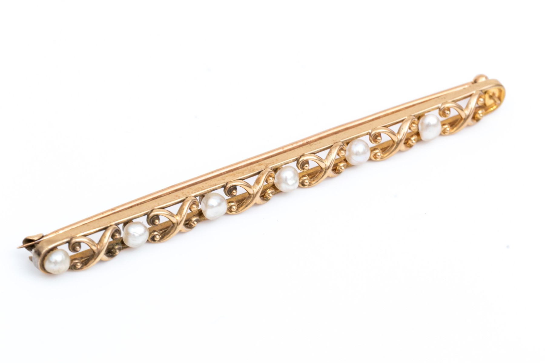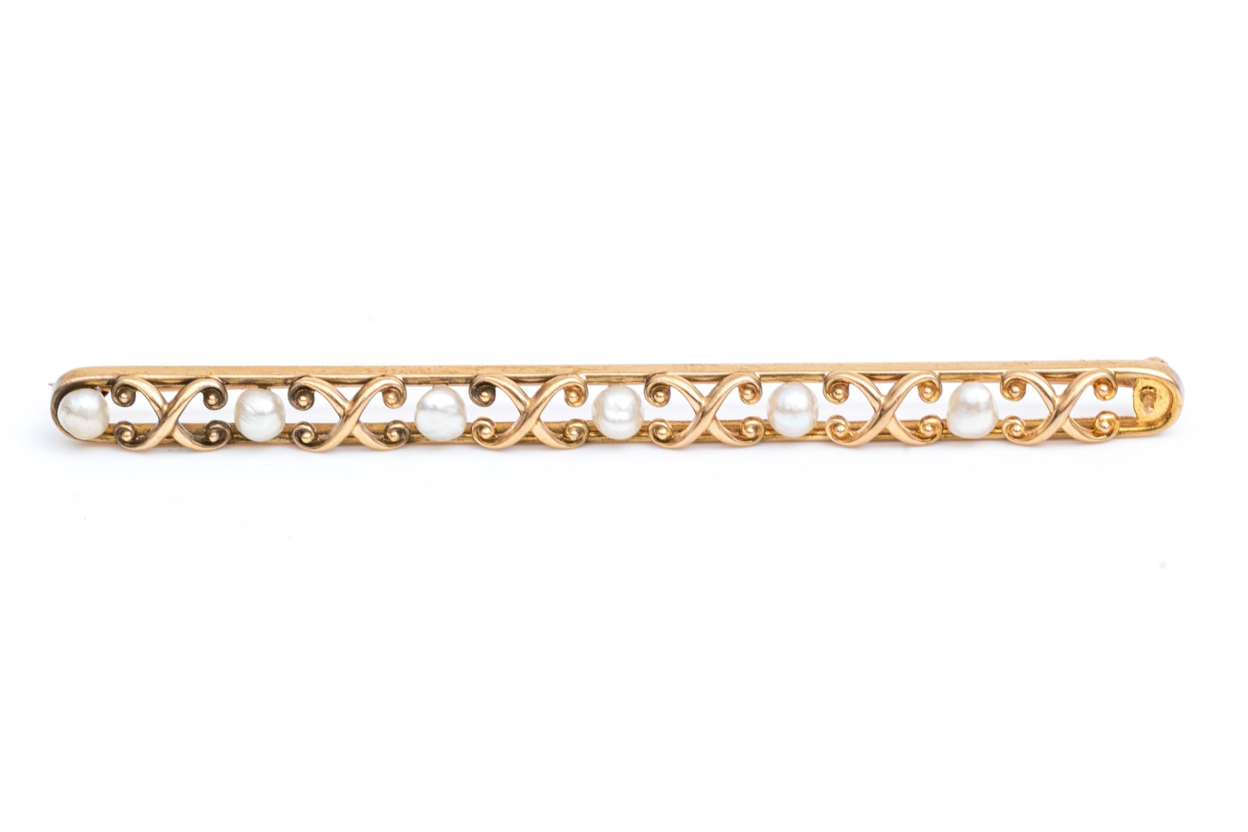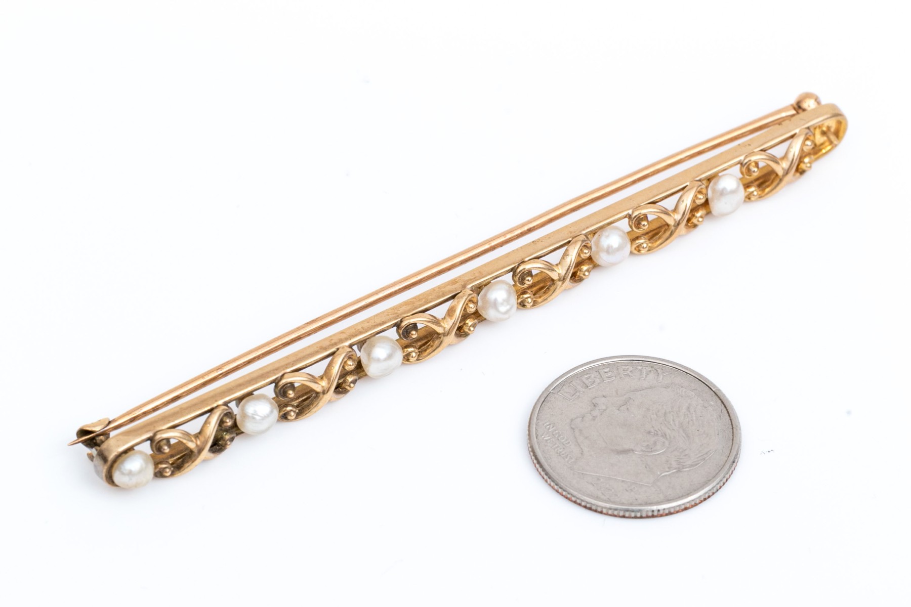 14k yellow gold lovely vintage cultured freshwater pearl and 'X" motif bar pin brooch