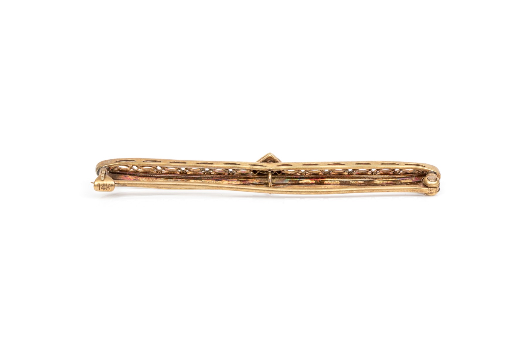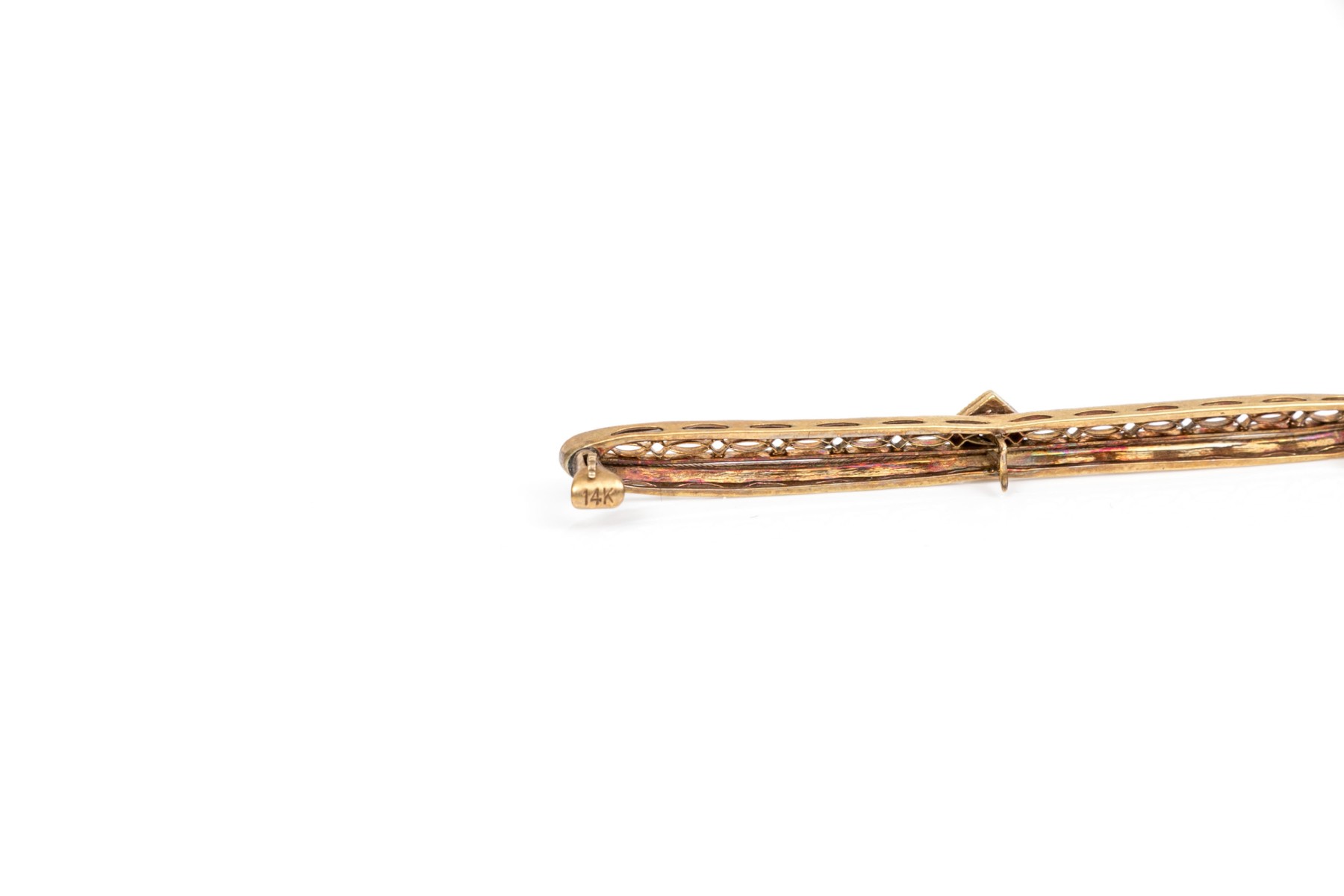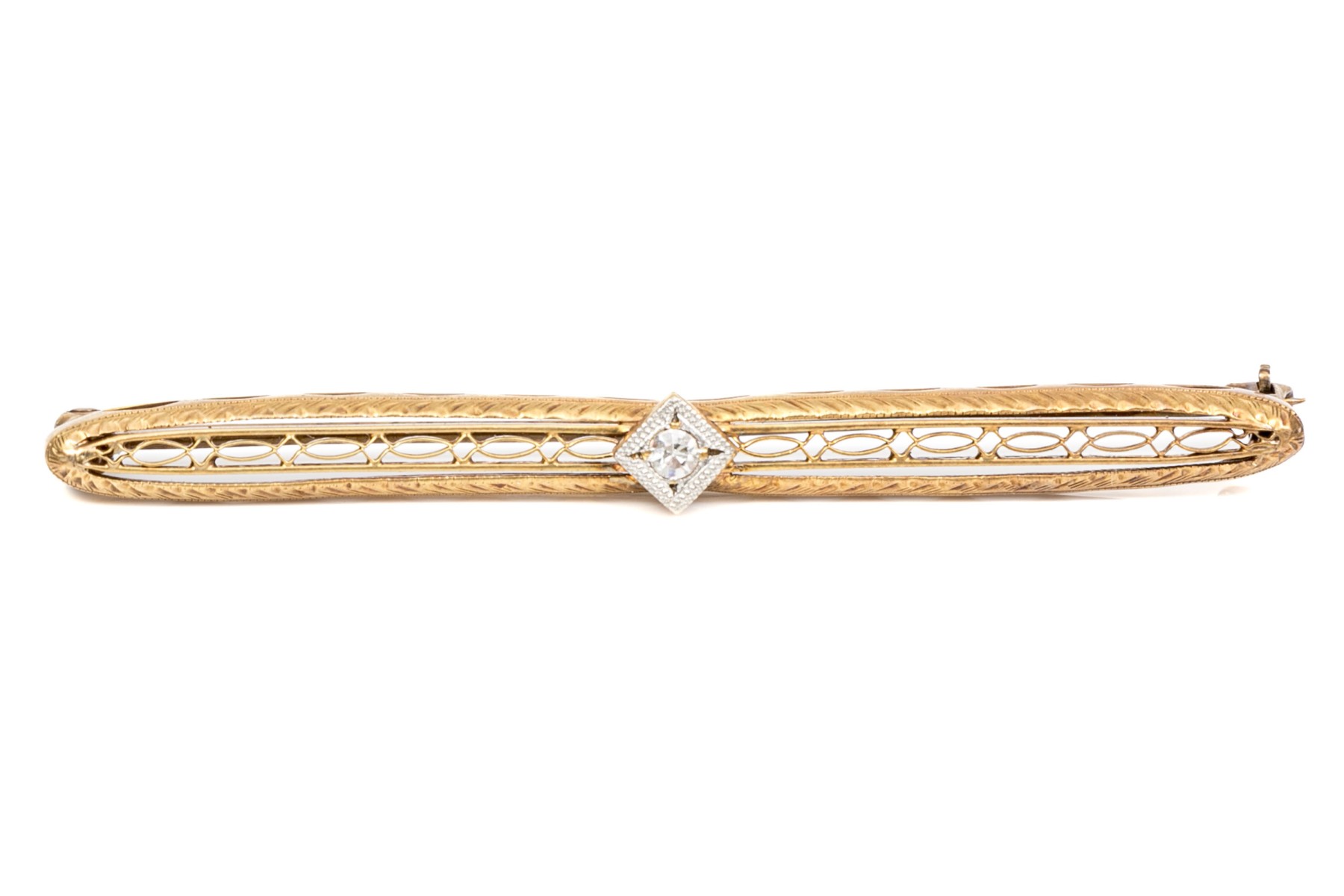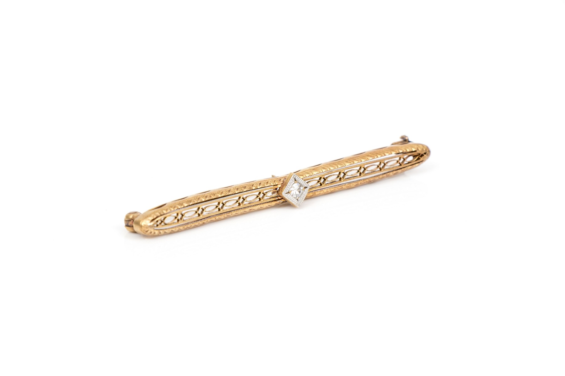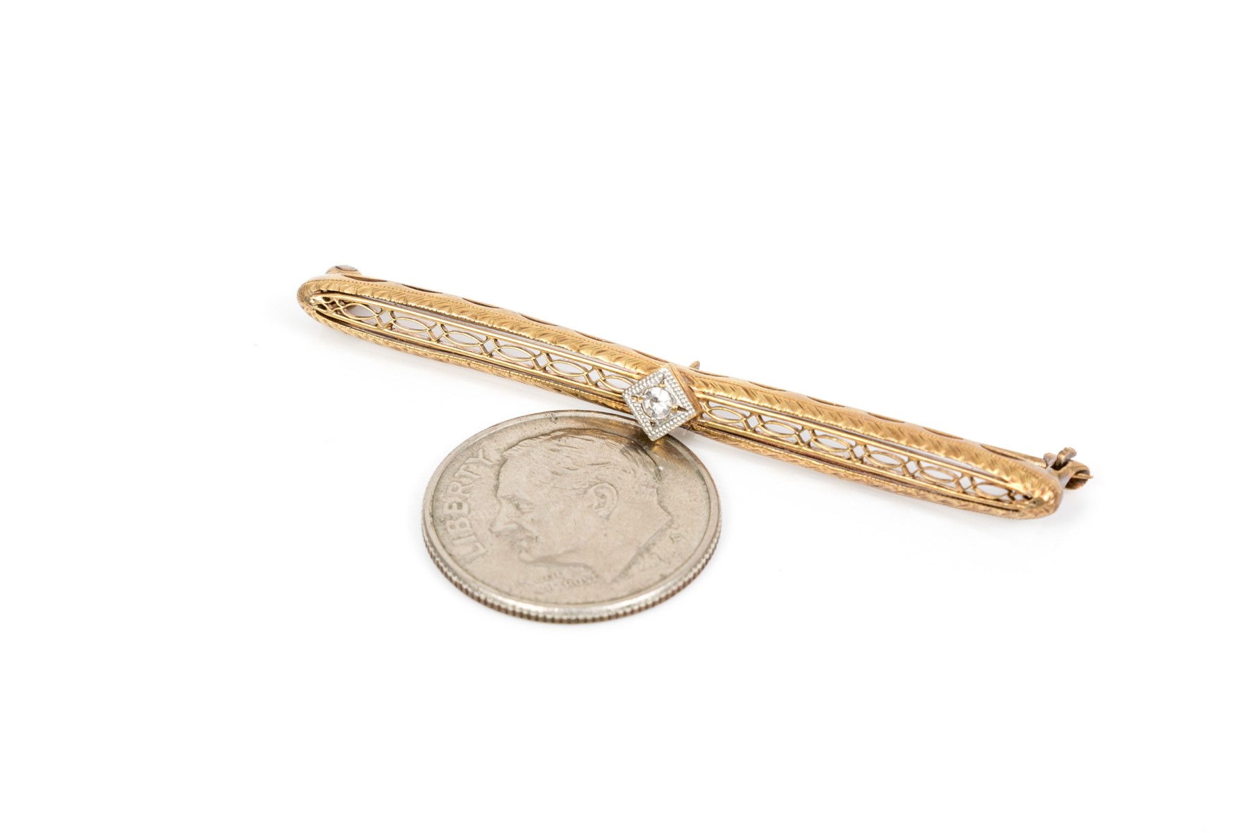 14k yellow gold lovely vintage filagree bar pin, with center diamond, app. 0.02 CTS, prong set