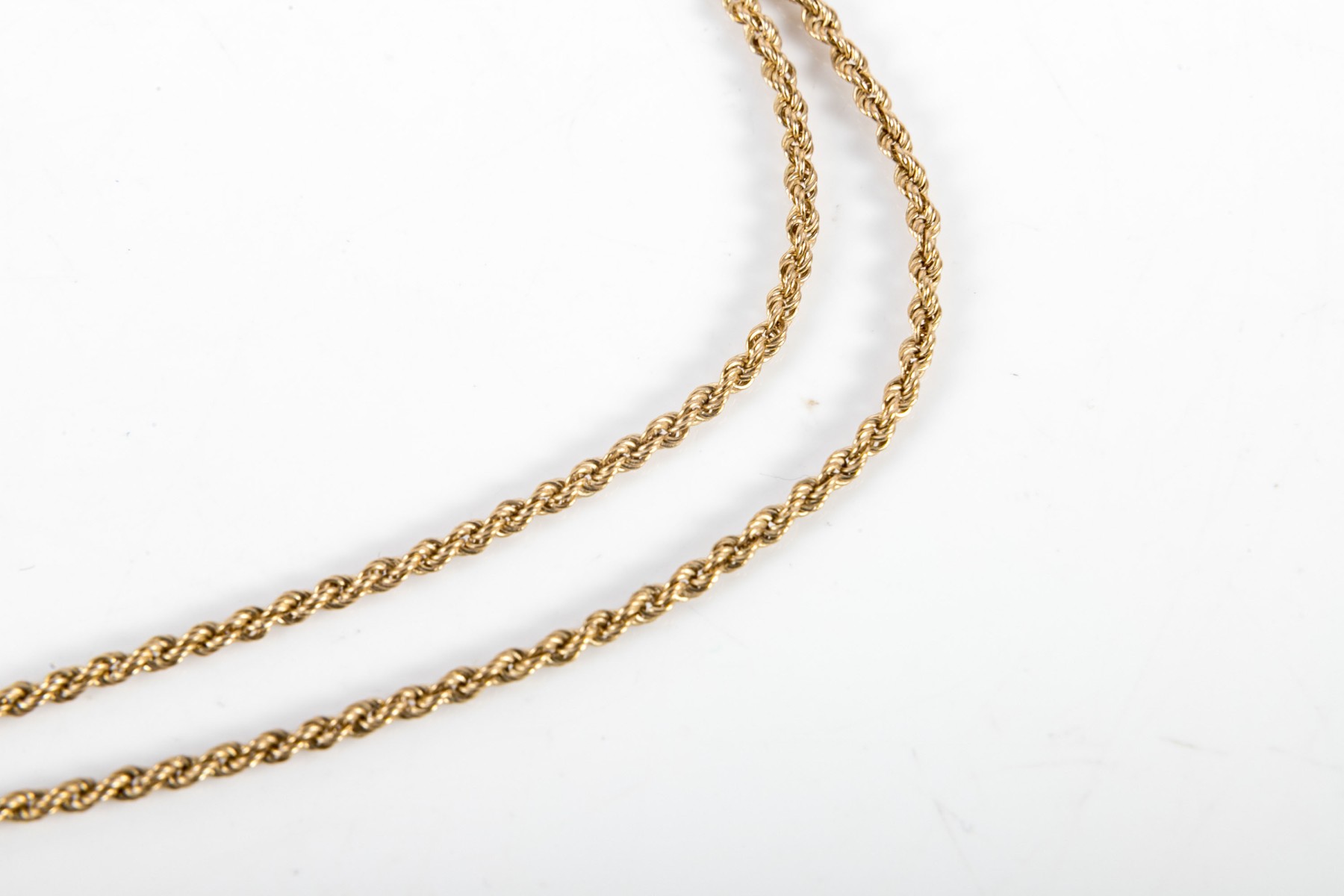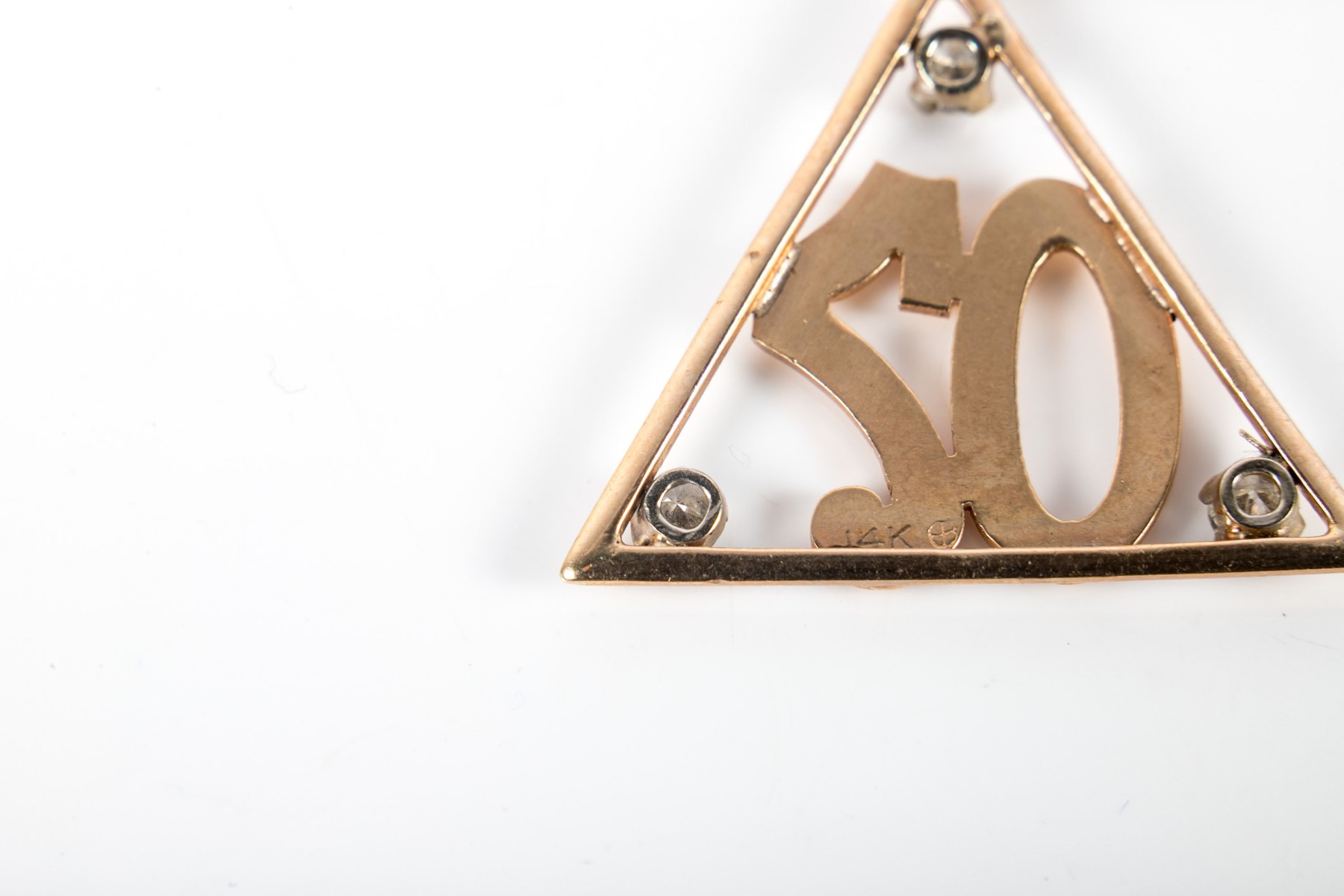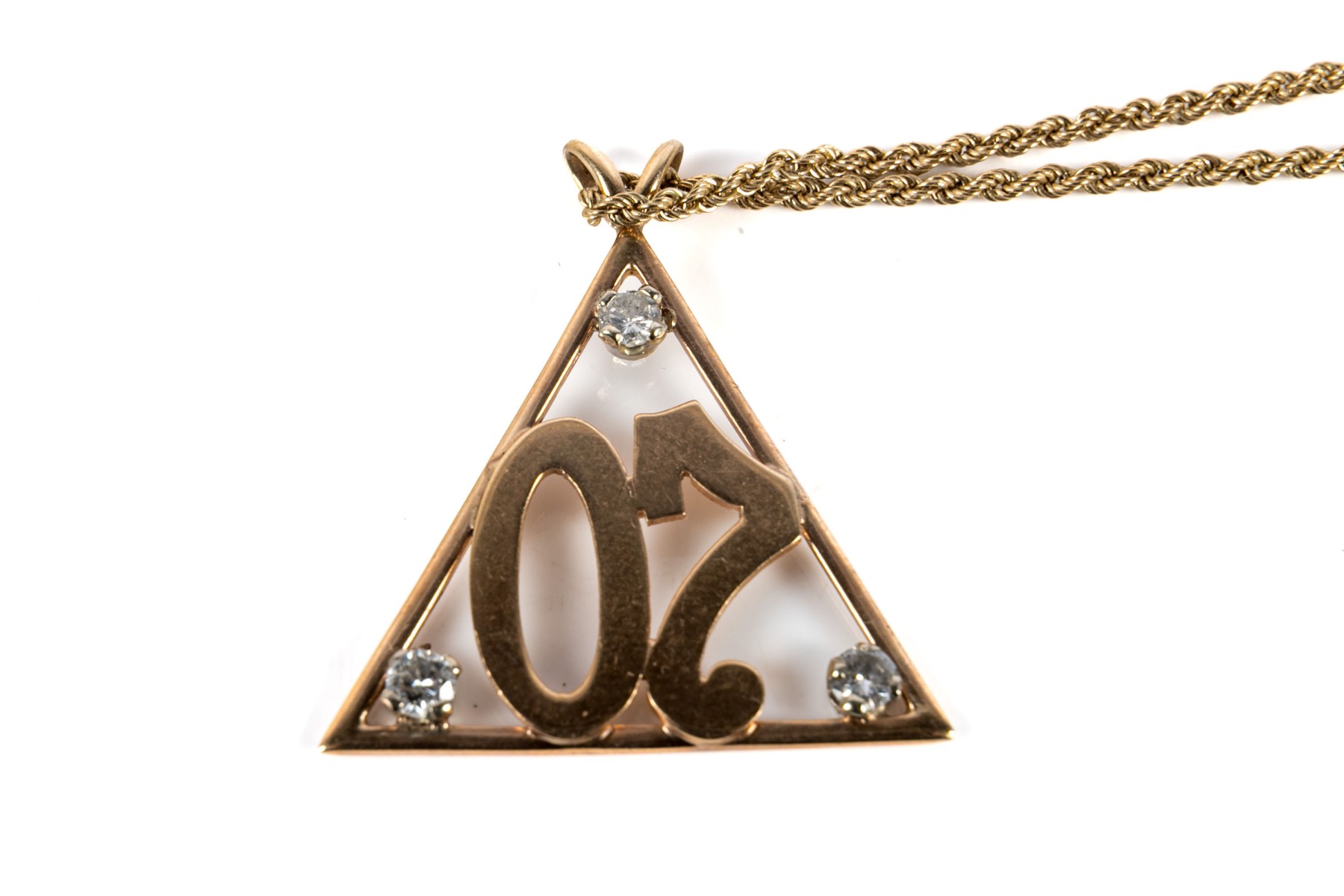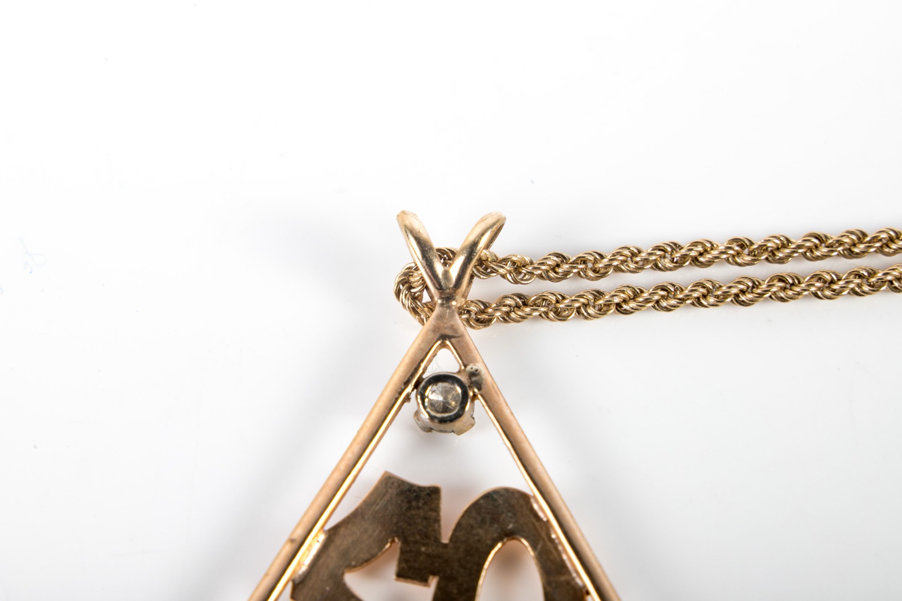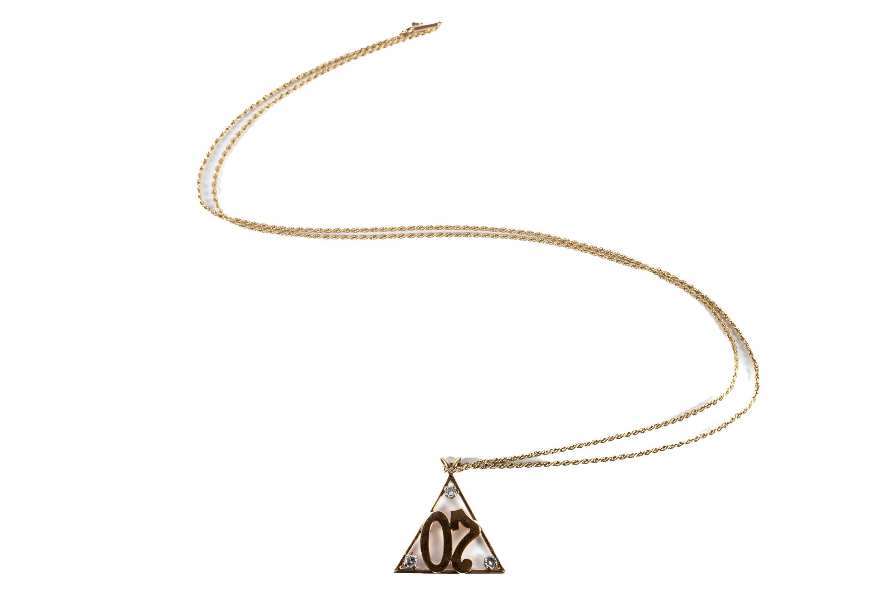 A yellow gold necklace displaying a triangular pendant with three round moissanites around an "07" motif, hanging from a sturdy and long rope chain.