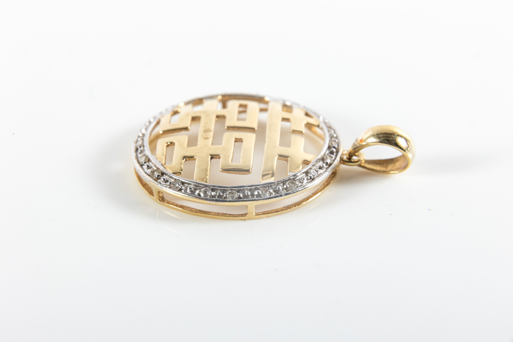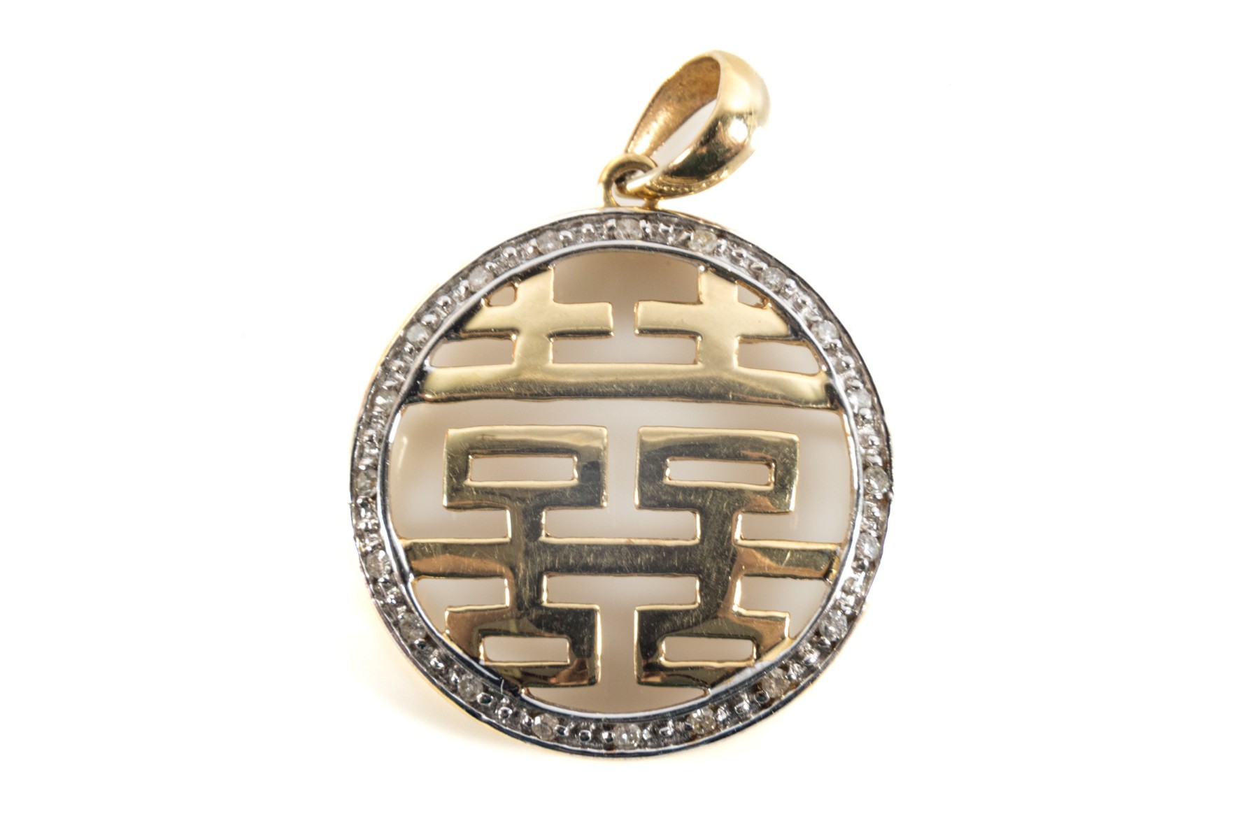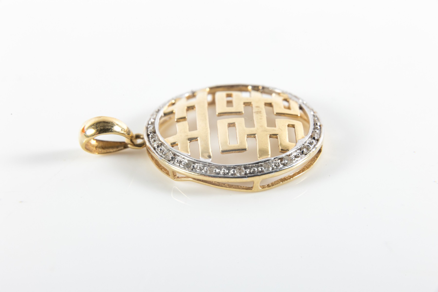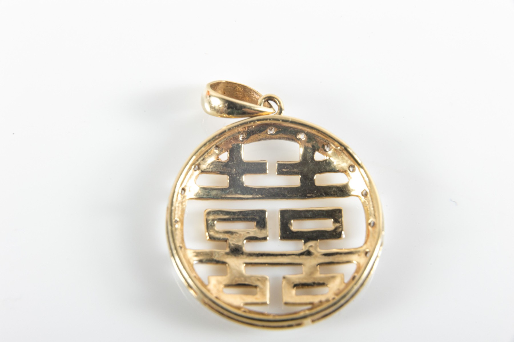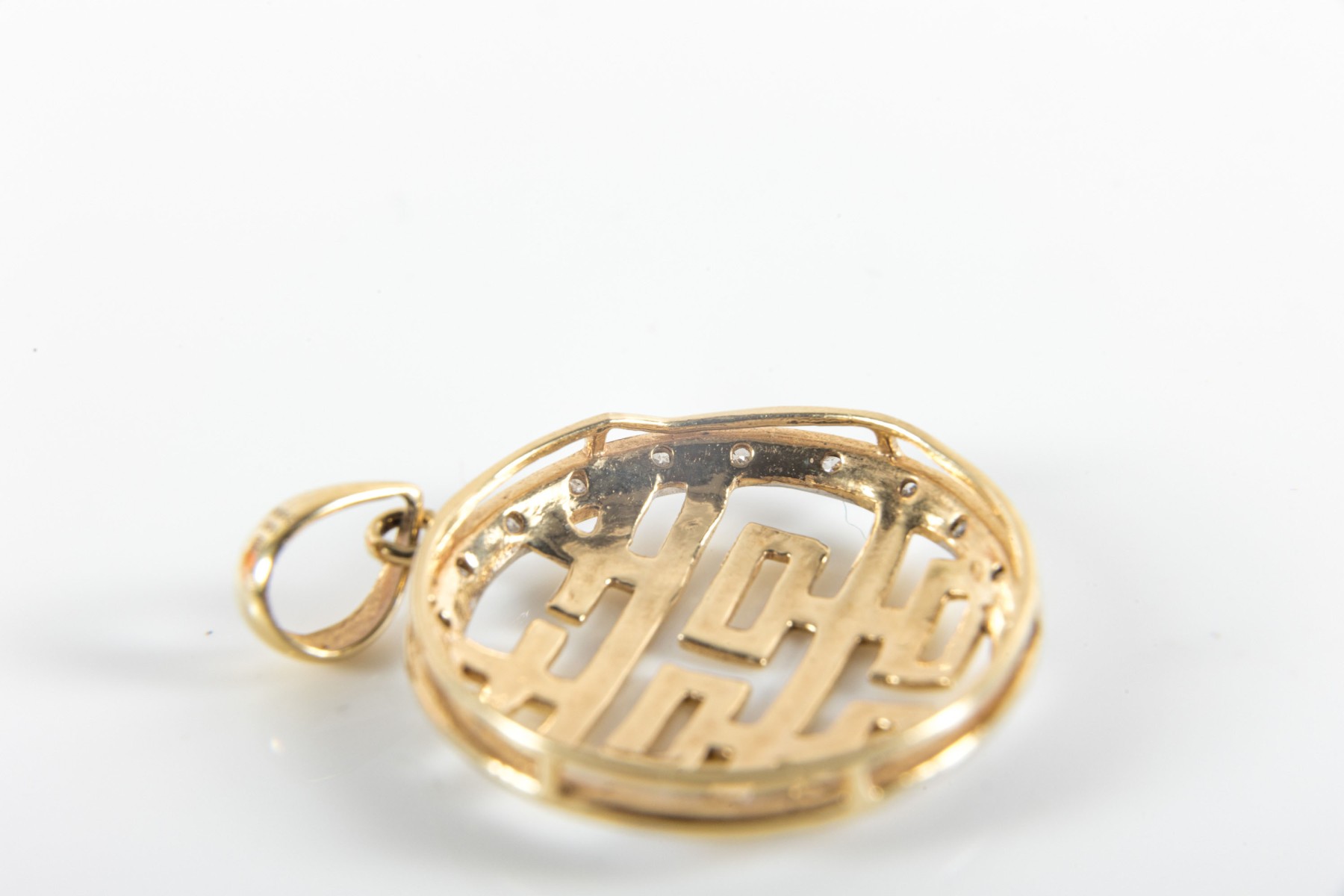 A small 14K yellow gold Chinese double Happiness symbol pendant charm embellished with moissanite stones.