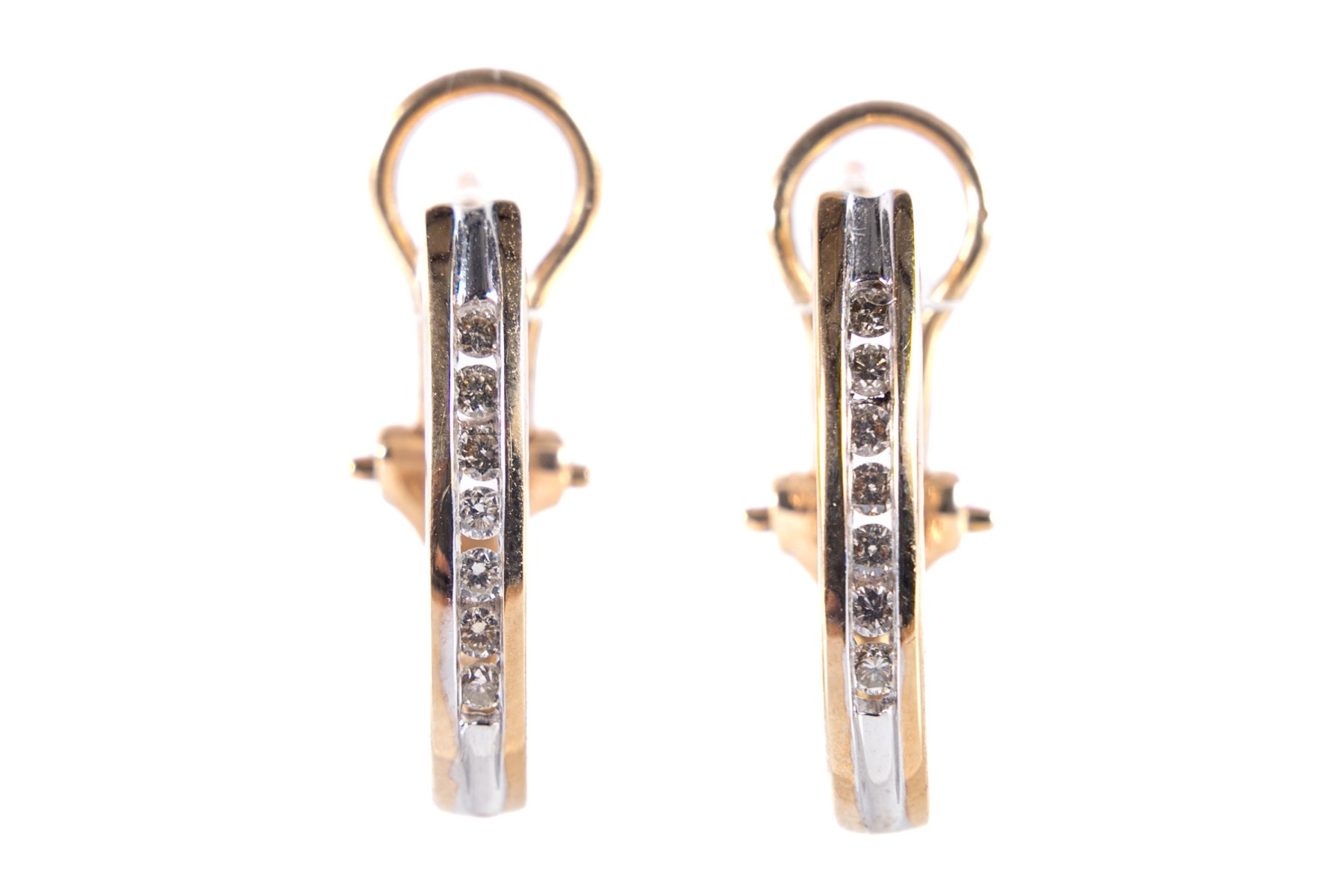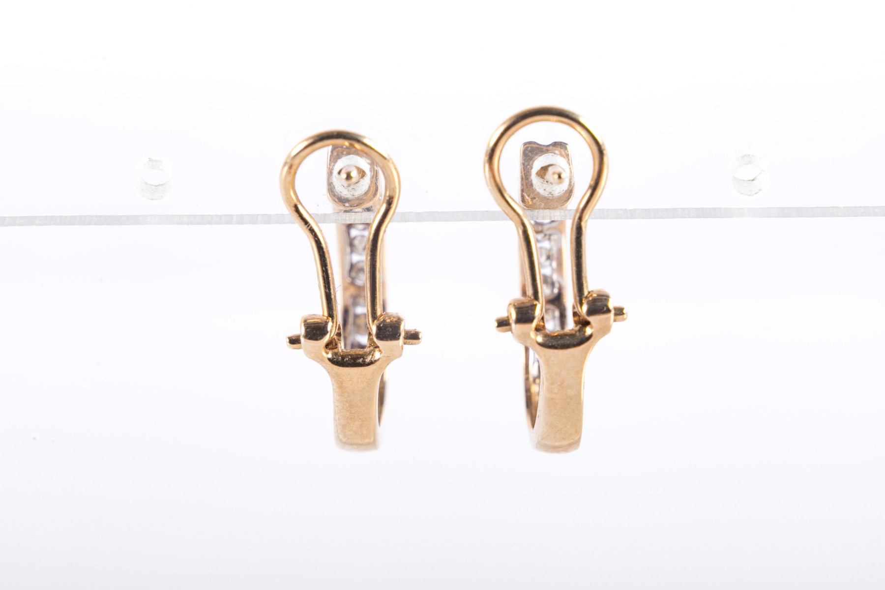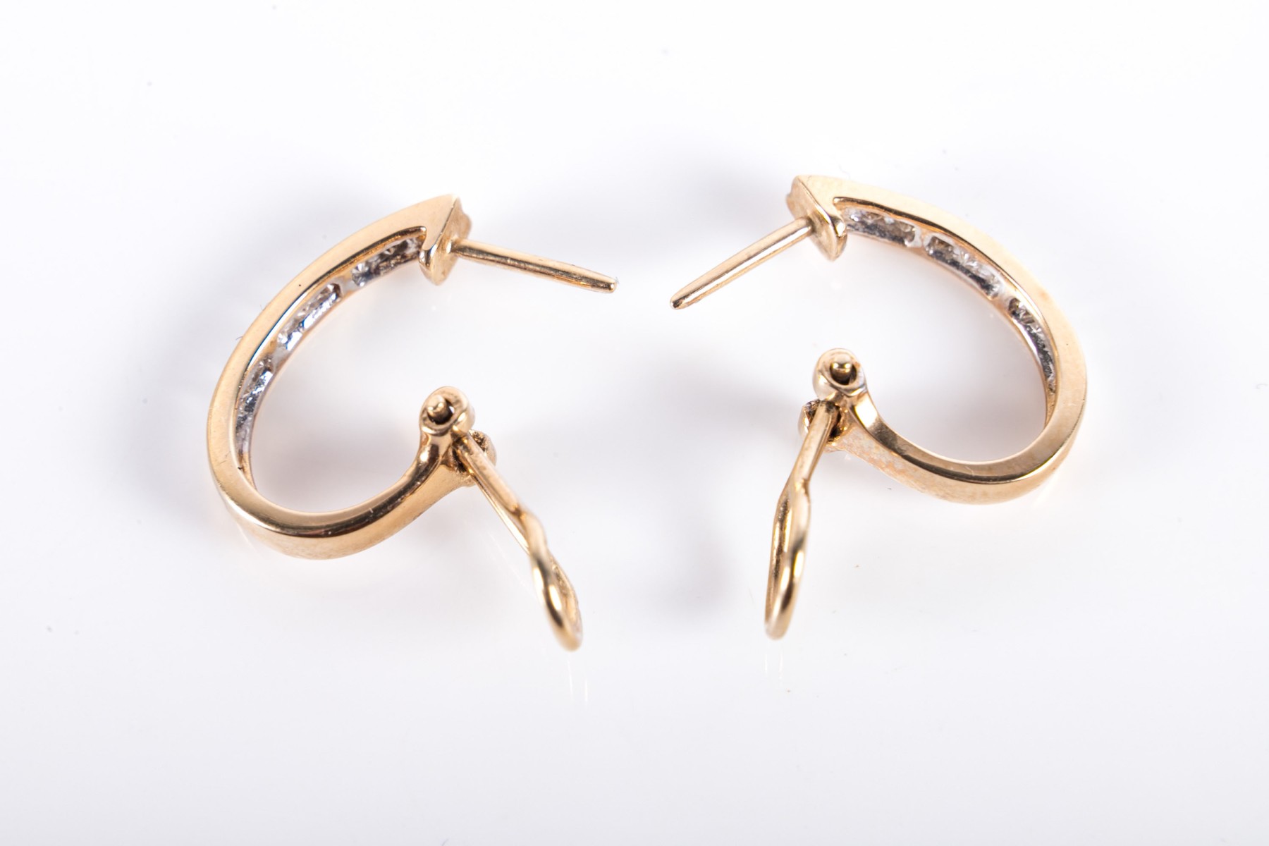 A classy pair of yellow gold J-curve hoop earrings displaying channels of white round moissanites.