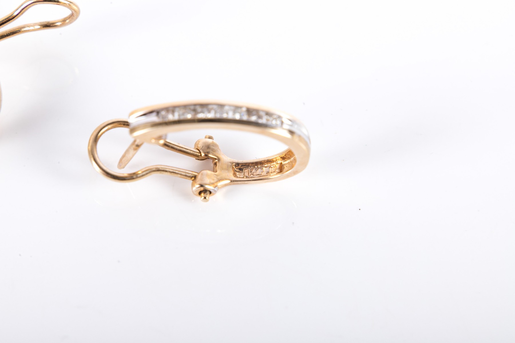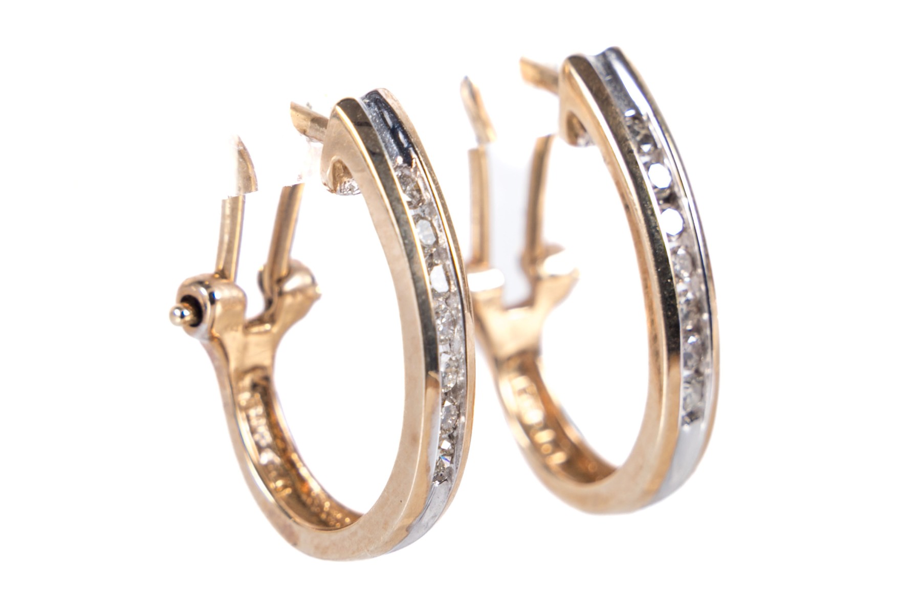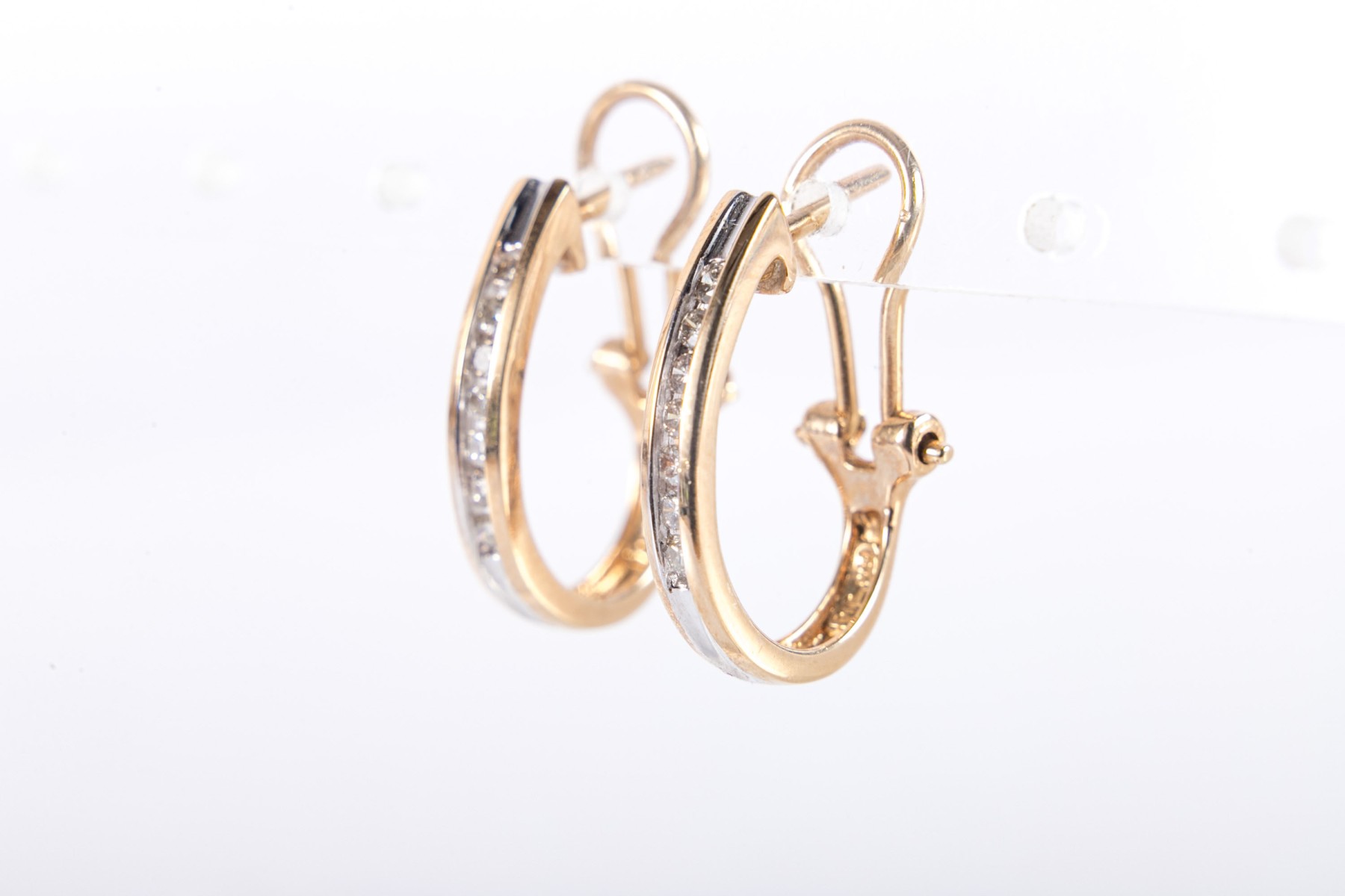 A classy pair of yellow gold J-curve hoop earrings displaying channels of white round moissanites.