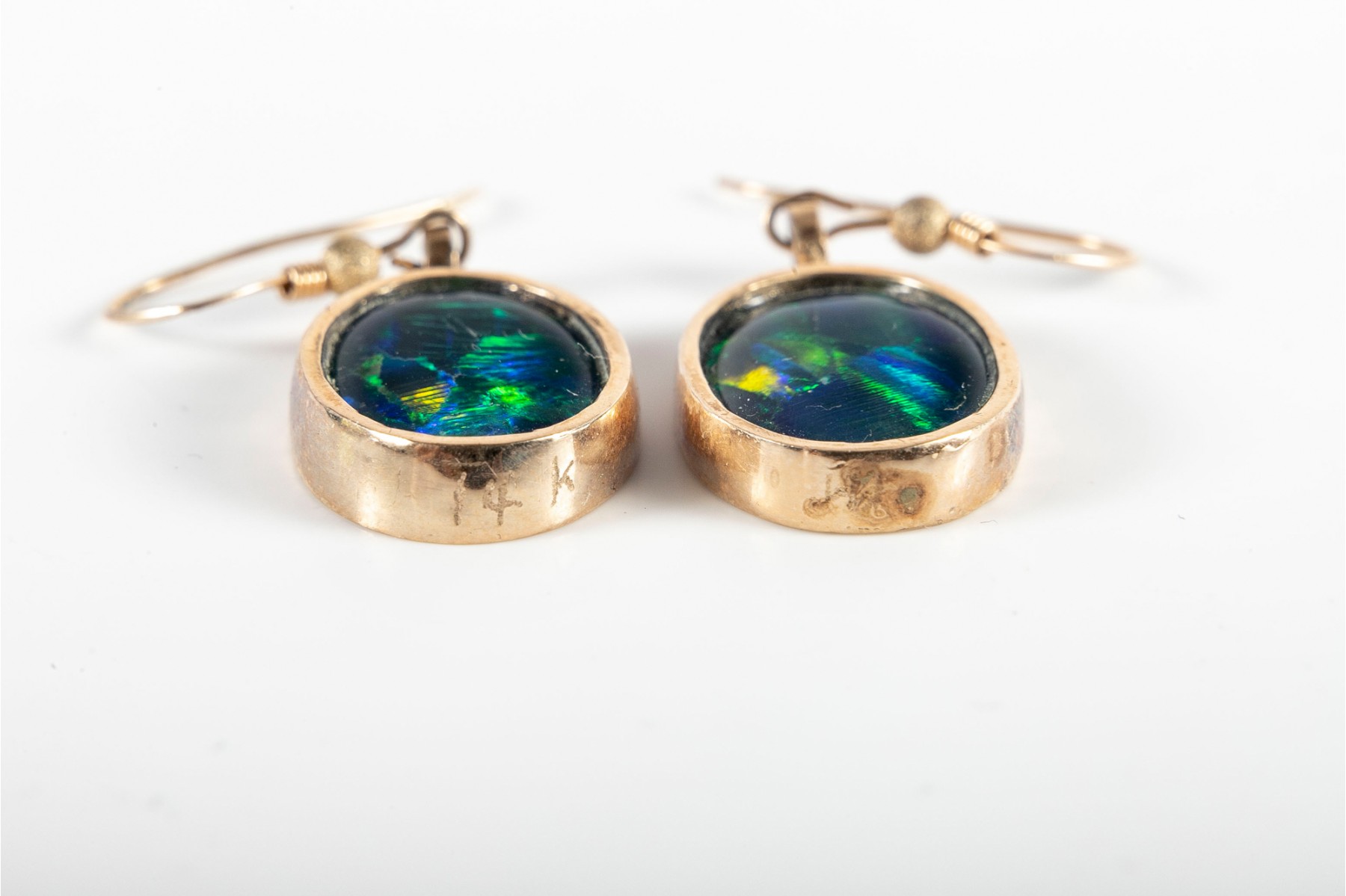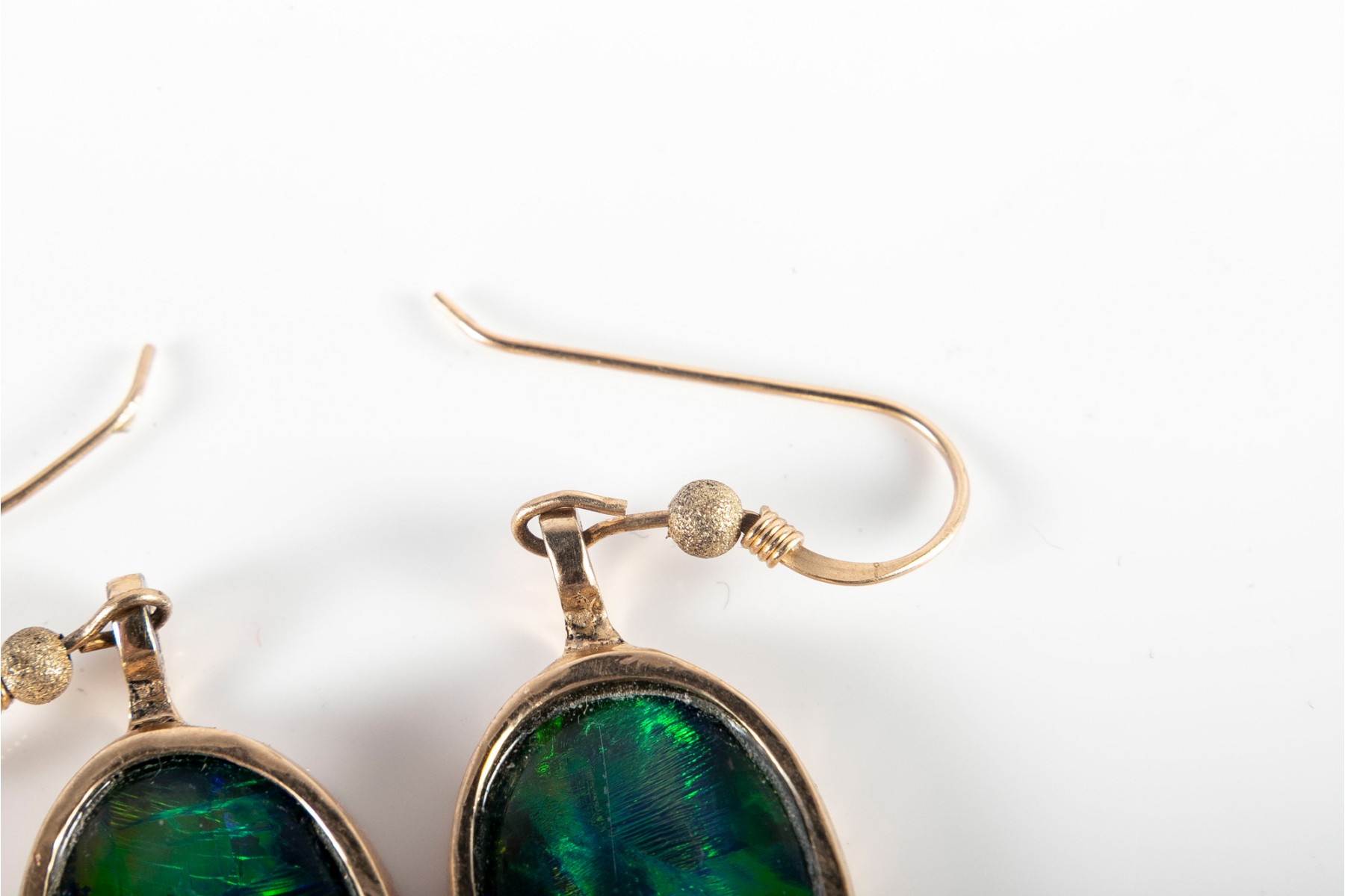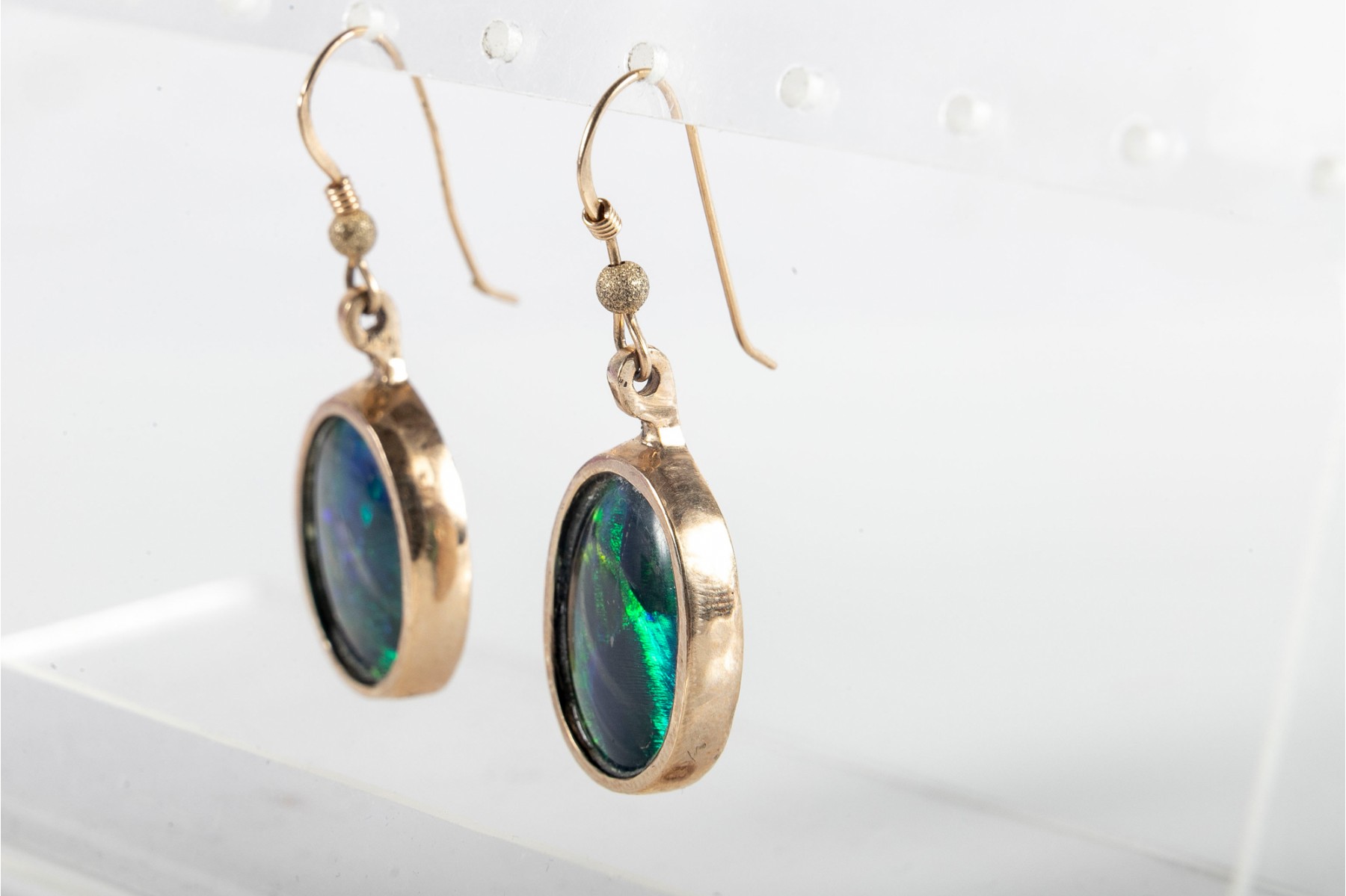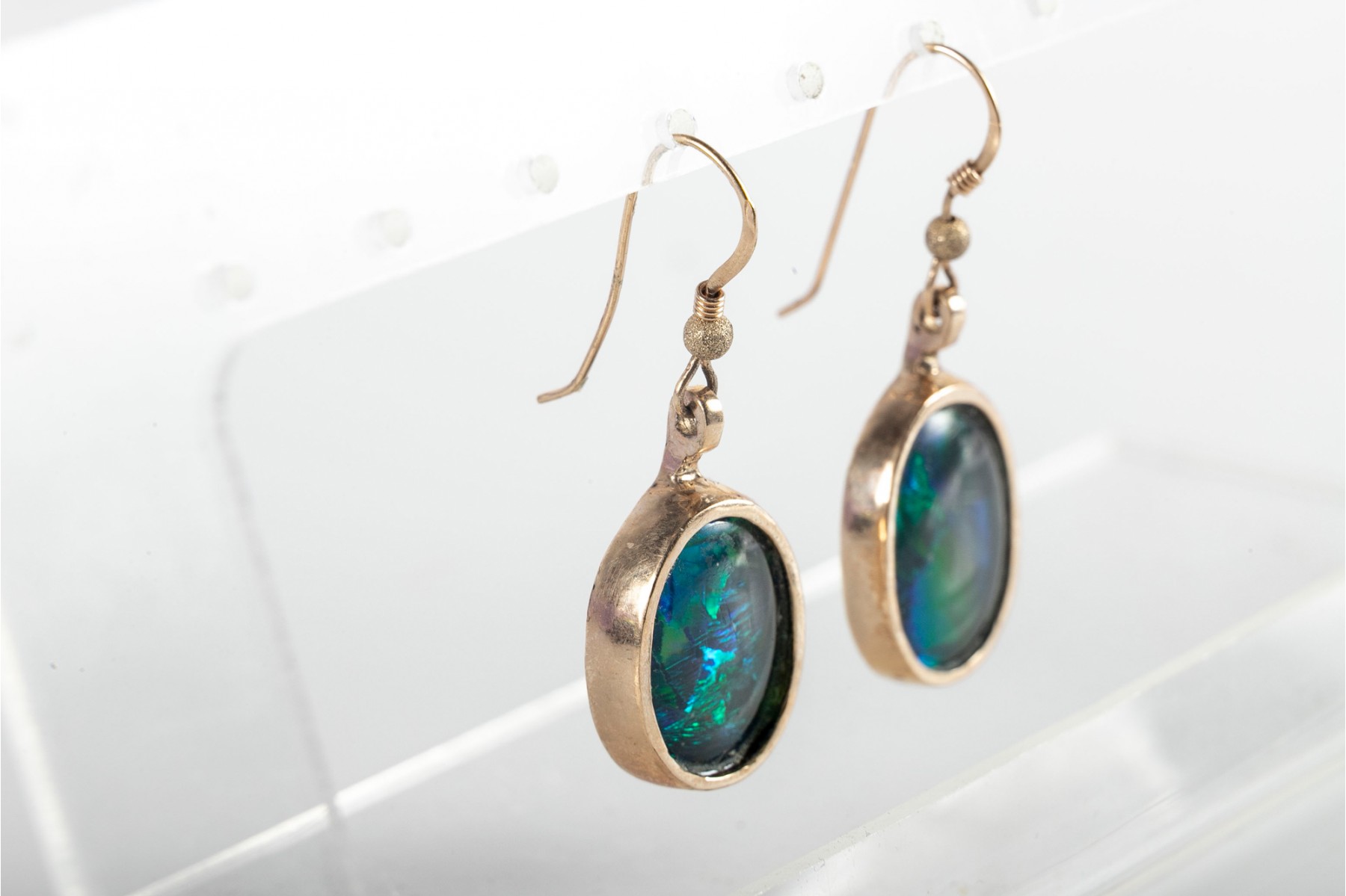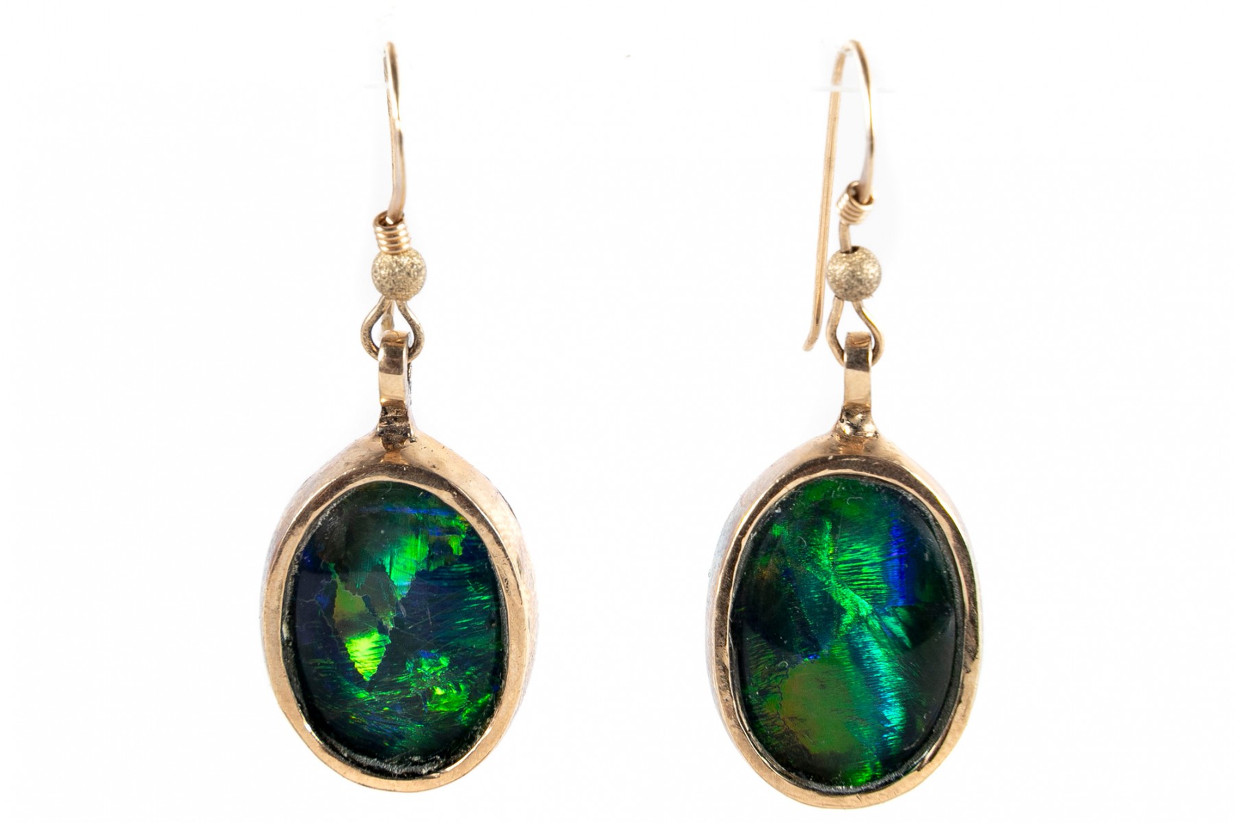 A pretty pair of yellow gold dangle earrings displaying oval opalite in iridescent yellow and green.