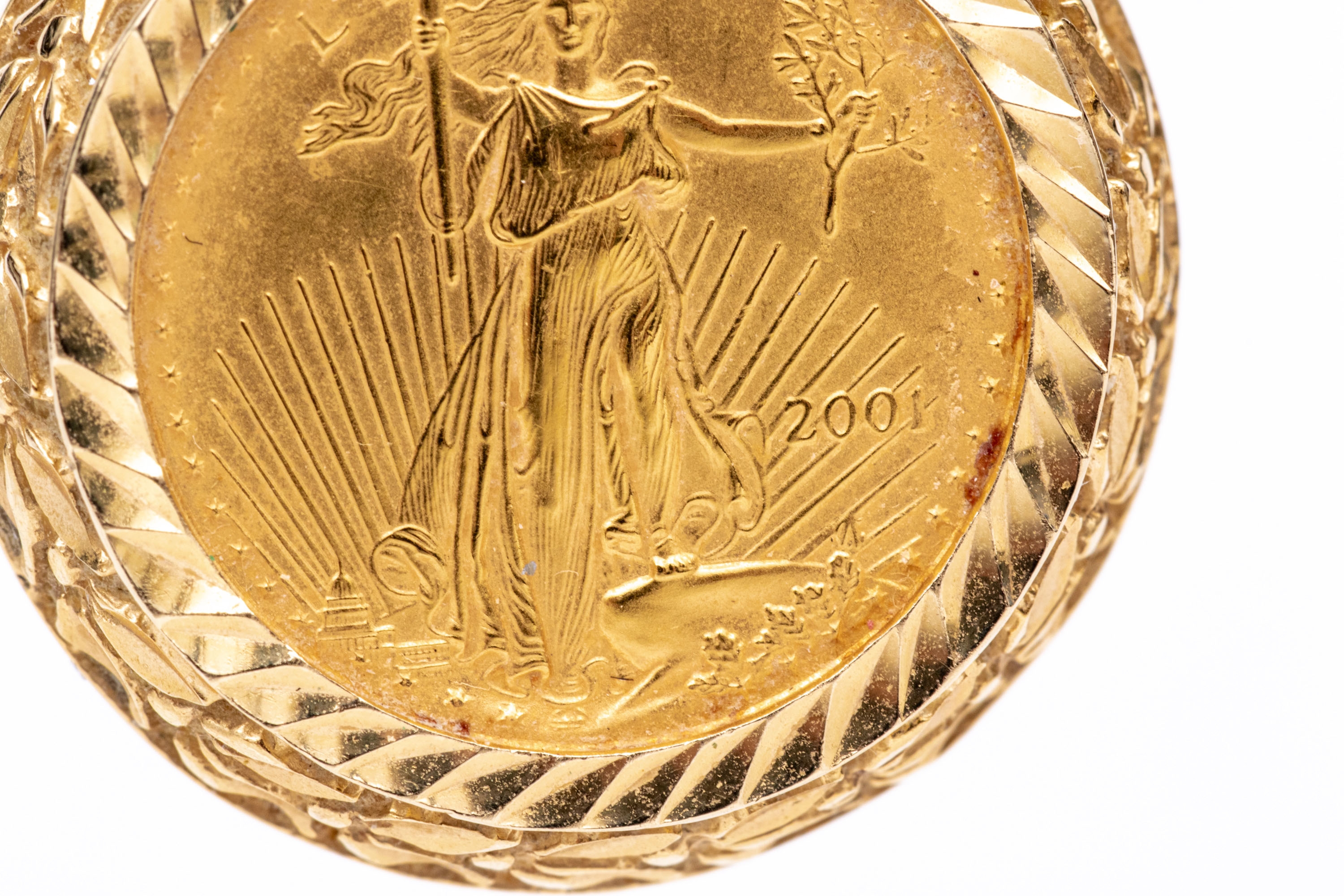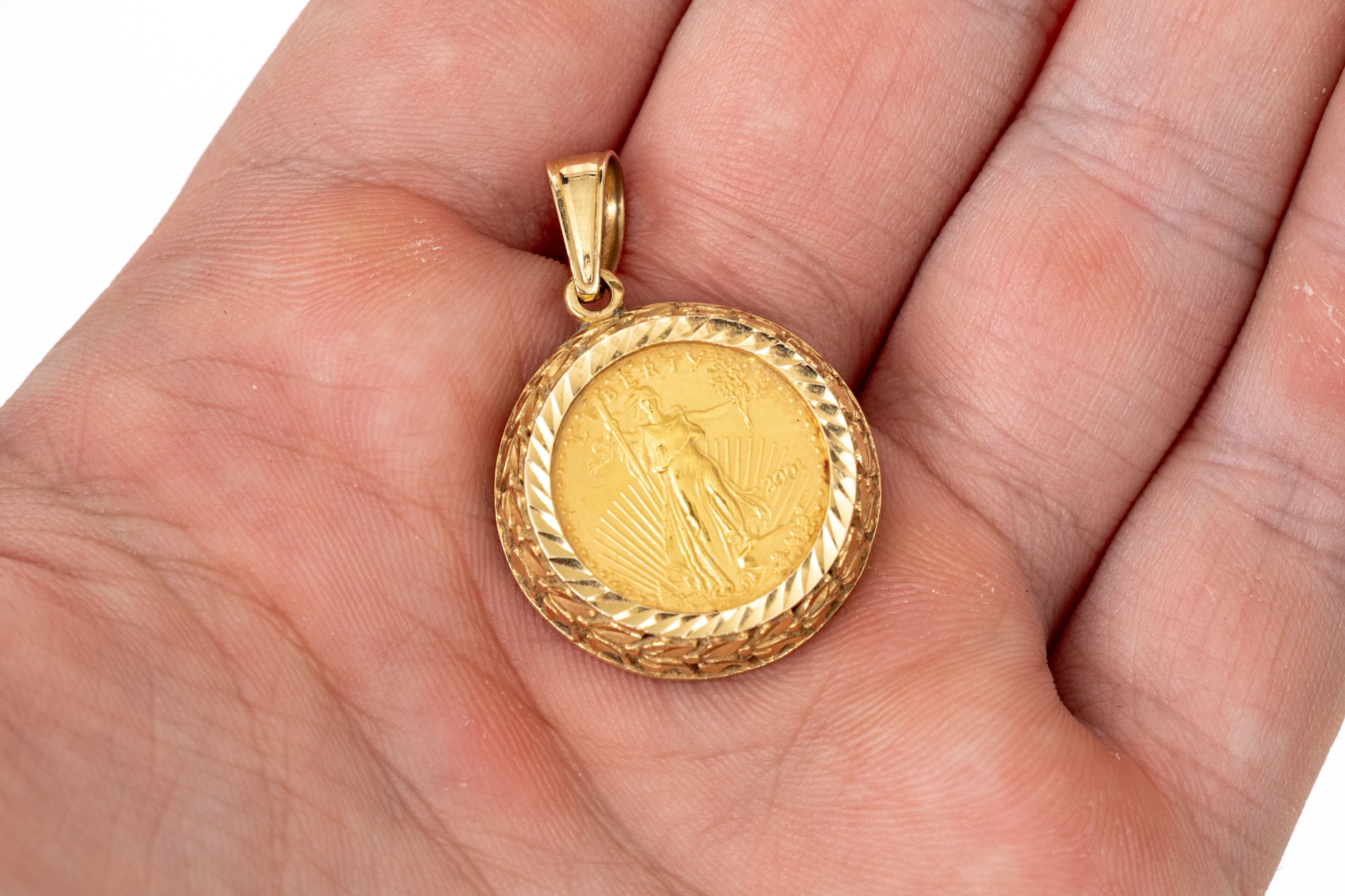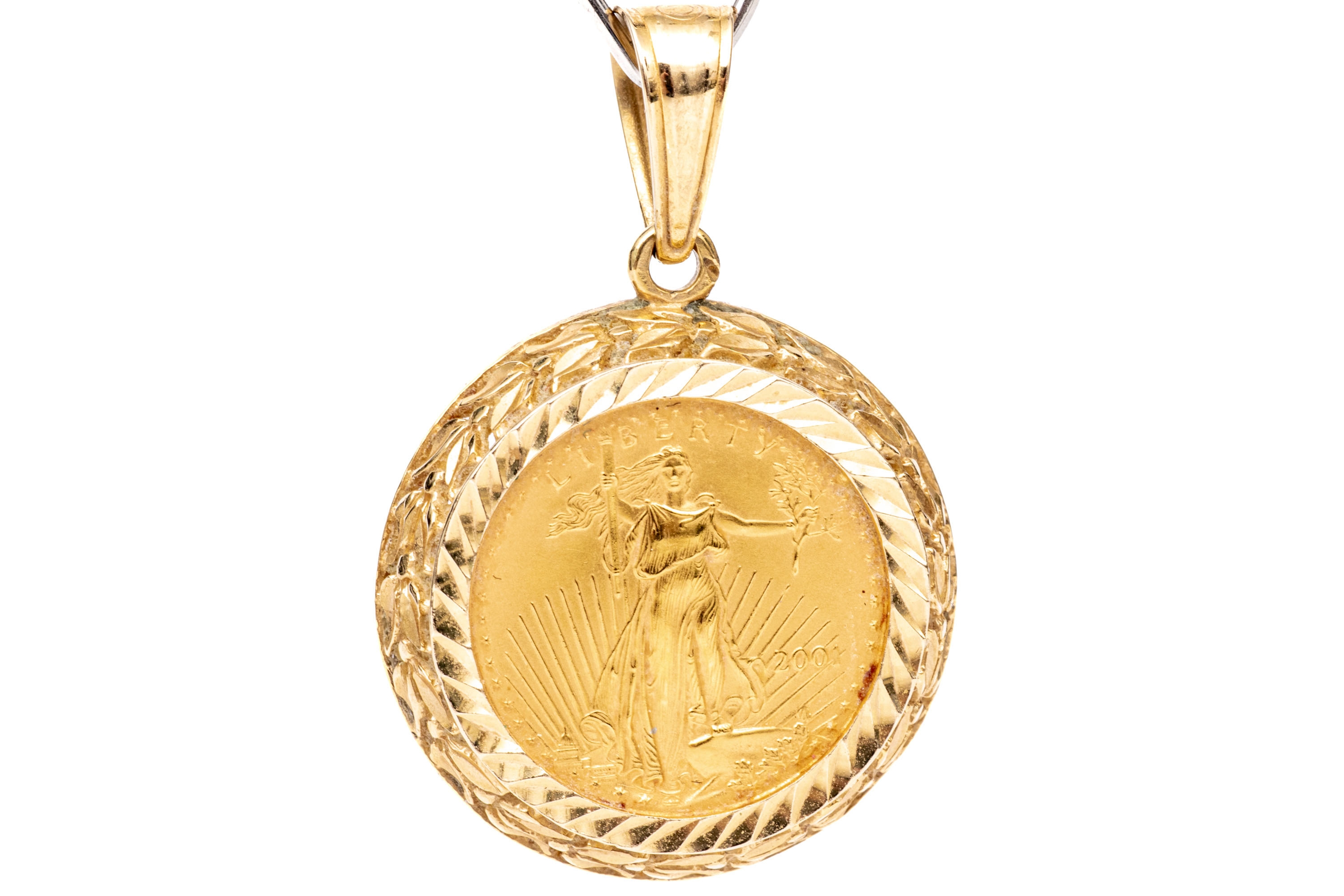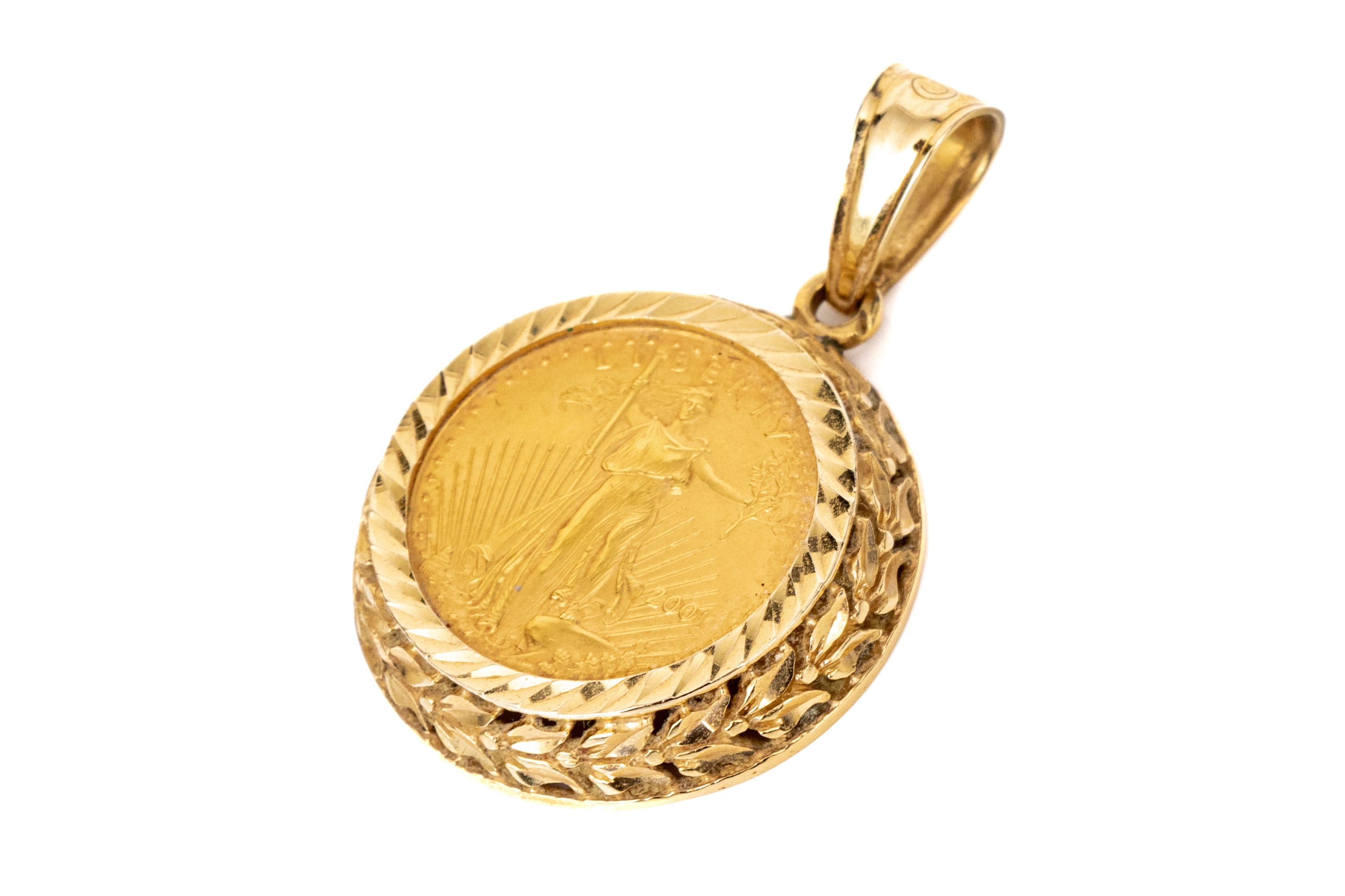 14k yellow gold ornate coin holder pendant with a 2001 $5 American gold eagle coin, finished with a ribbed style bale