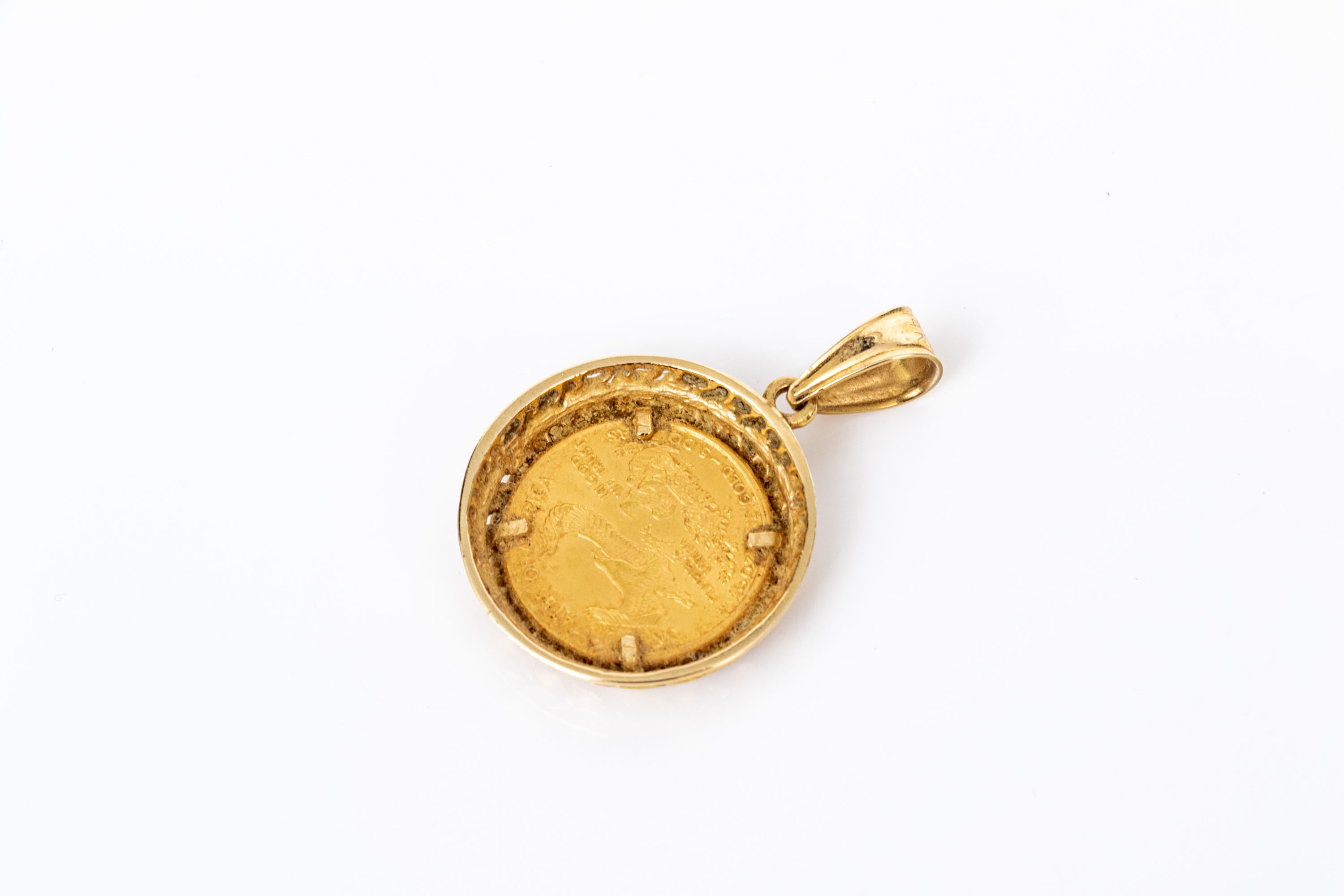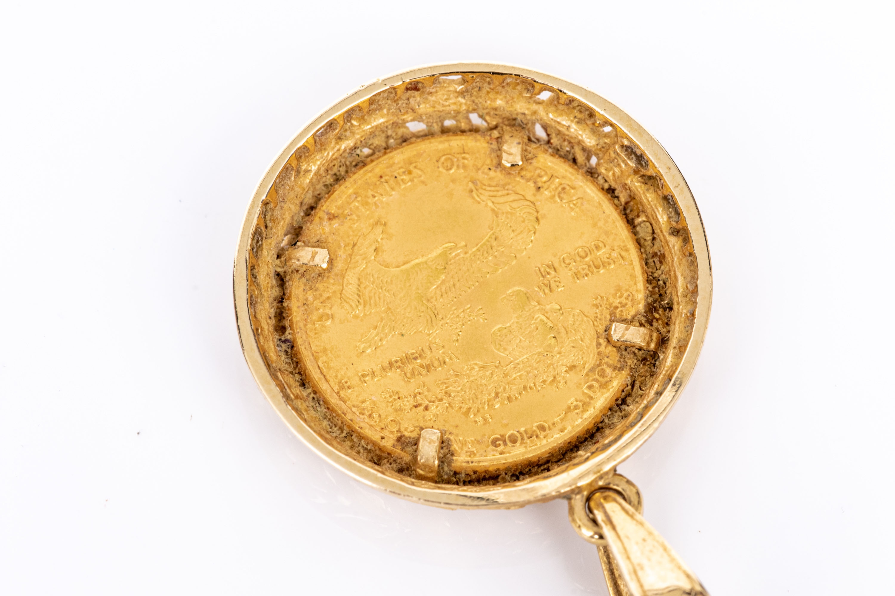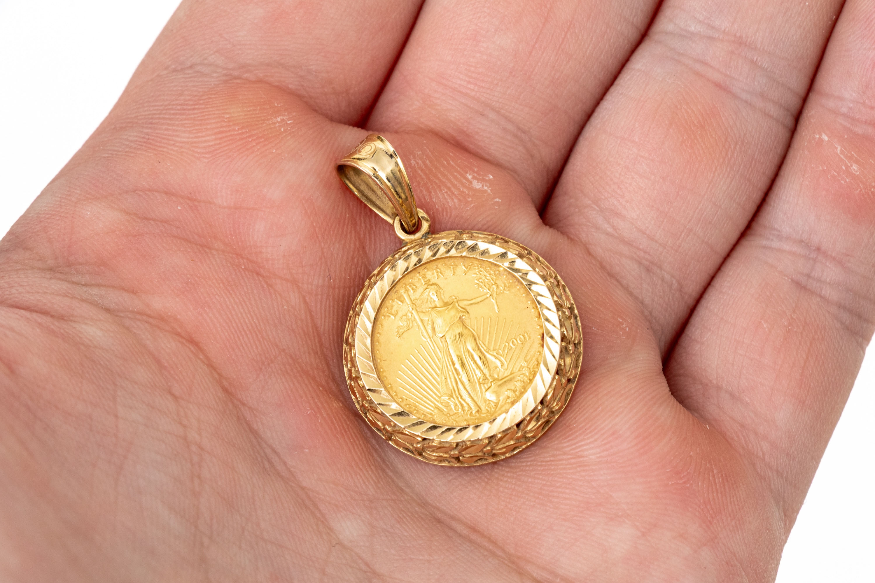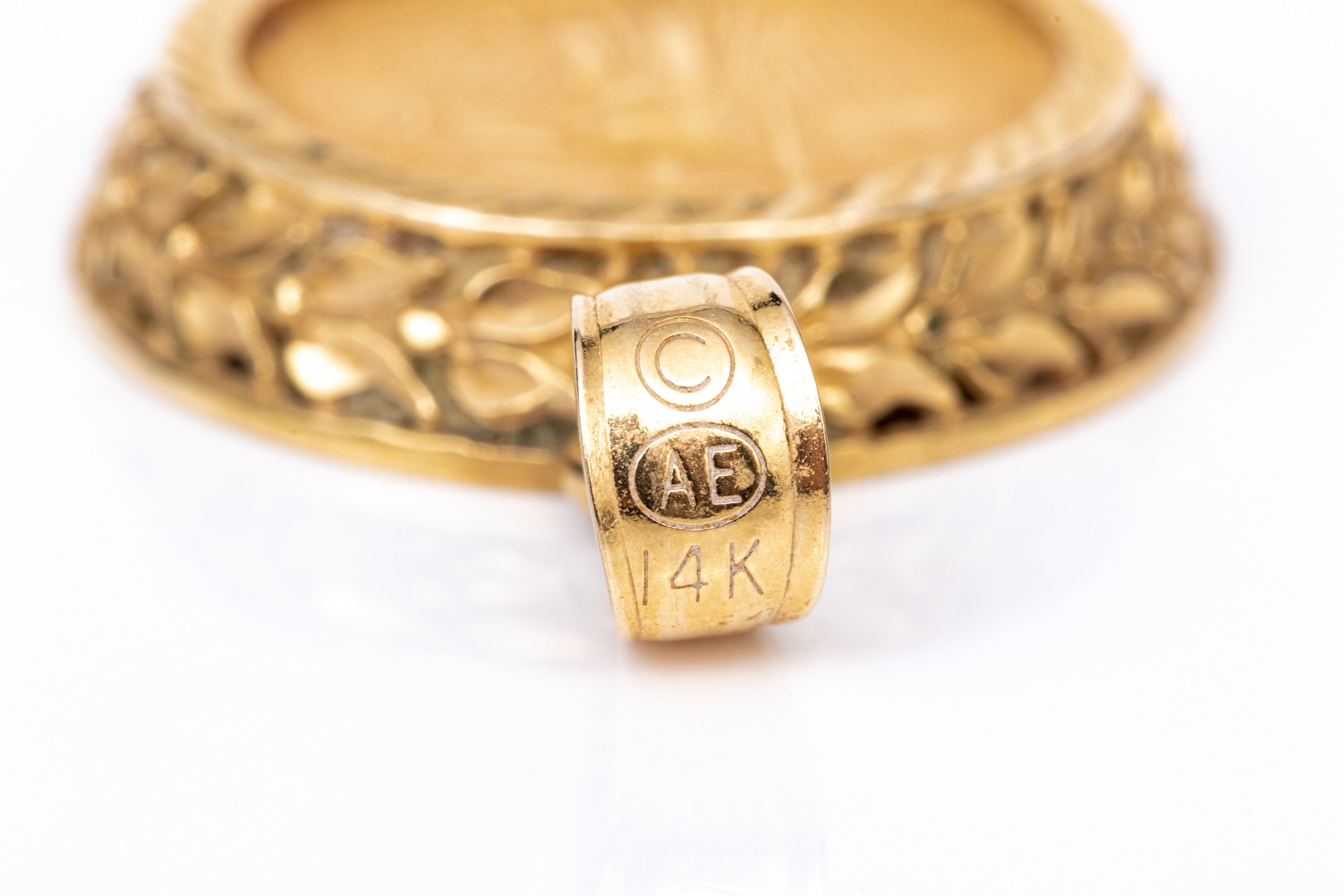 14k yellow gold ornate coin holder pendant with a 2001 $5 American gold eagle coin, finished with a ribbed style bale
