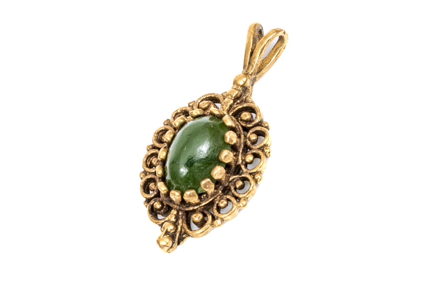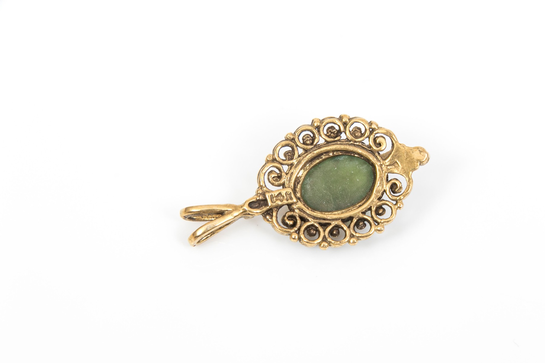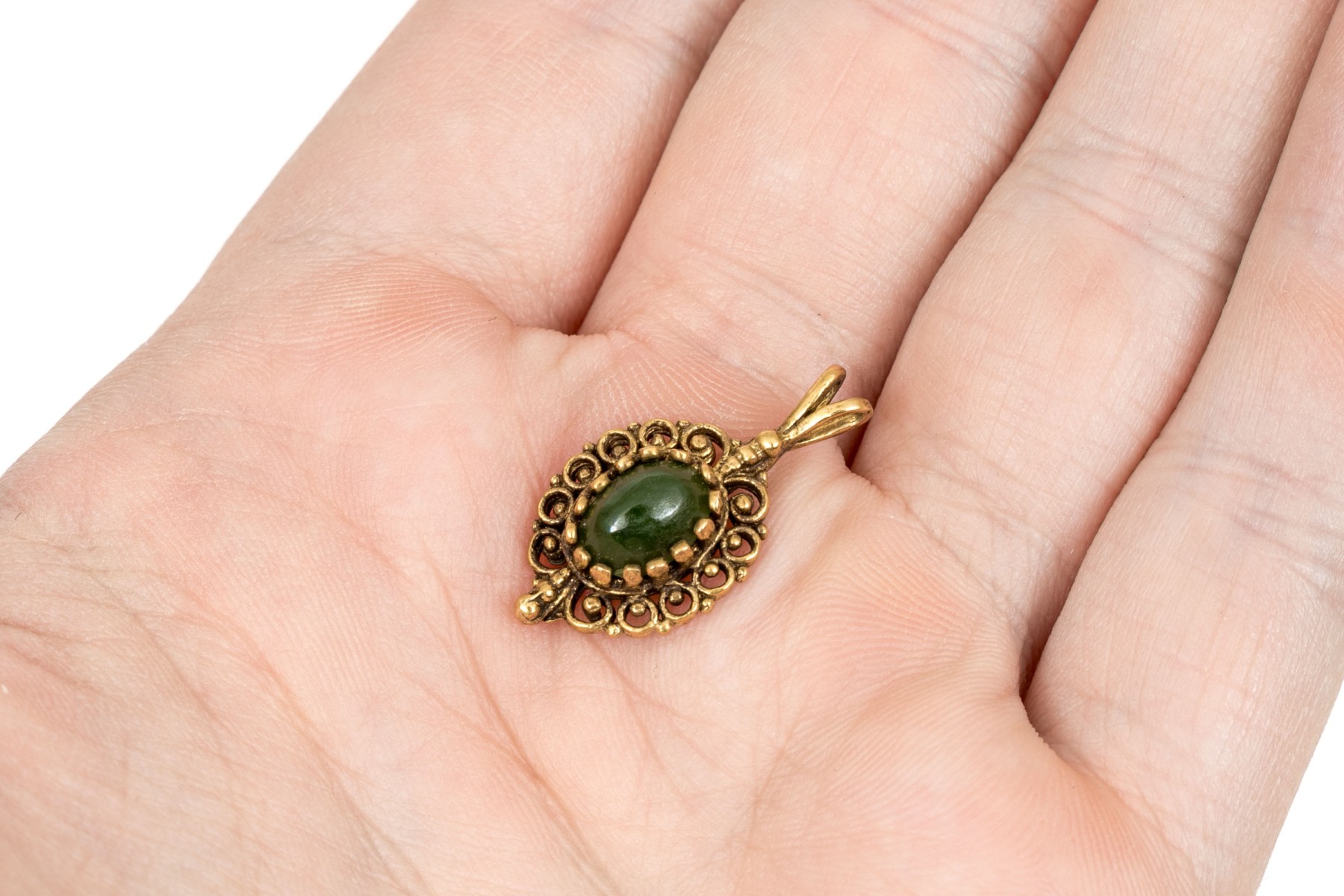 14k yellow gold ornate oval green nephrite jade florentined framed pendant, finished with a split bale