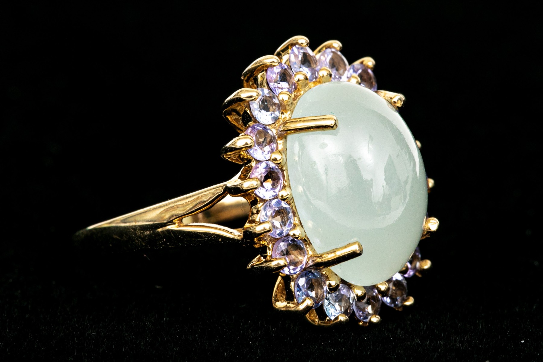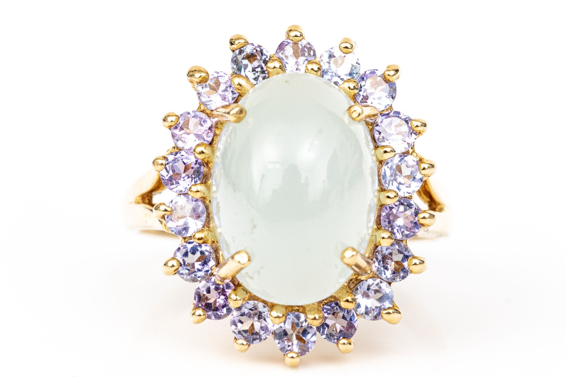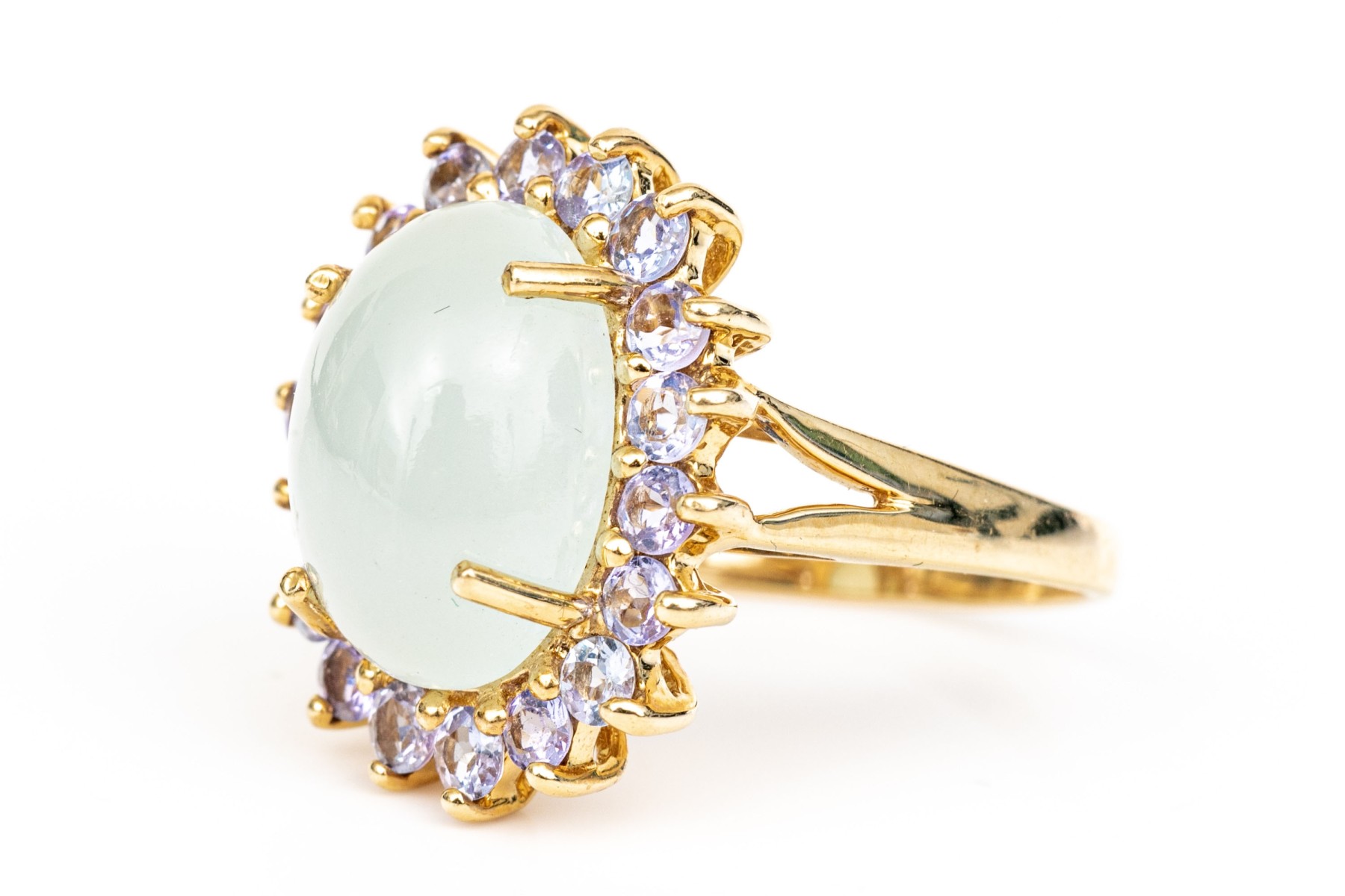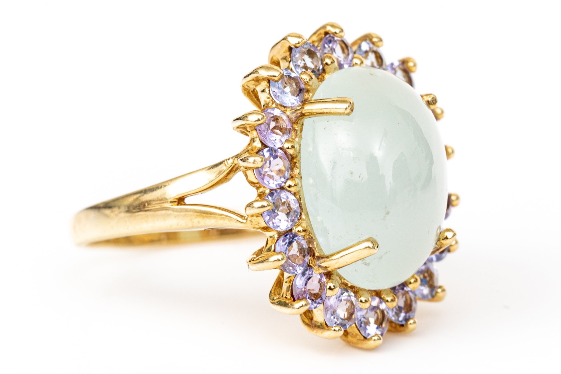 14k yellow gold pale green chalcedony and tanzanite halo ring, size 8. This pretty ring features an oval shaped cabachon pale green chalcedony center, surrounded by a halo purple tanzanites, app. 0.36 TCW, prong set