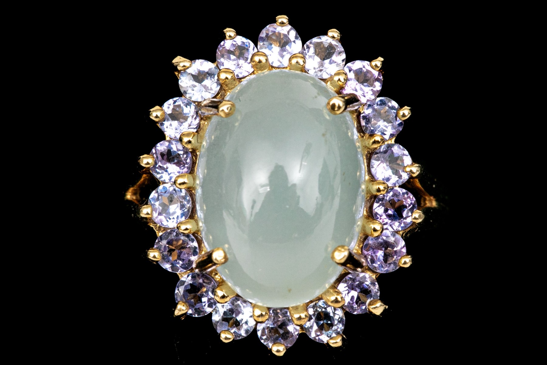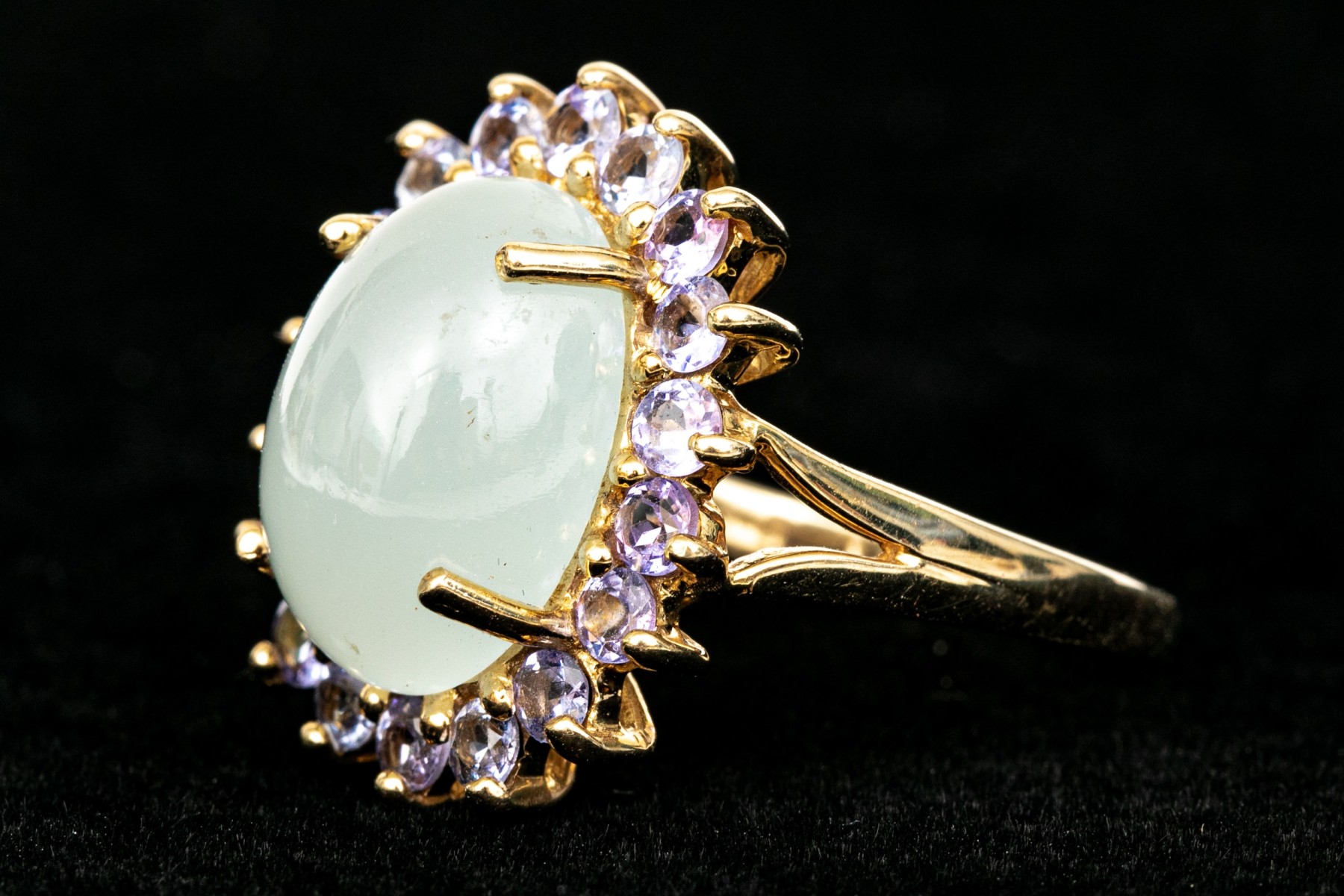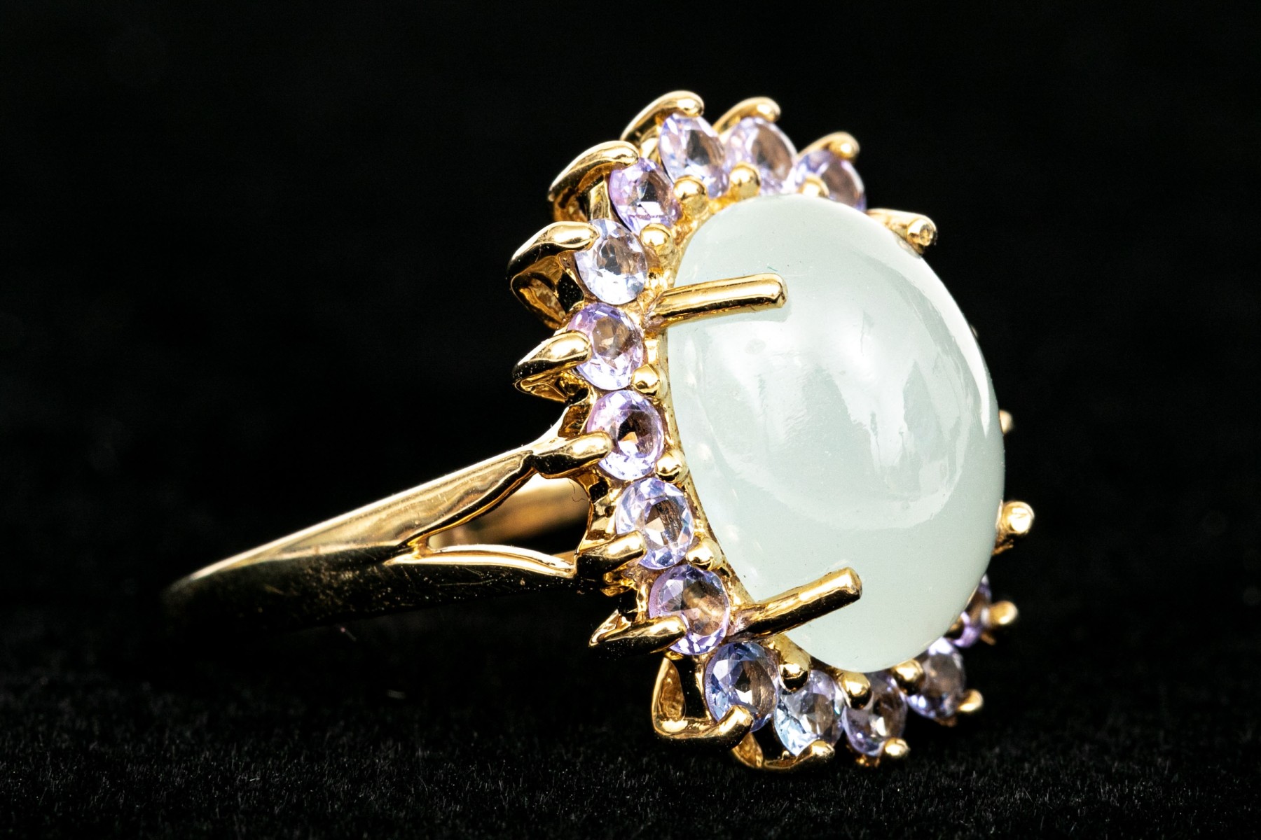 14k yellow gold pale green chalcedony and tanzanite halo ring, size 8. This pretty ring features an oval shaped cabachon pale green chalcedony center, surrounded by a halo purple tanzanites, app. 0.36 TCW, prong set
