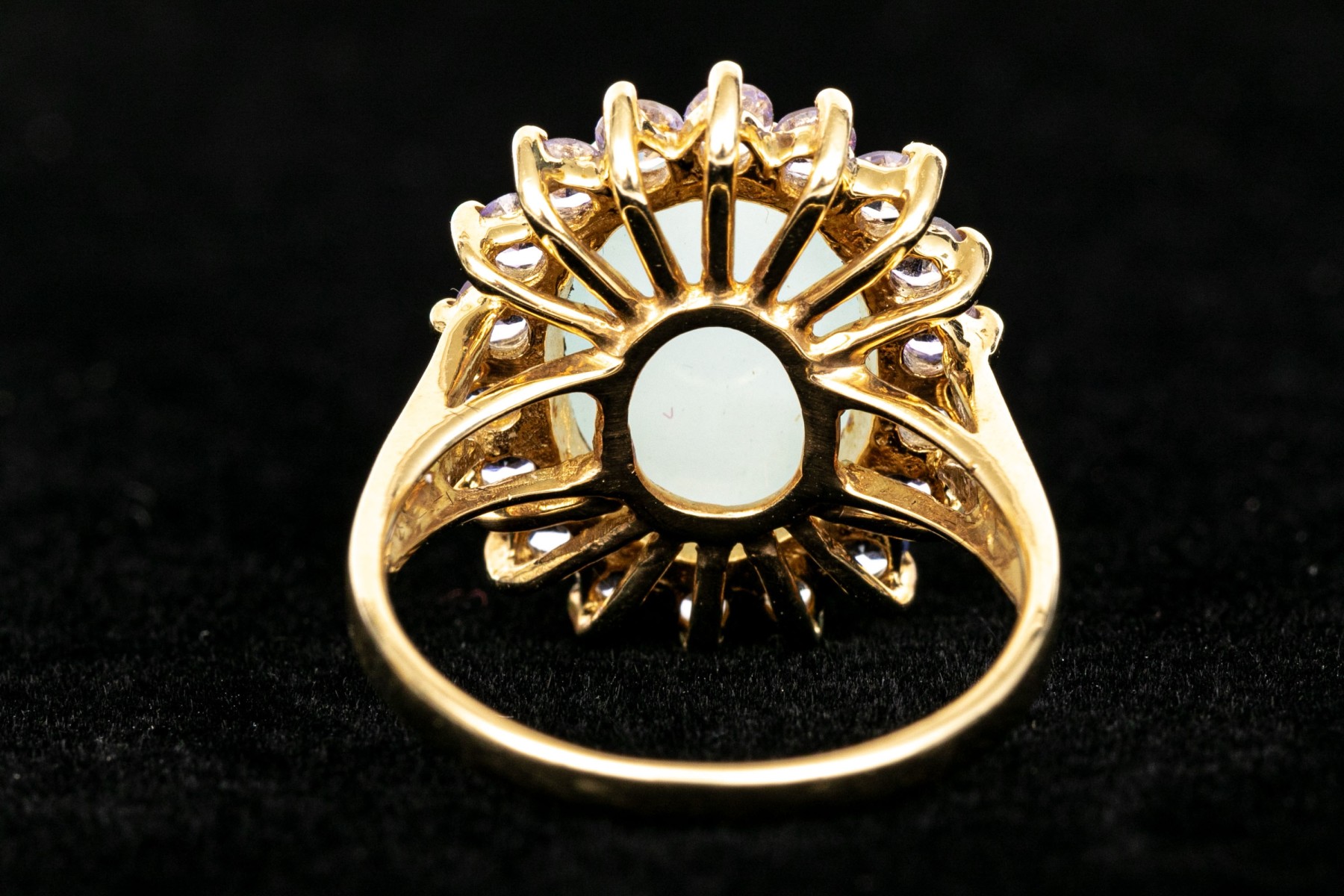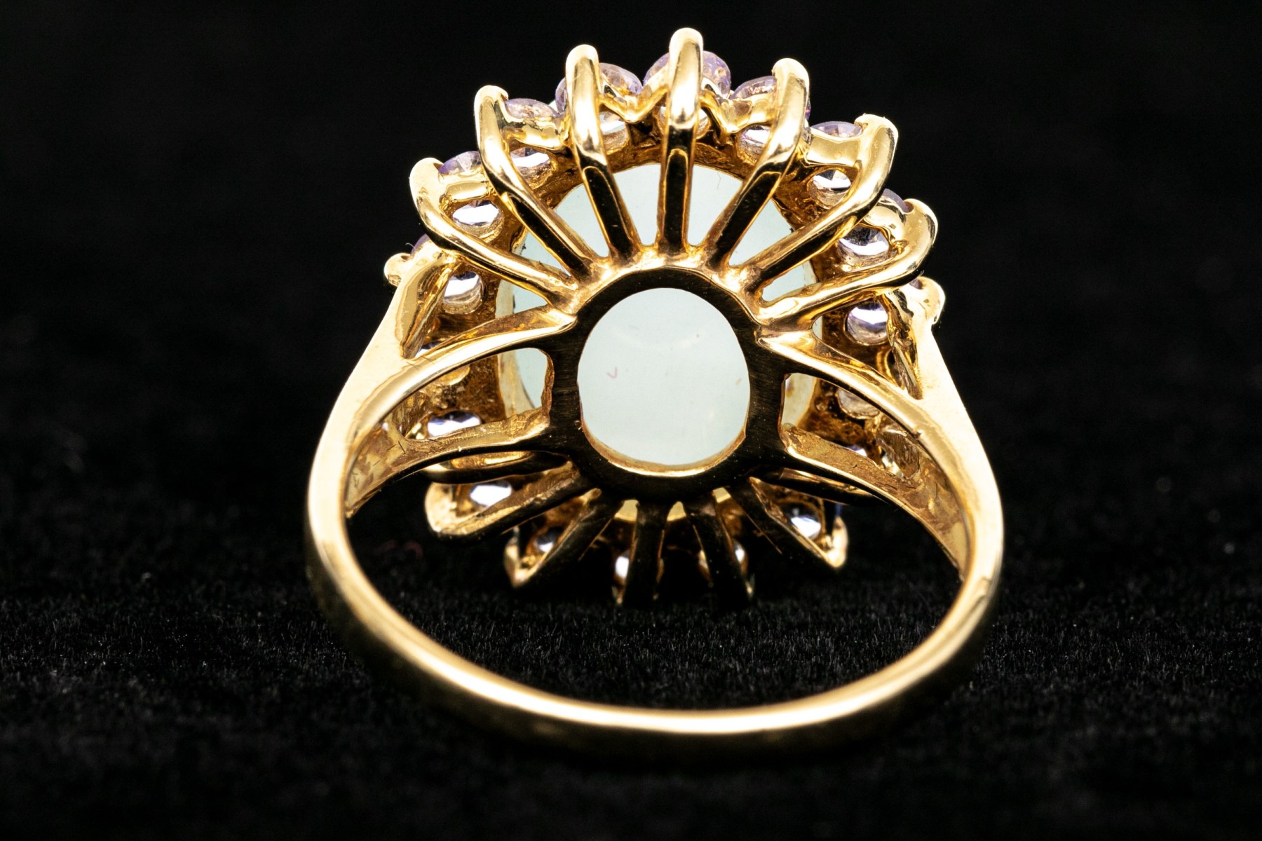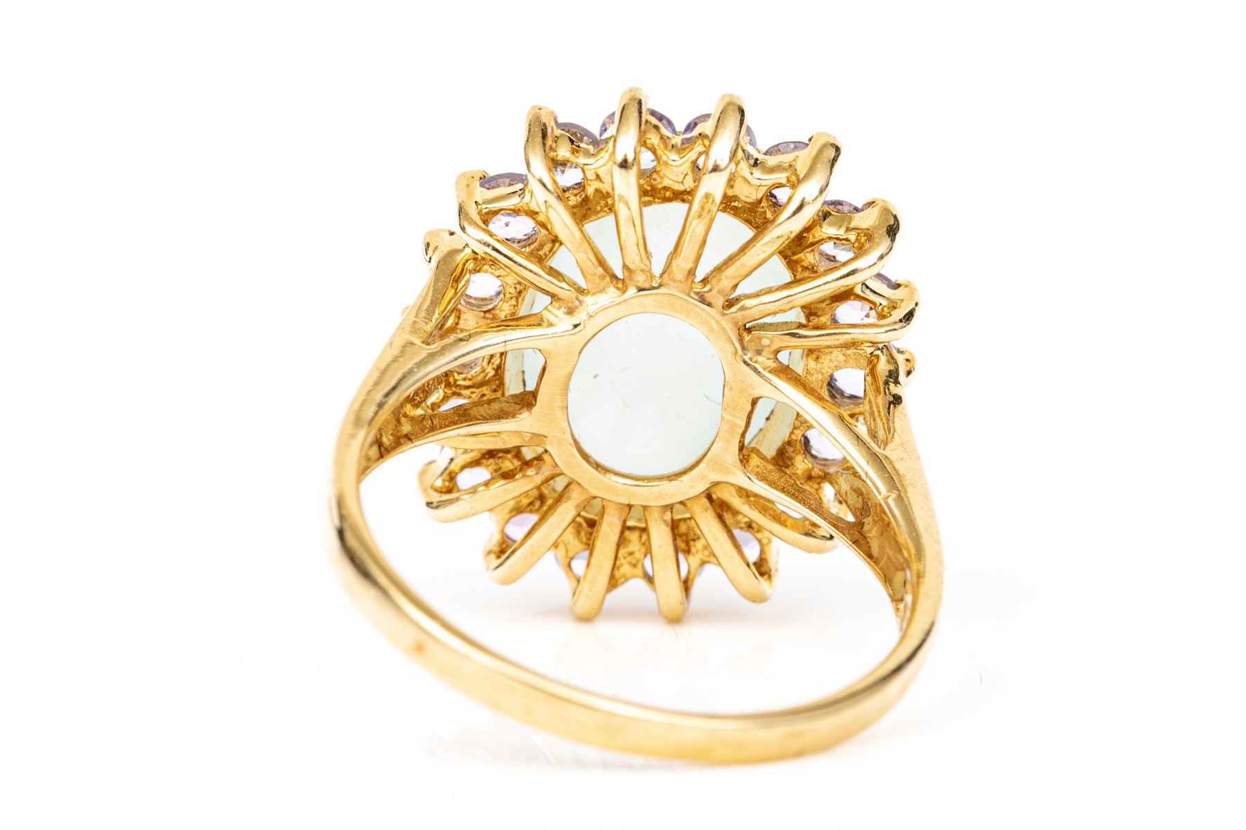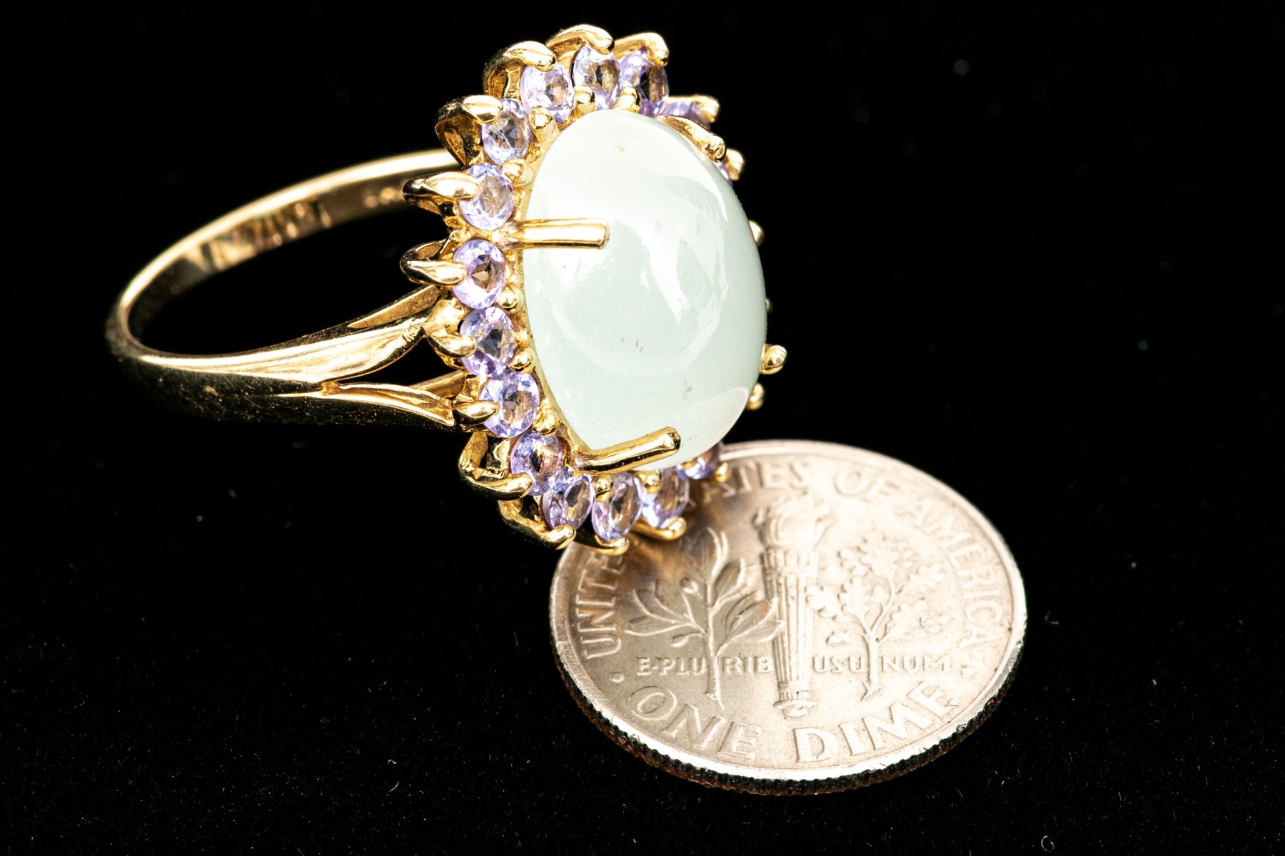 14k yellow gold pale green chalcedony and tanzanite halo ring, size 8. This pretty ring features an oval shaped cabachon pale green chalcedony center, surrounded by a halo purple tanzanites, app. 0.36 TCW, prong set