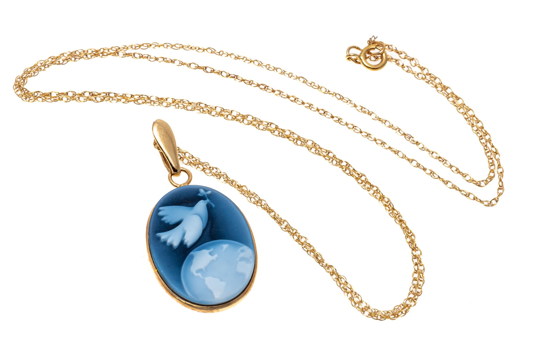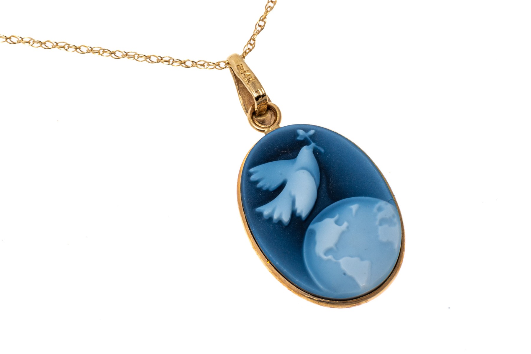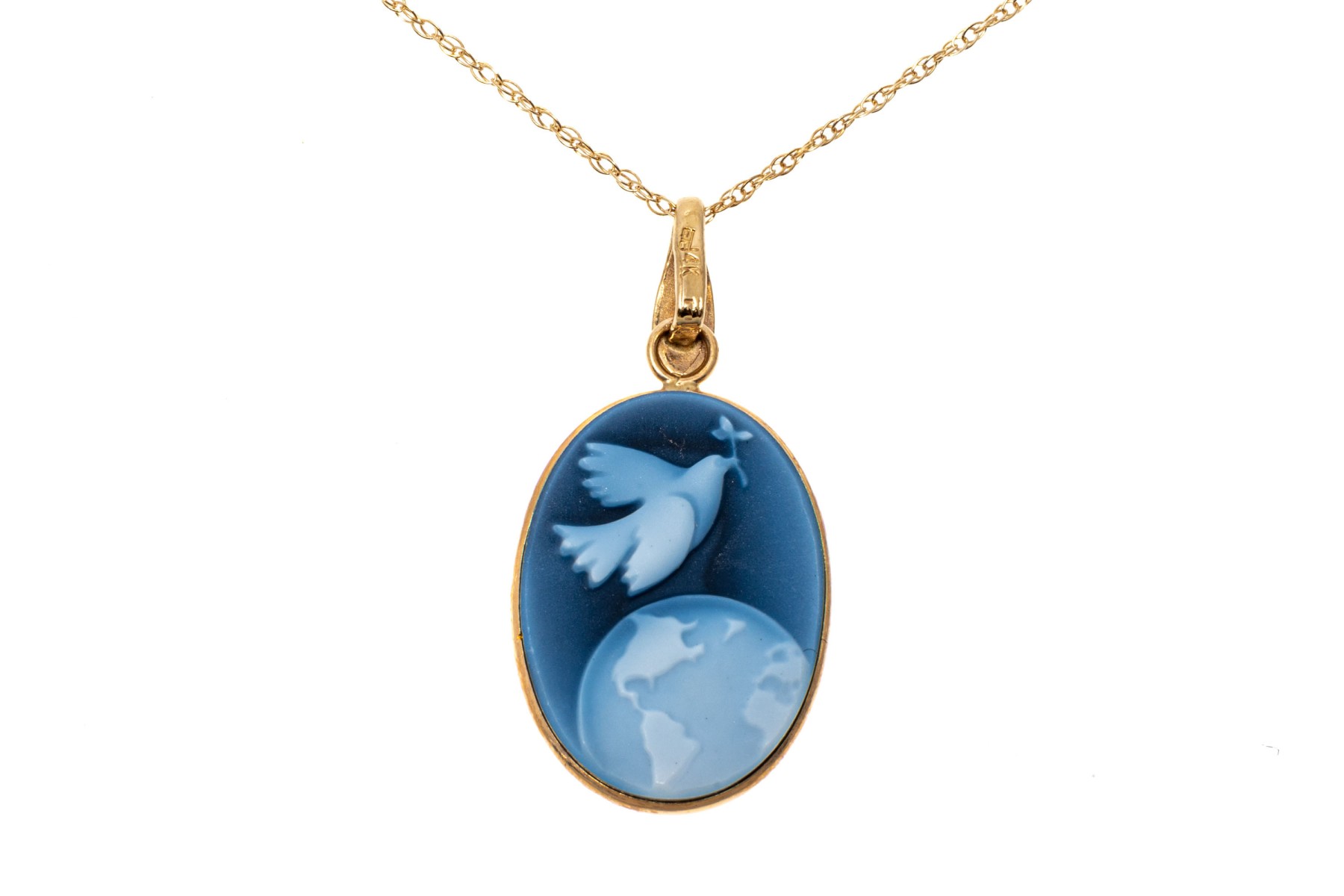 A charming yellow gold necklace featuring a white to blue oval cameo pendant with the phrase "Peace on Earth" on one side and a depiction of a dove over Earth on the other, hanging from a double-link cable chain finished with a spring ring clasp.