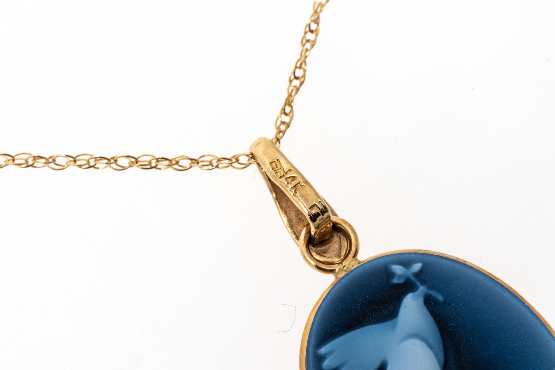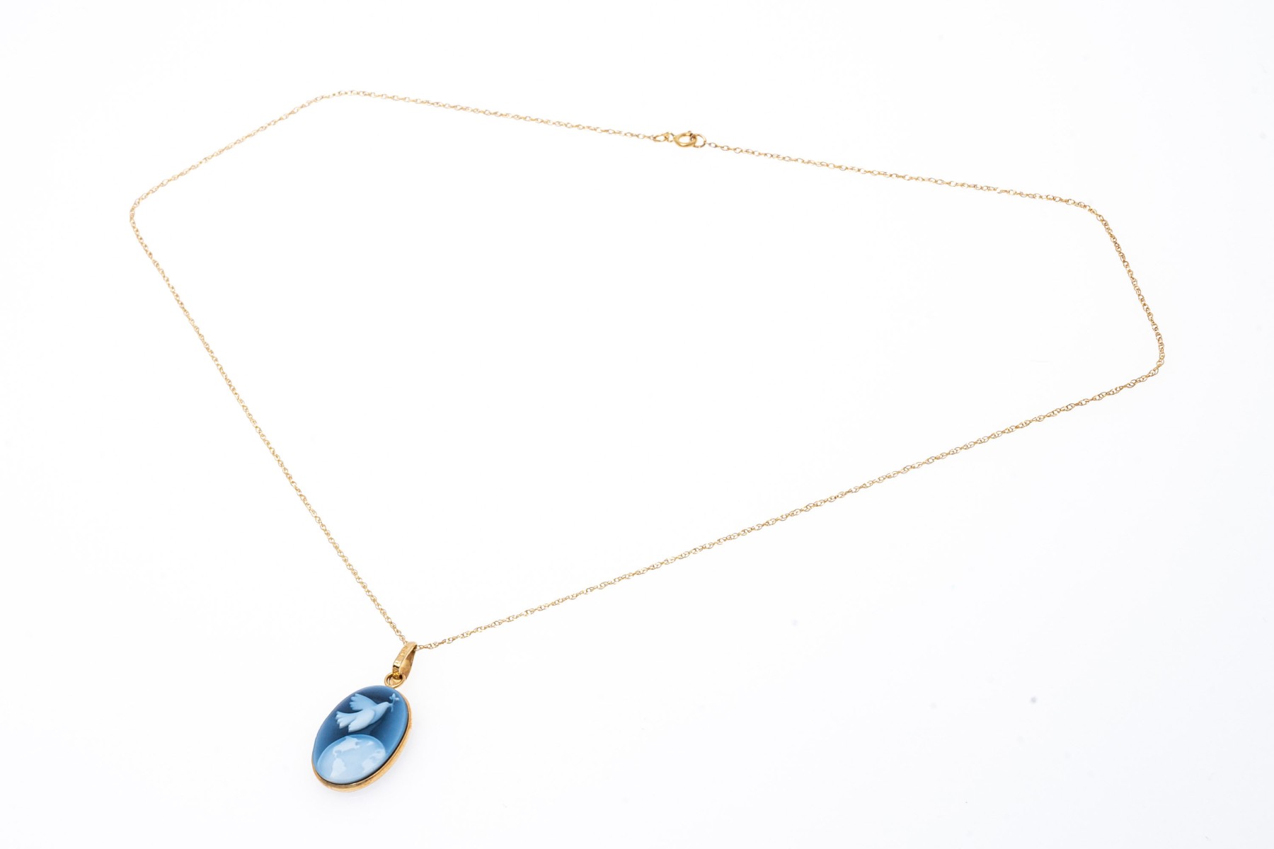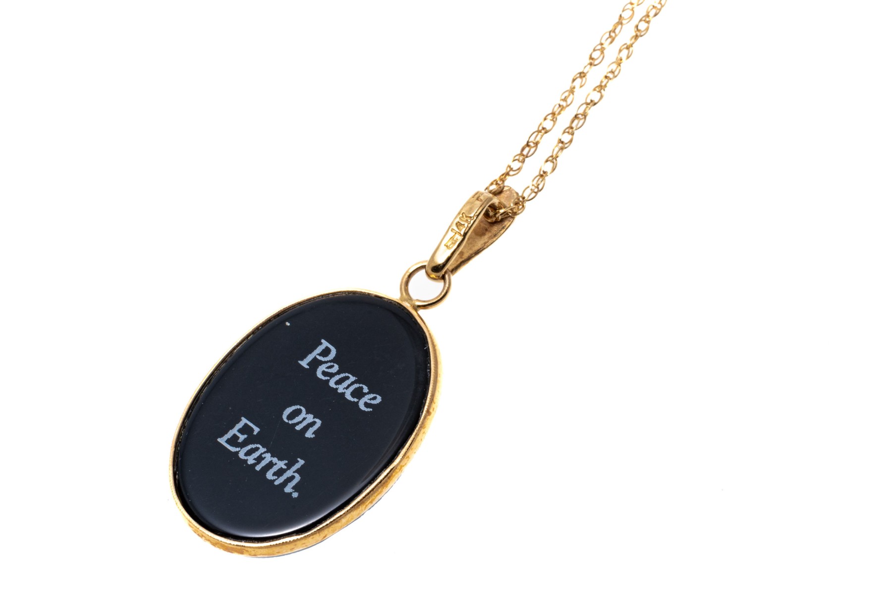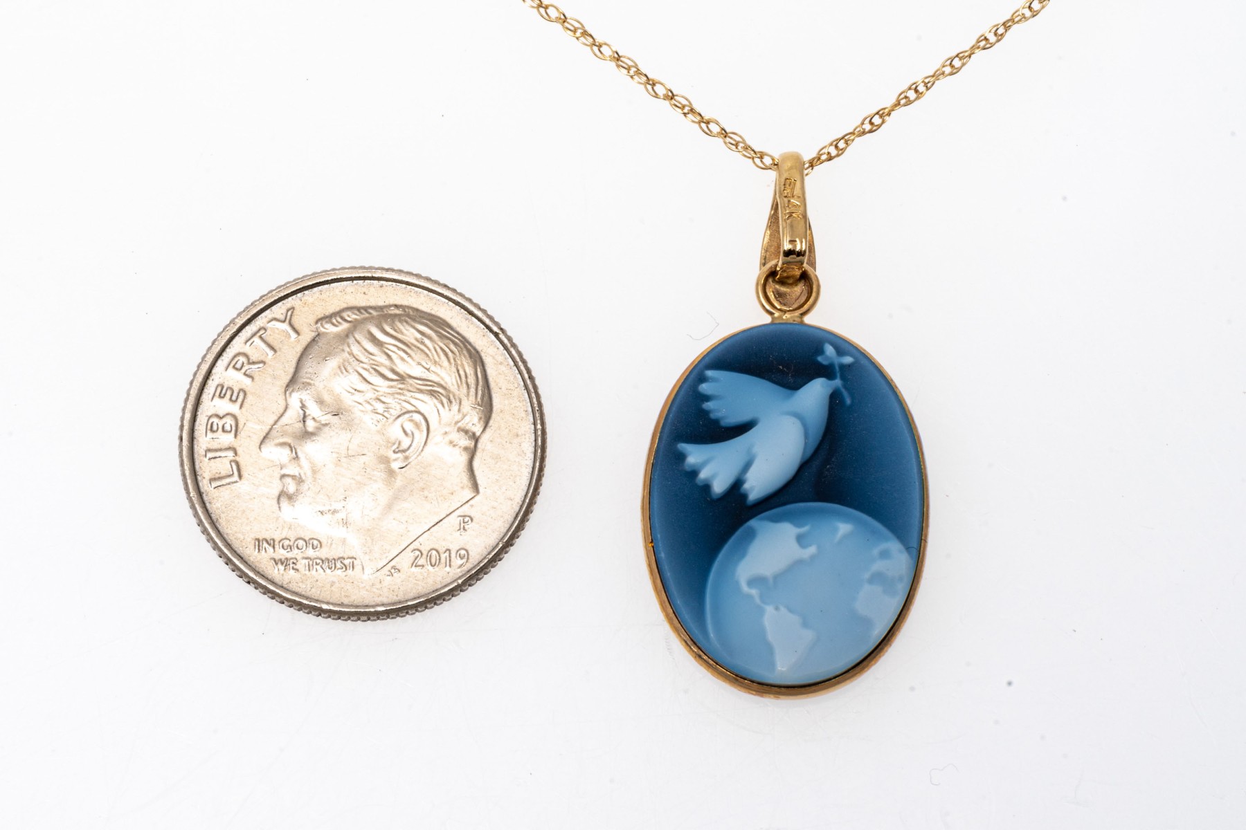 A charming yellow gold necklace featuring a white to blue oval cameo pendant with the phrase "Peace on Earth" on one side and a depiction of a dove over Earth on the other, hanging from a double-link cable chain finished with a spring ring clasp.