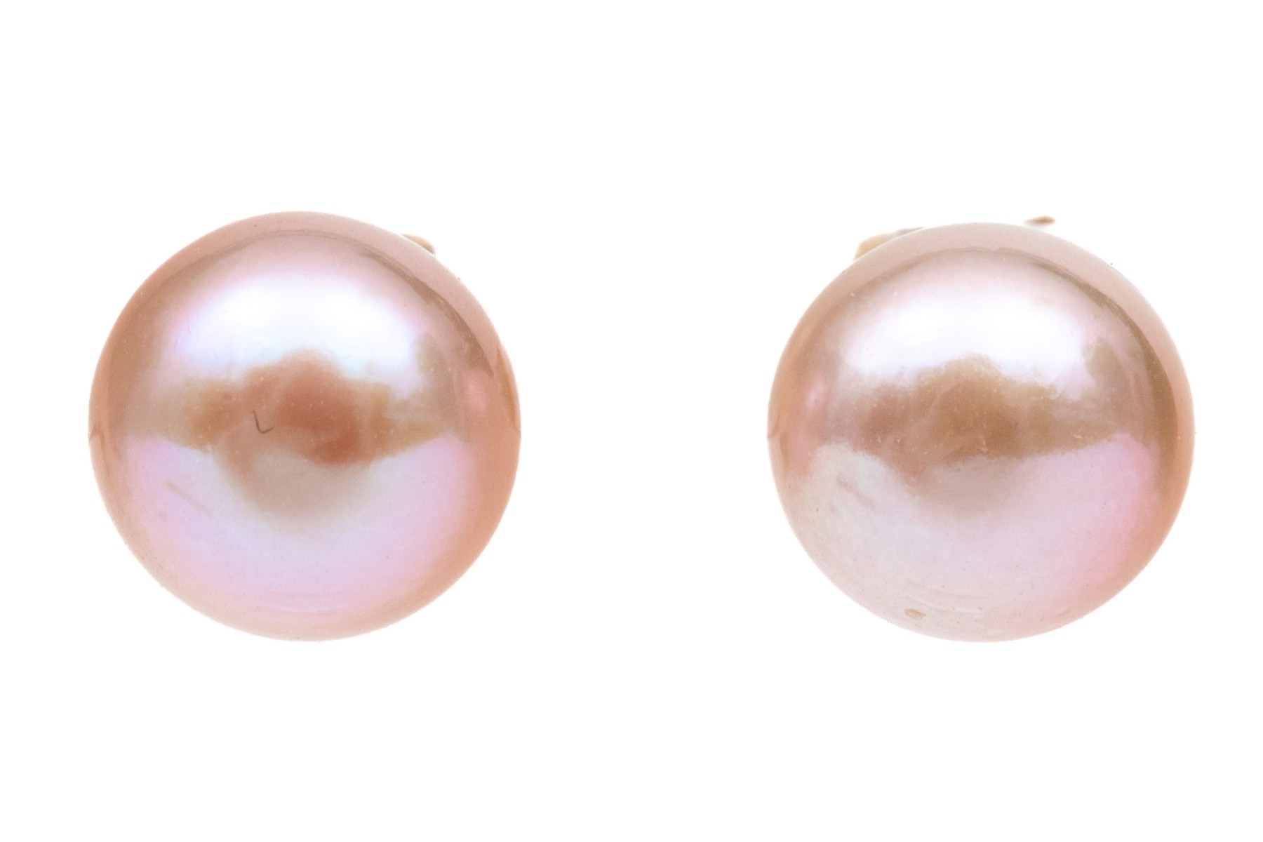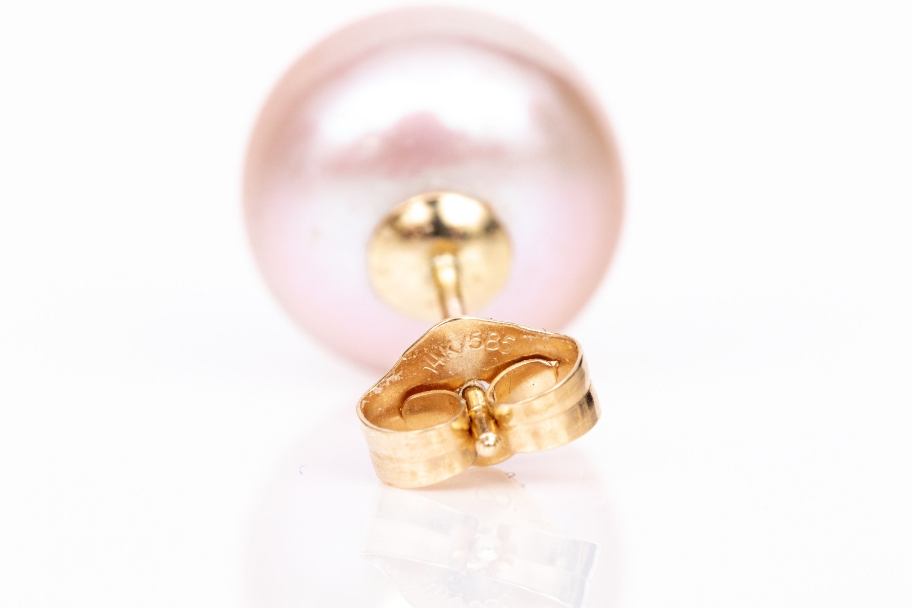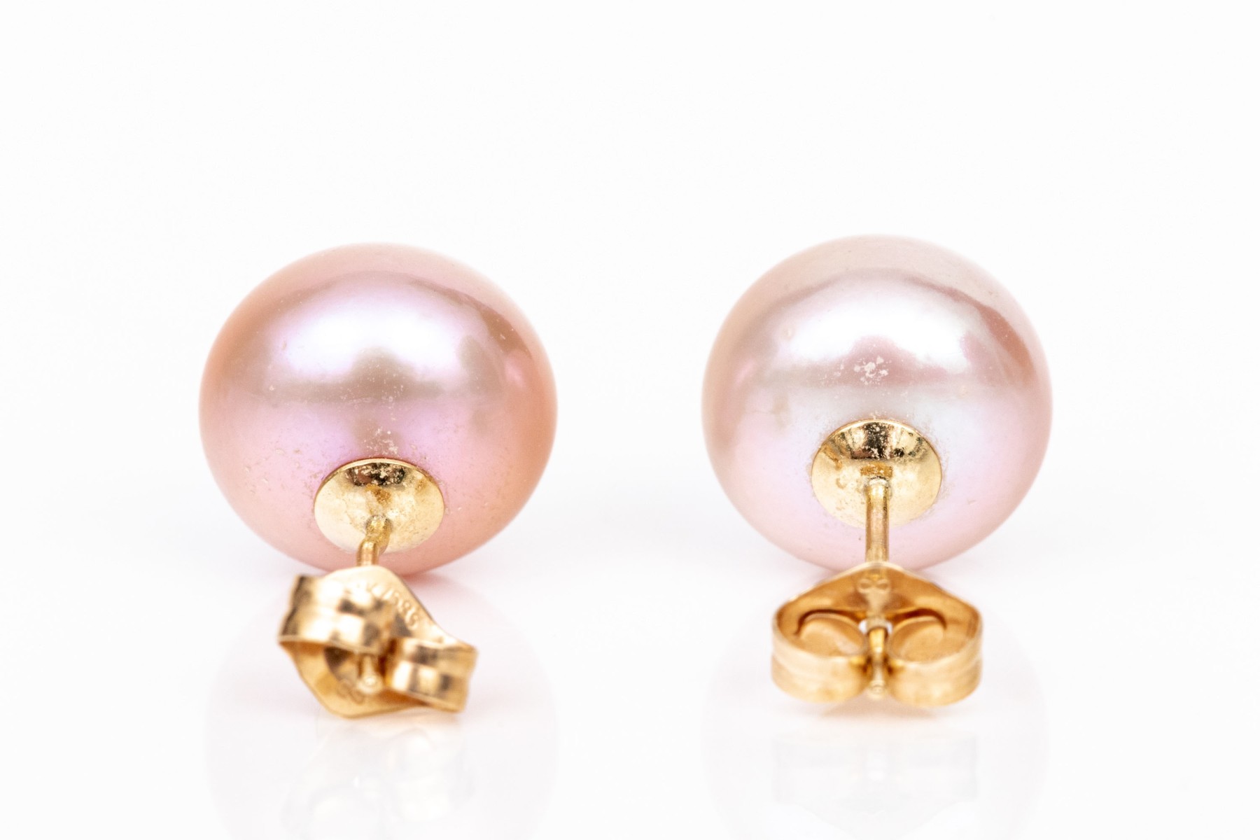 14k yellow gold pink toned 9.5 mm cultured freshwater pearl earrings. These pretty stud earrings are finished with posts and clutch style backs