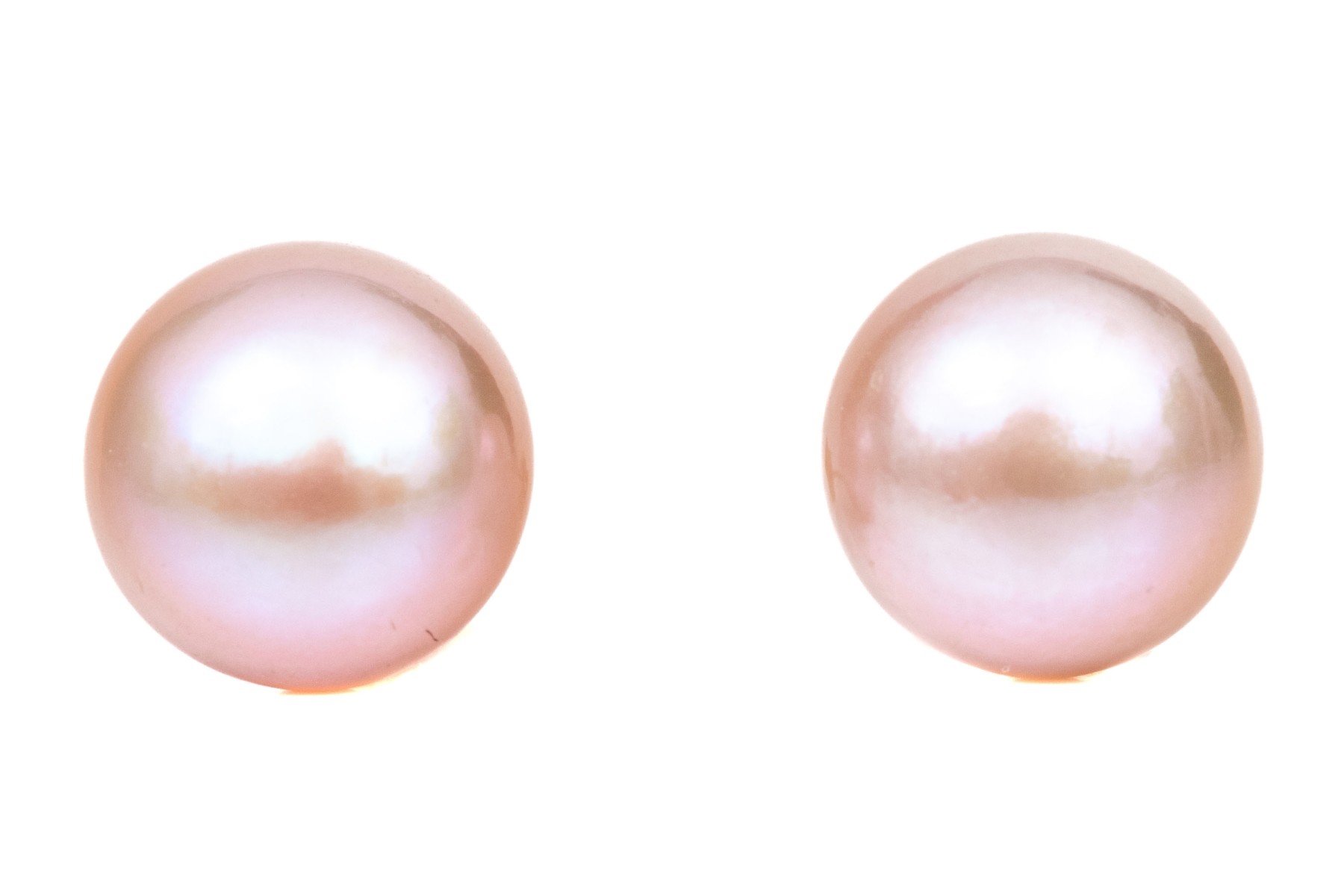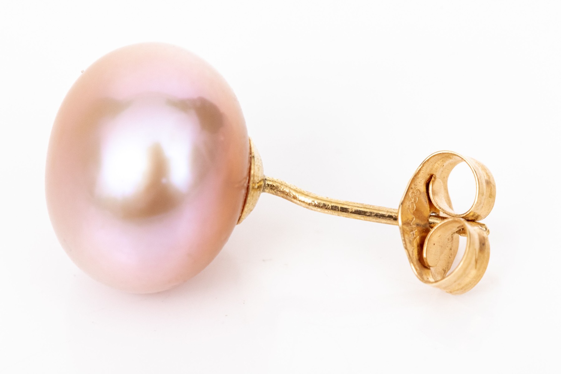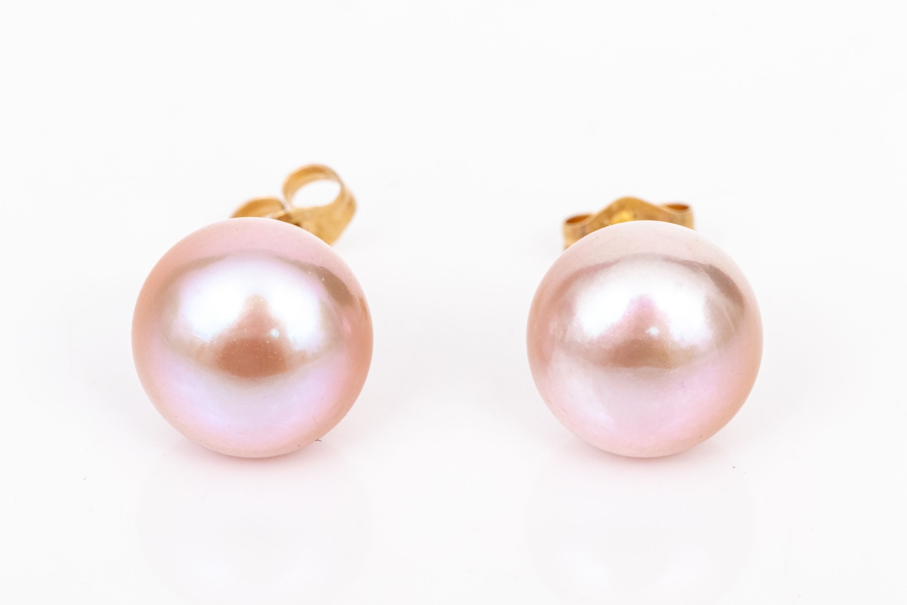 14k yellow gold pink toned 9.5 mm cultured freshwater pearl earrings. These pretty stud earrings are finished with posts and clutch style backs