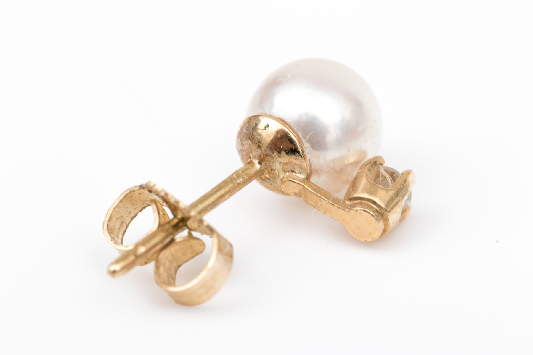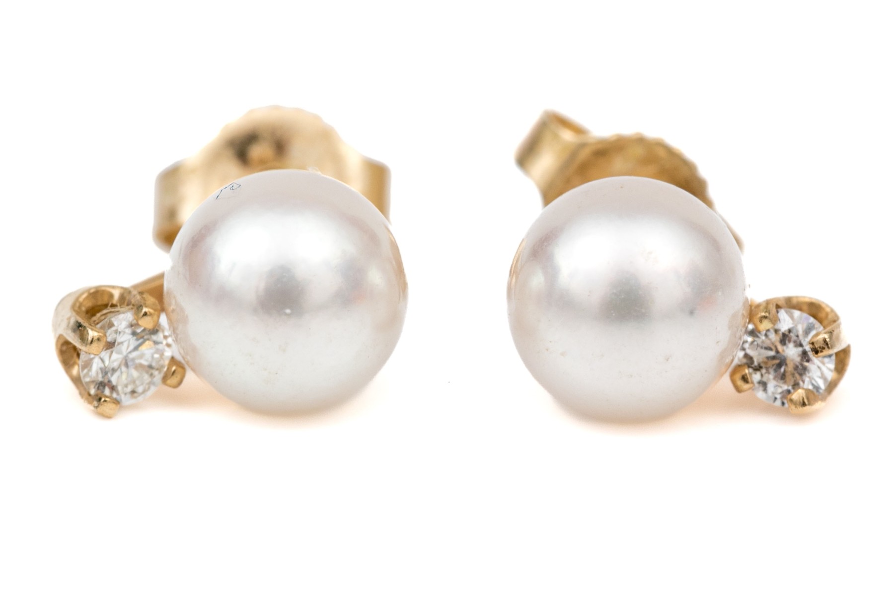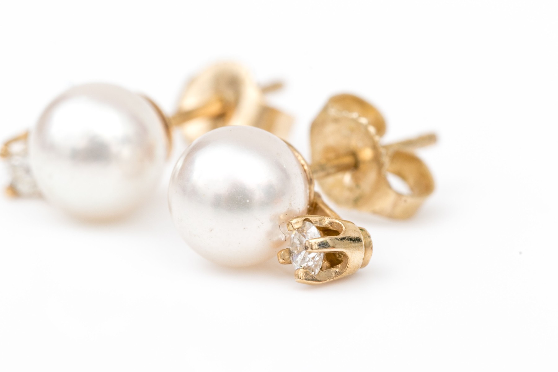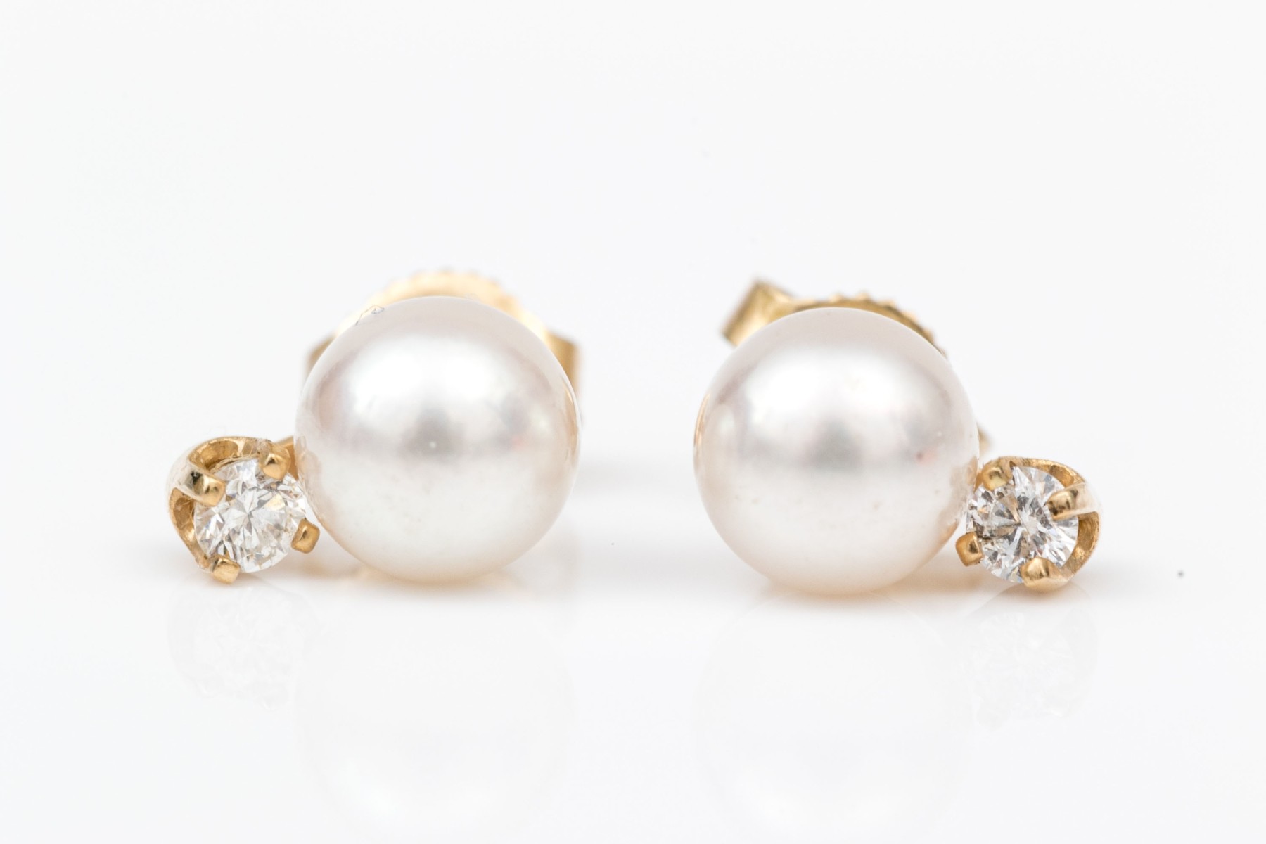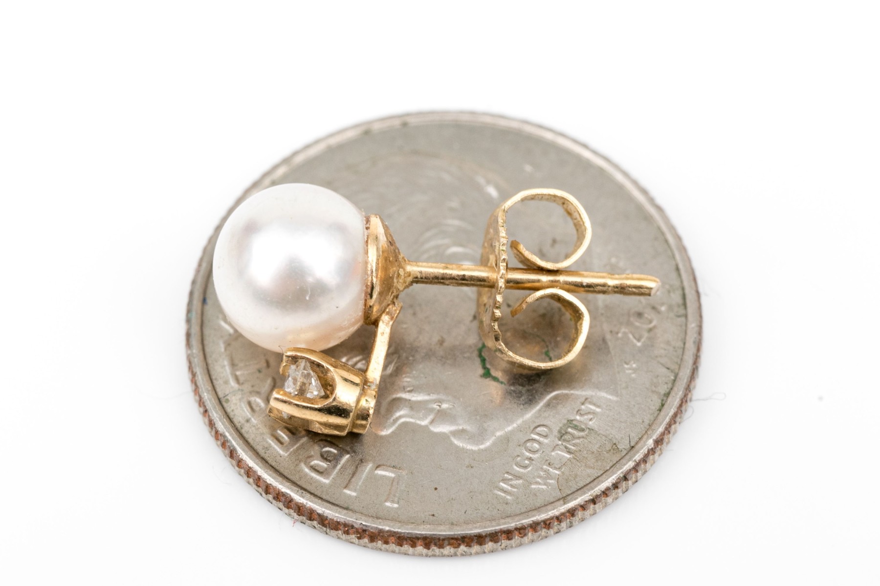 14k yellow gold pretty 5.75 mm cultured pearl stud earrings set with diamonds, app. 0.08 TCW. The earrings are finished by posts with clutch style backs