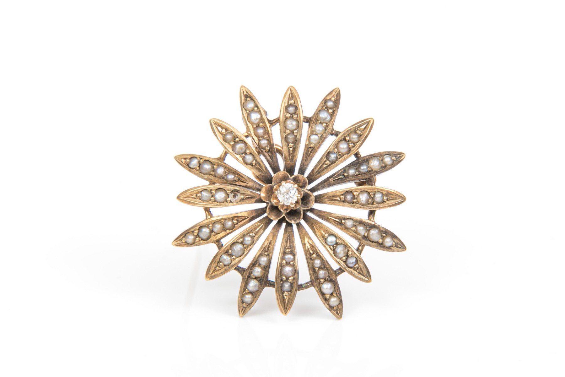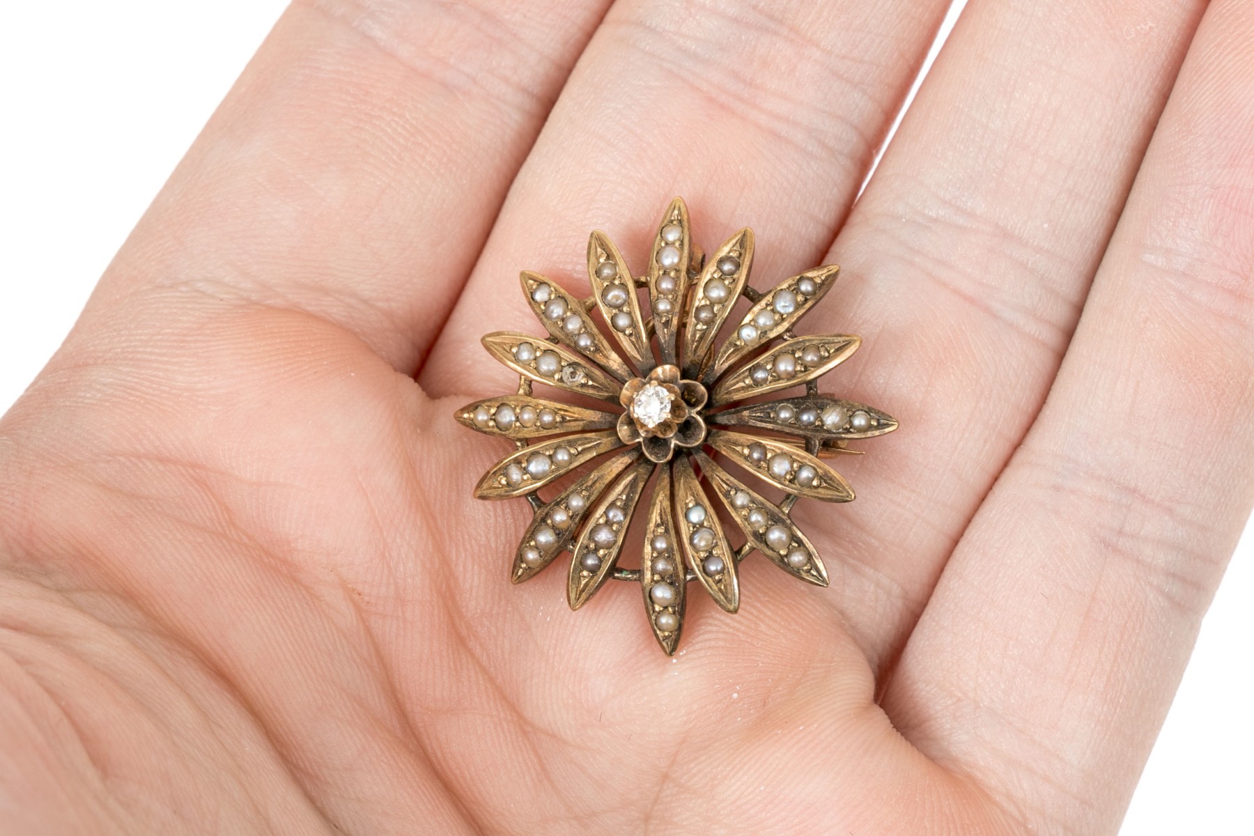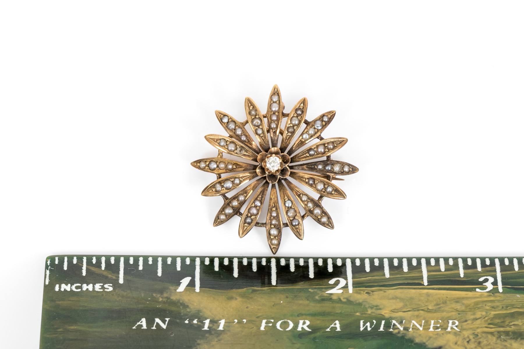 14k yellow gold pretty antique flower motif seed pearl pin/pendant, with diamond, app. 0.04 CTS, prong set