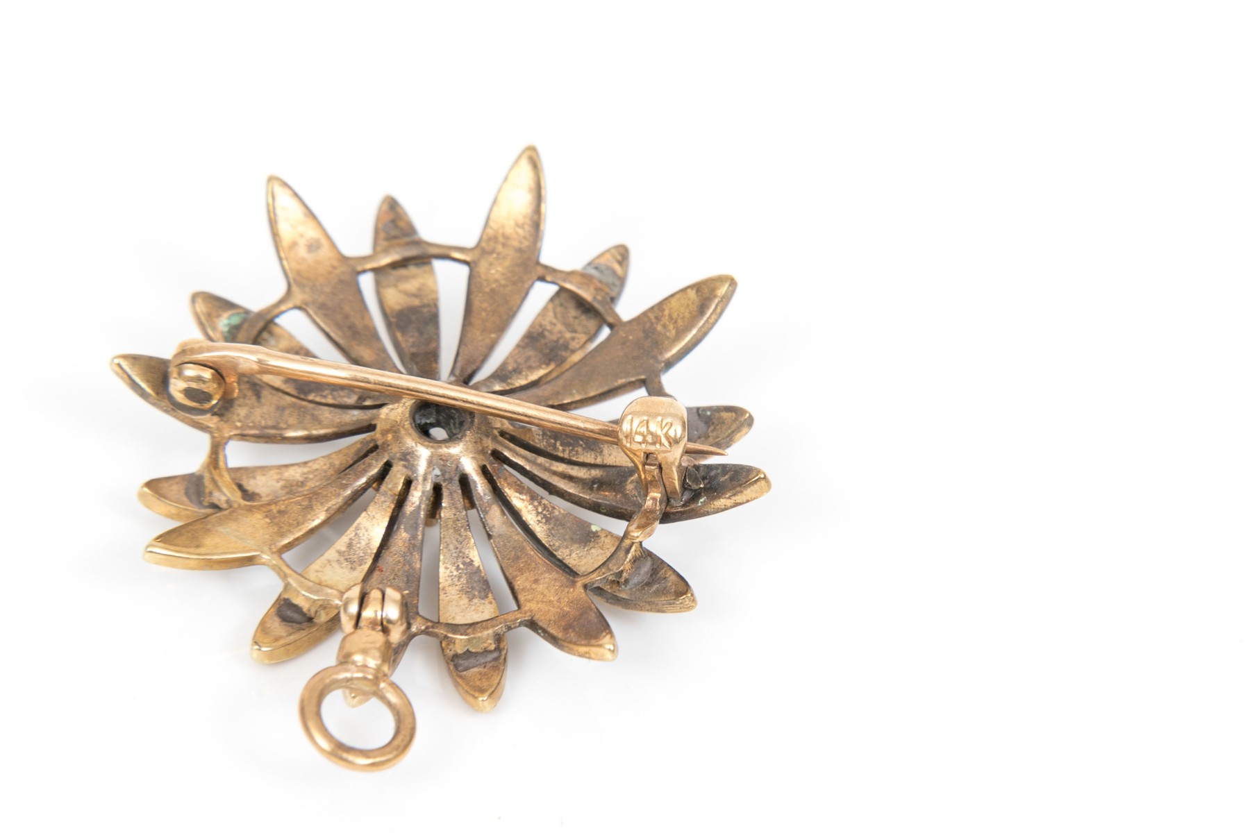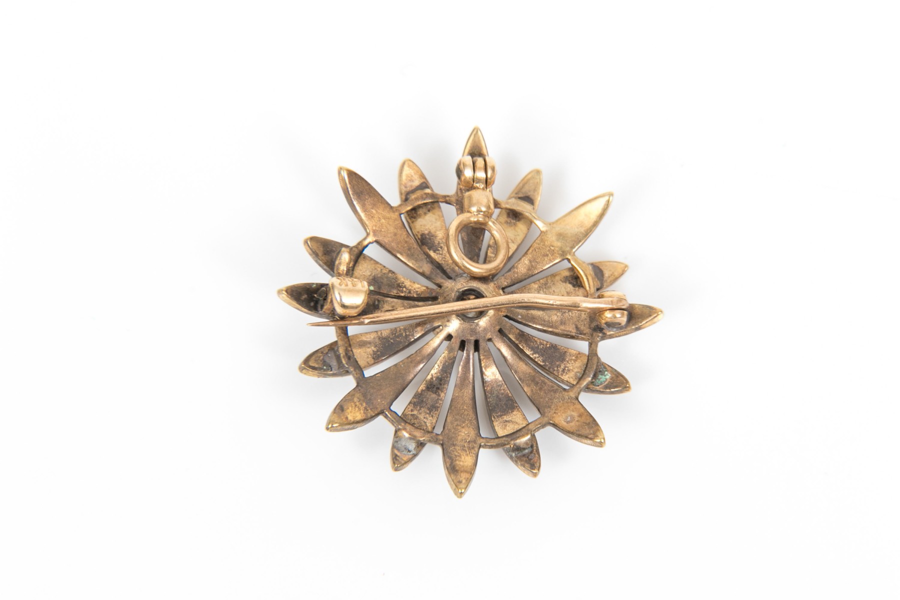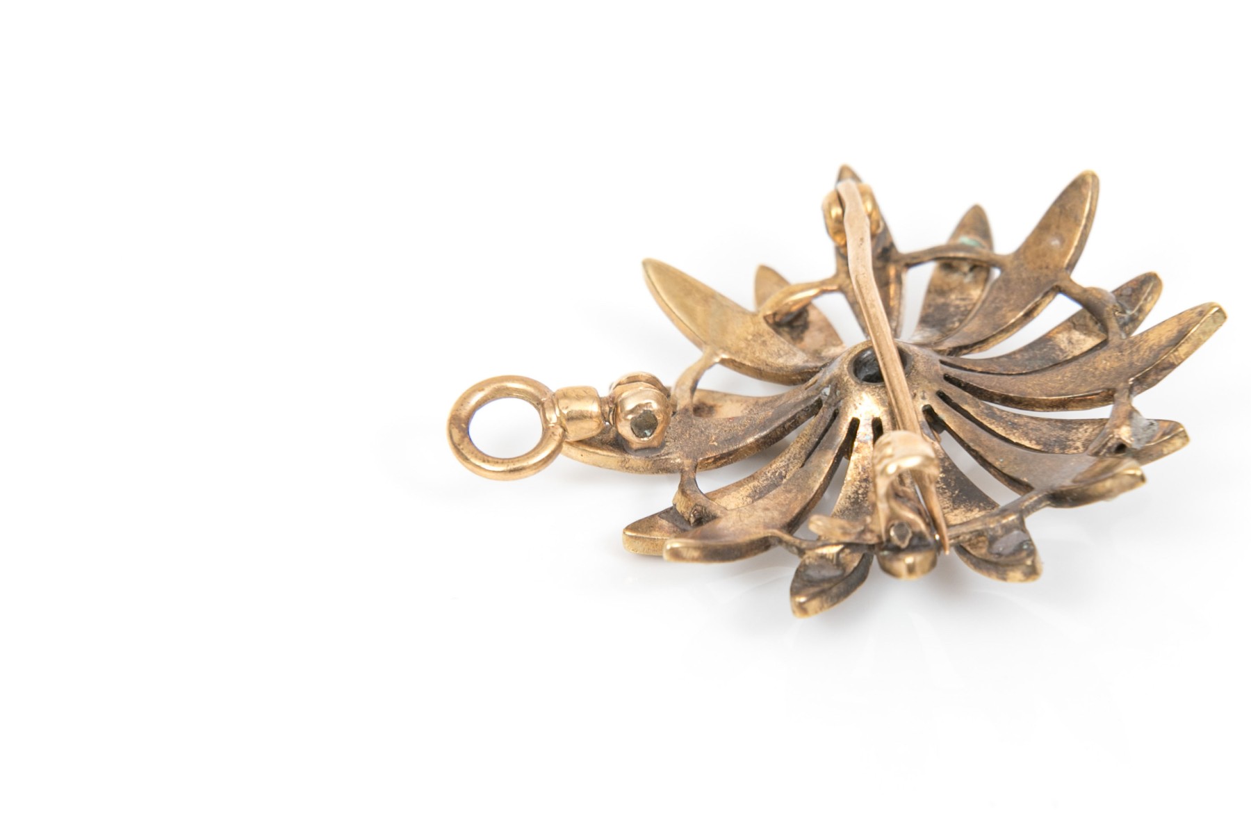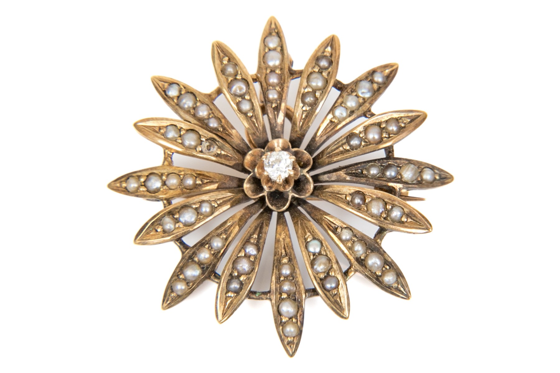 14k yellow gold pretty antique flower motif seed pearl pin/pendant, with diamond, app. 0.04 CTS, prong set
