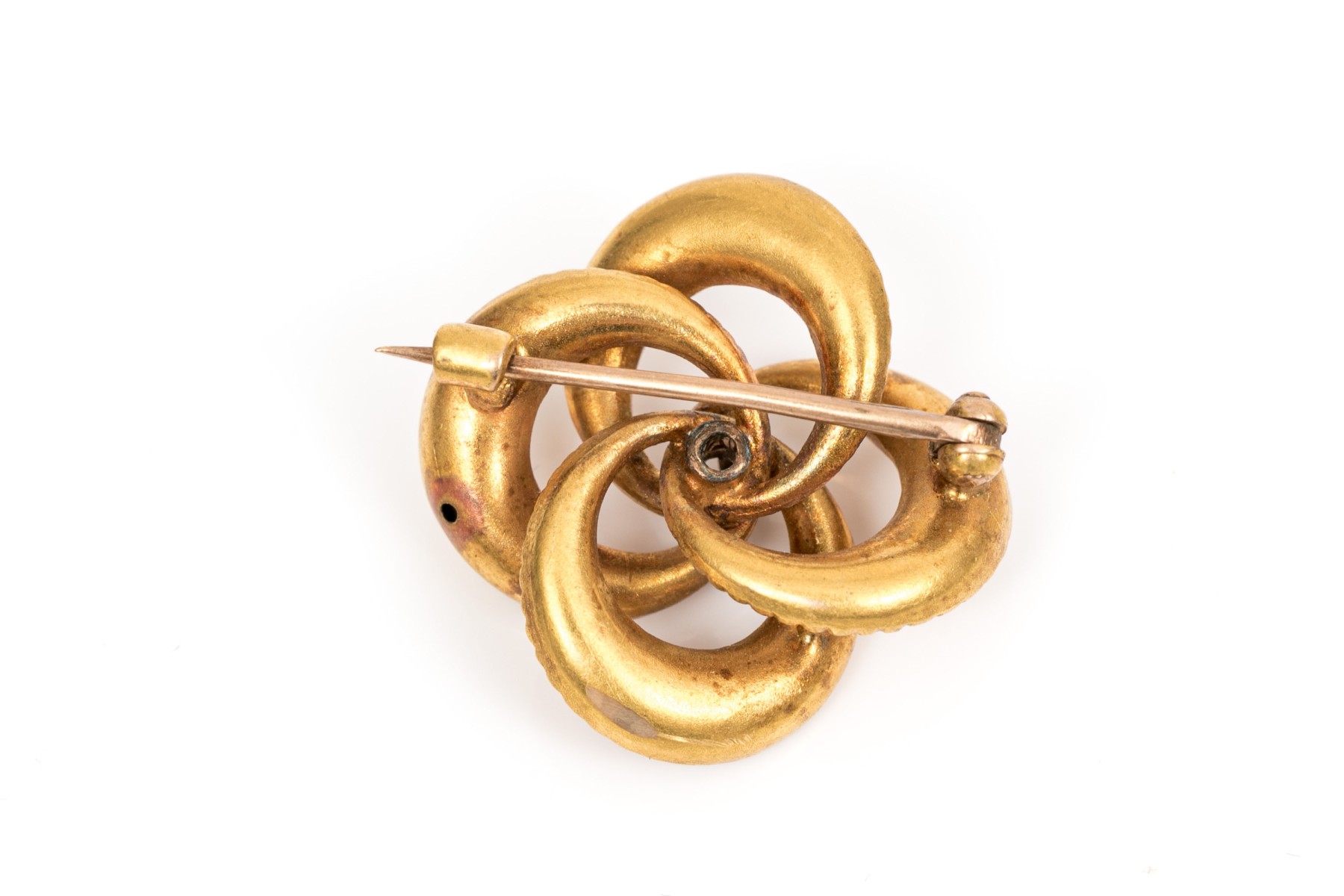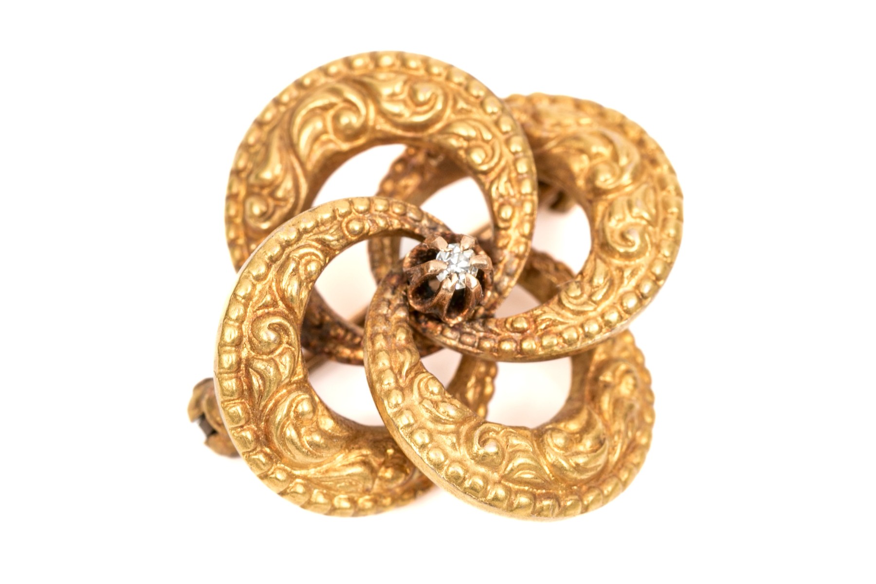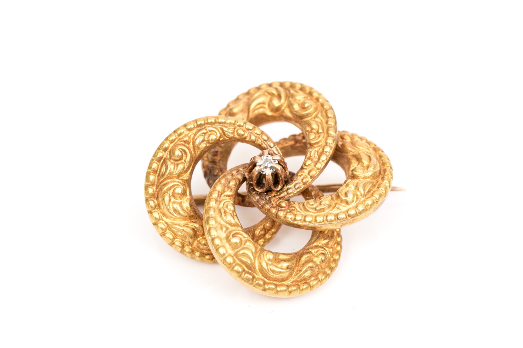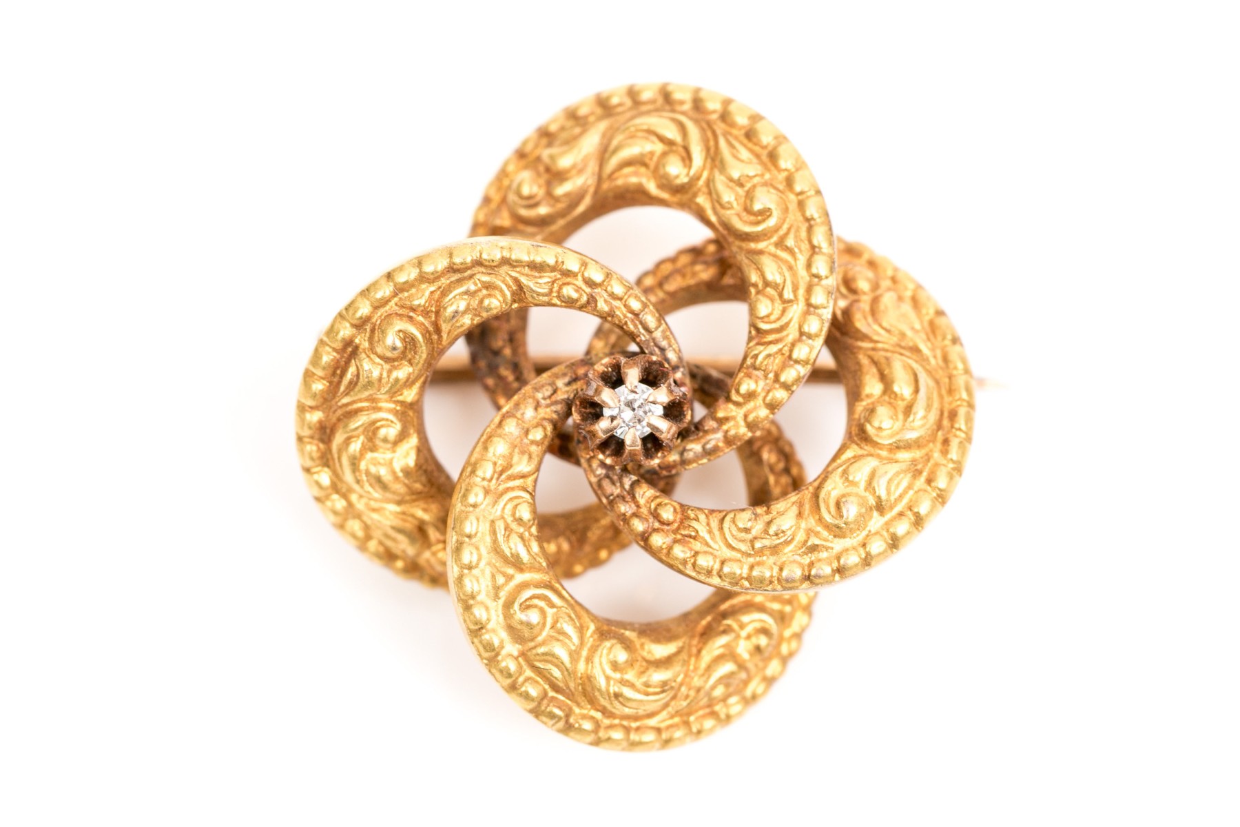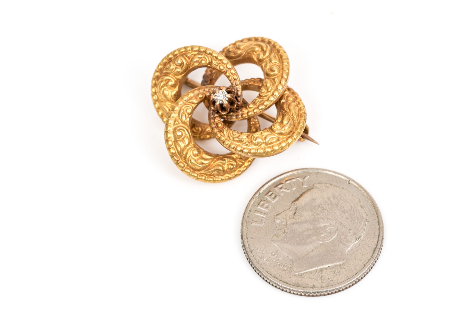 14k yellow gold pretty antique knot motif brooch, with a center white sapphire, prong set