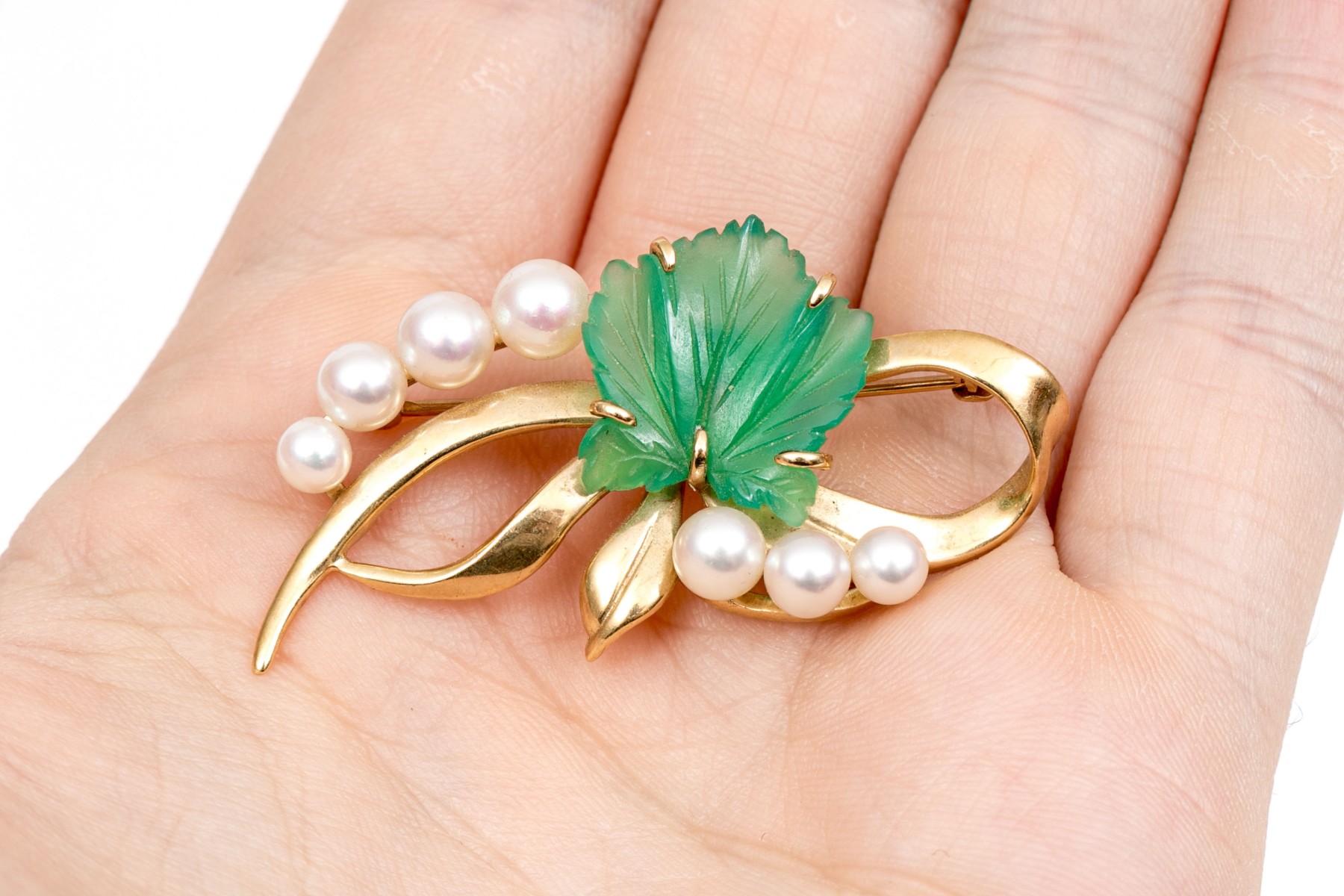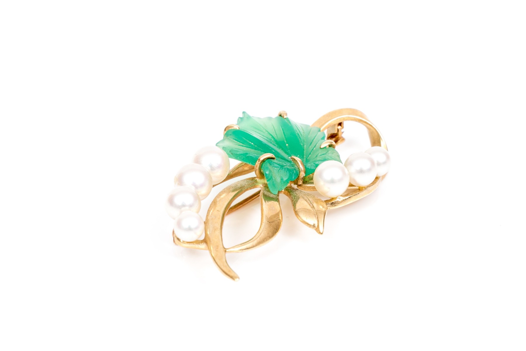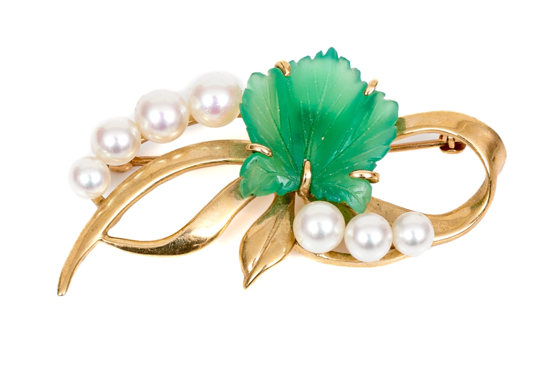 14k yellow gold pretty cultured pearl and green chalcedony leaf motif swirl brooch, set with 4.25 mm to 5.5 mm cultured pearls