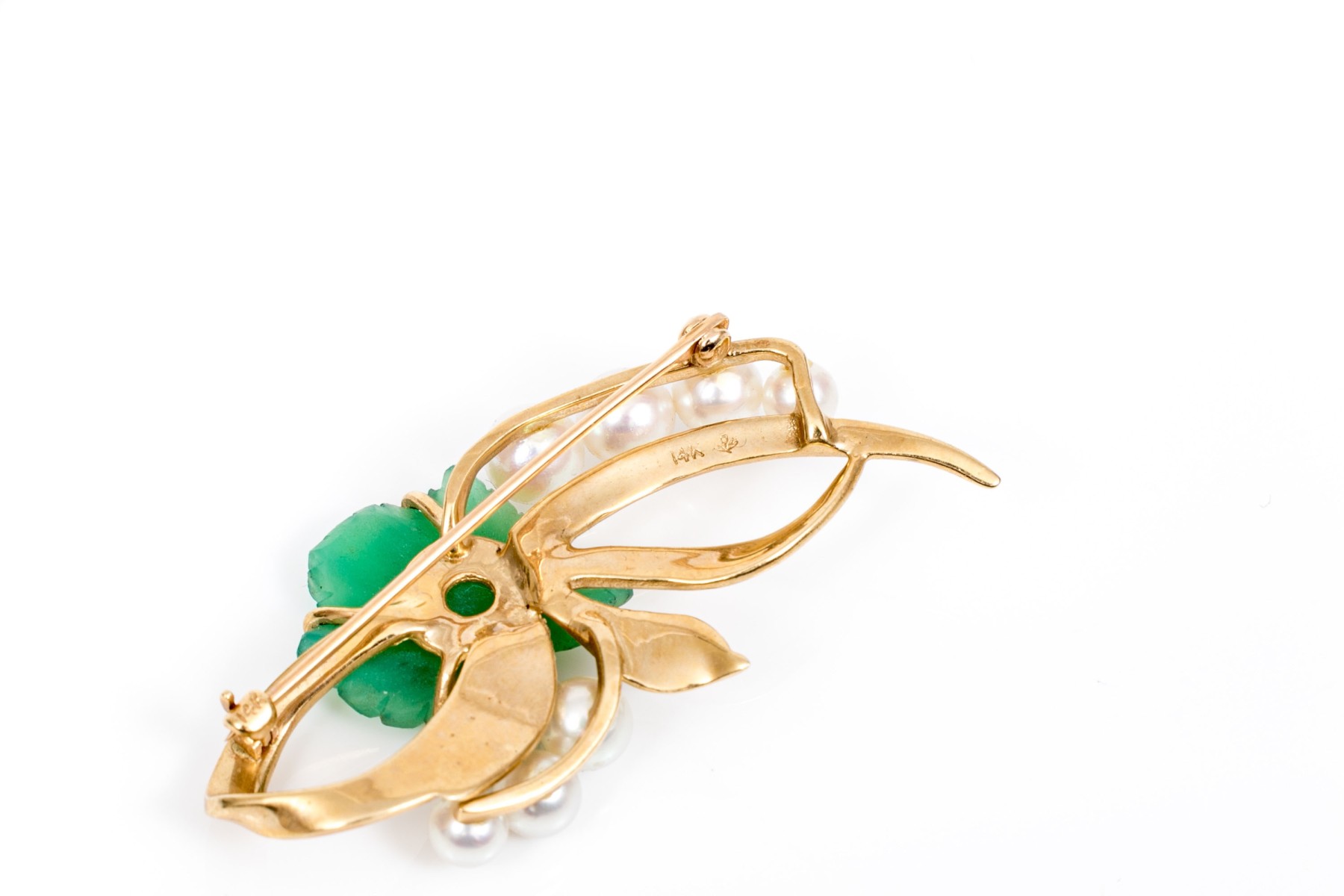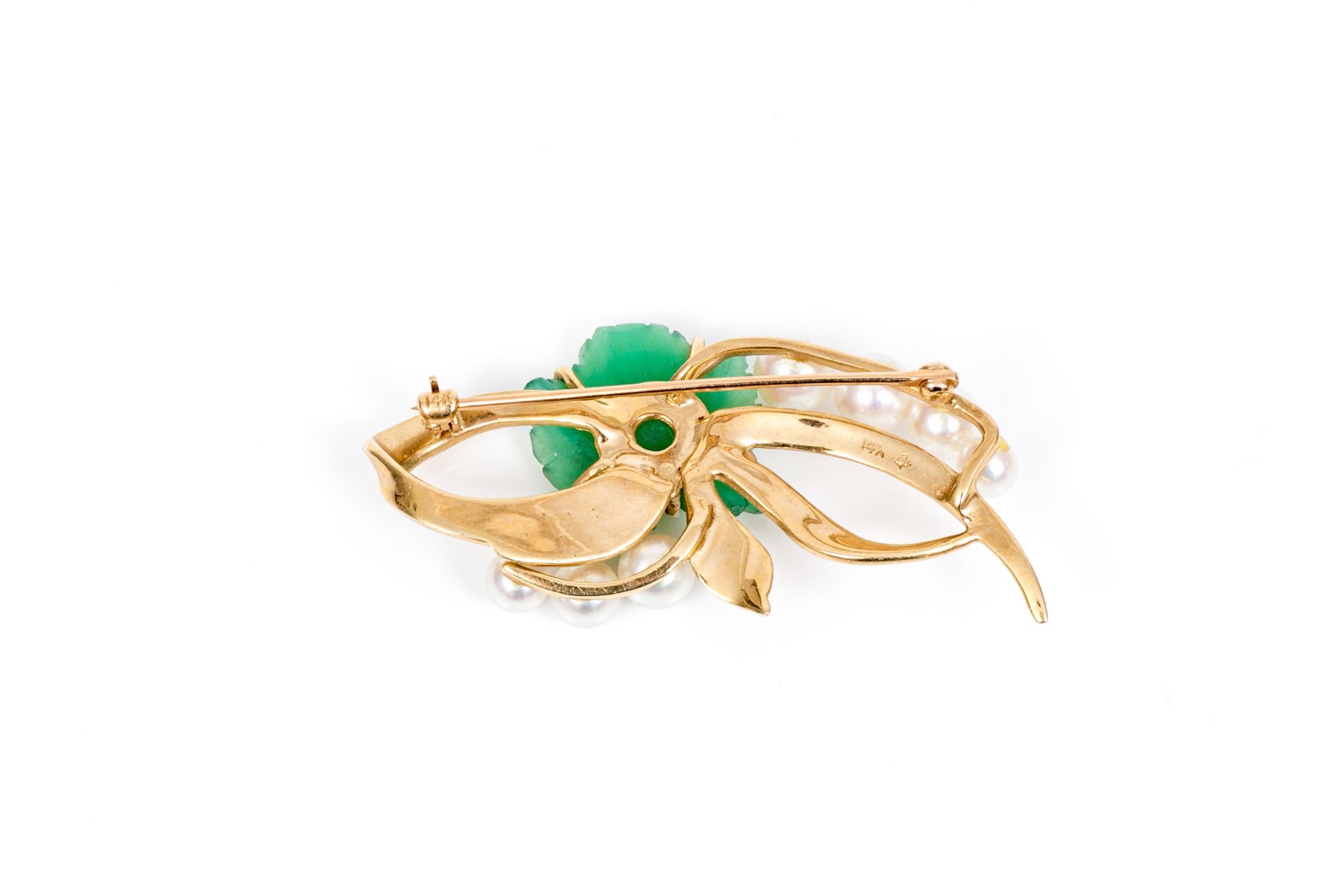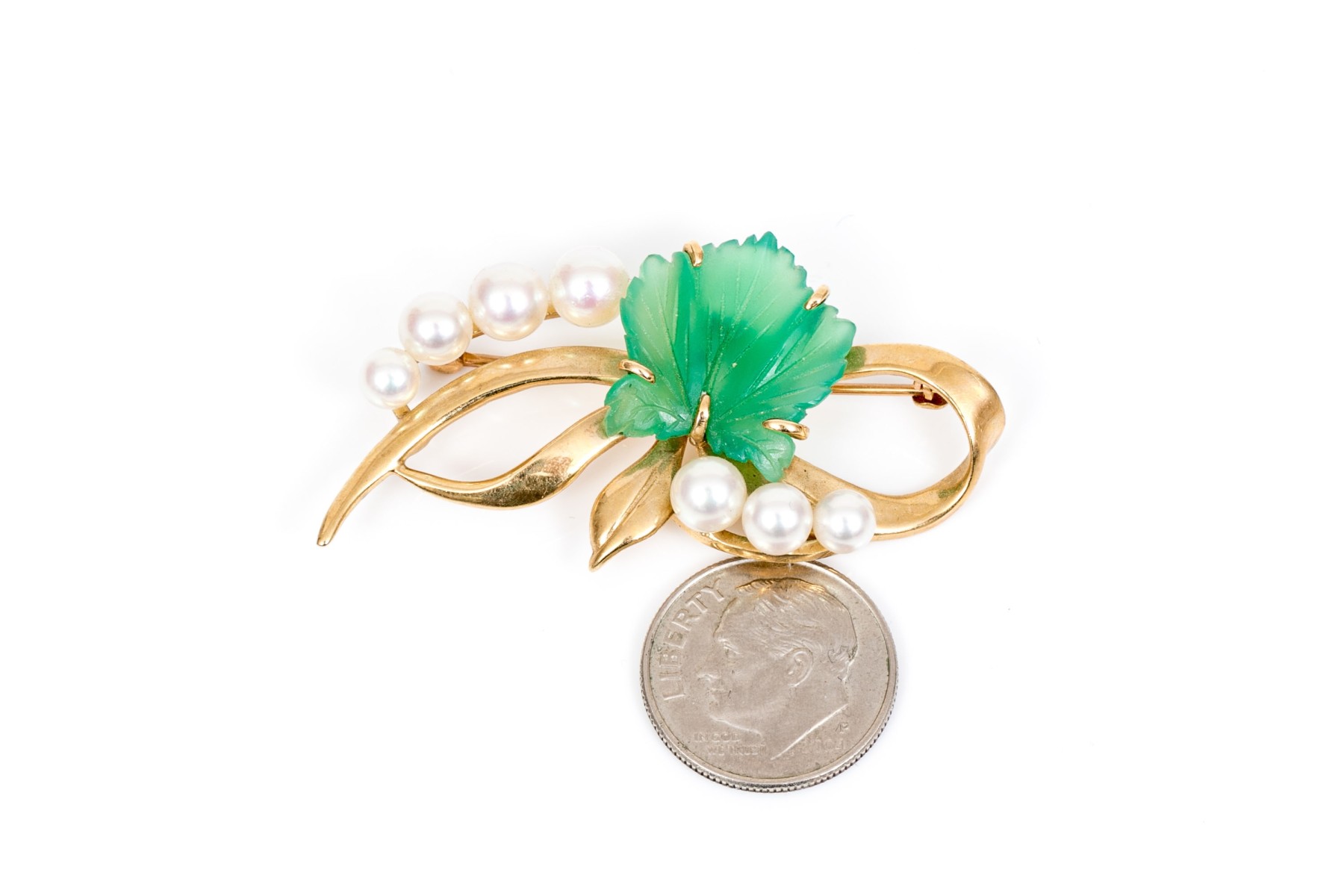 14k yellow gold pretty cultured pearl and green chalcedony leaf motif swirl brooch, set with 4.25 mm to 5.5 mm cultured pearls