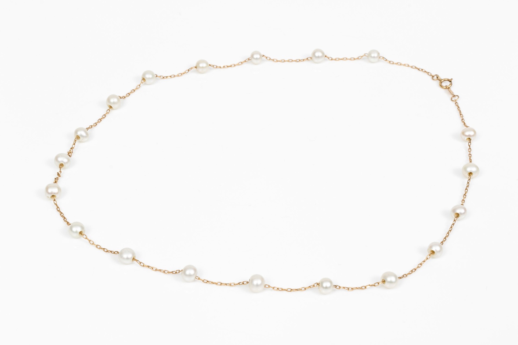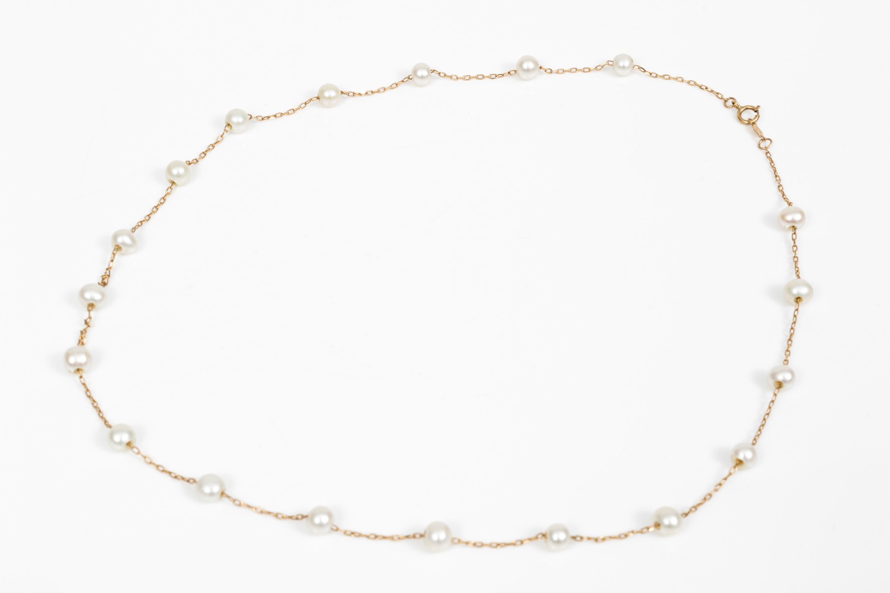 14k yellow gold pretty cultured white freshwater pearl tin cup style necklace, consisting of a curb link and finished with a spring ring style clasp