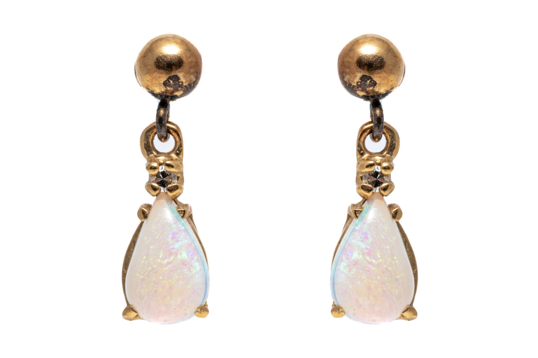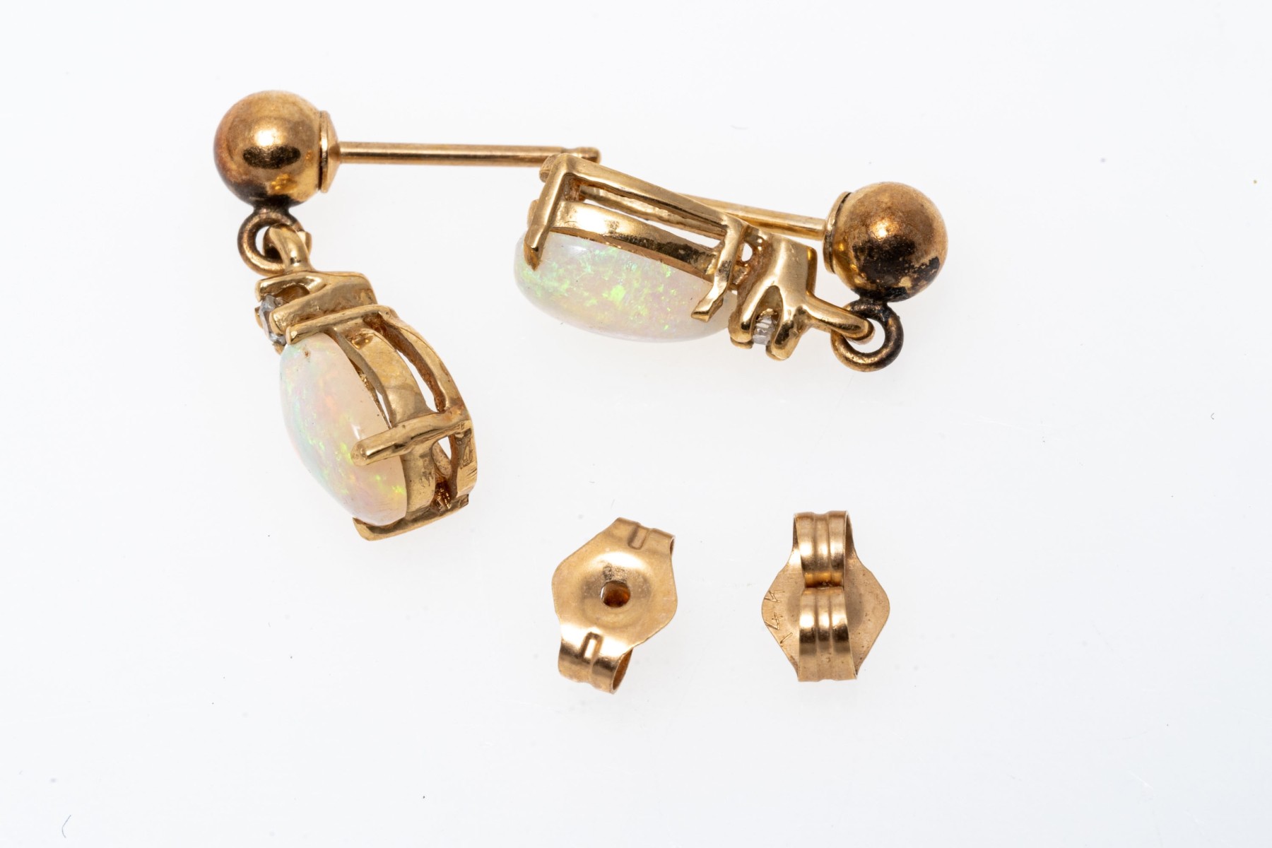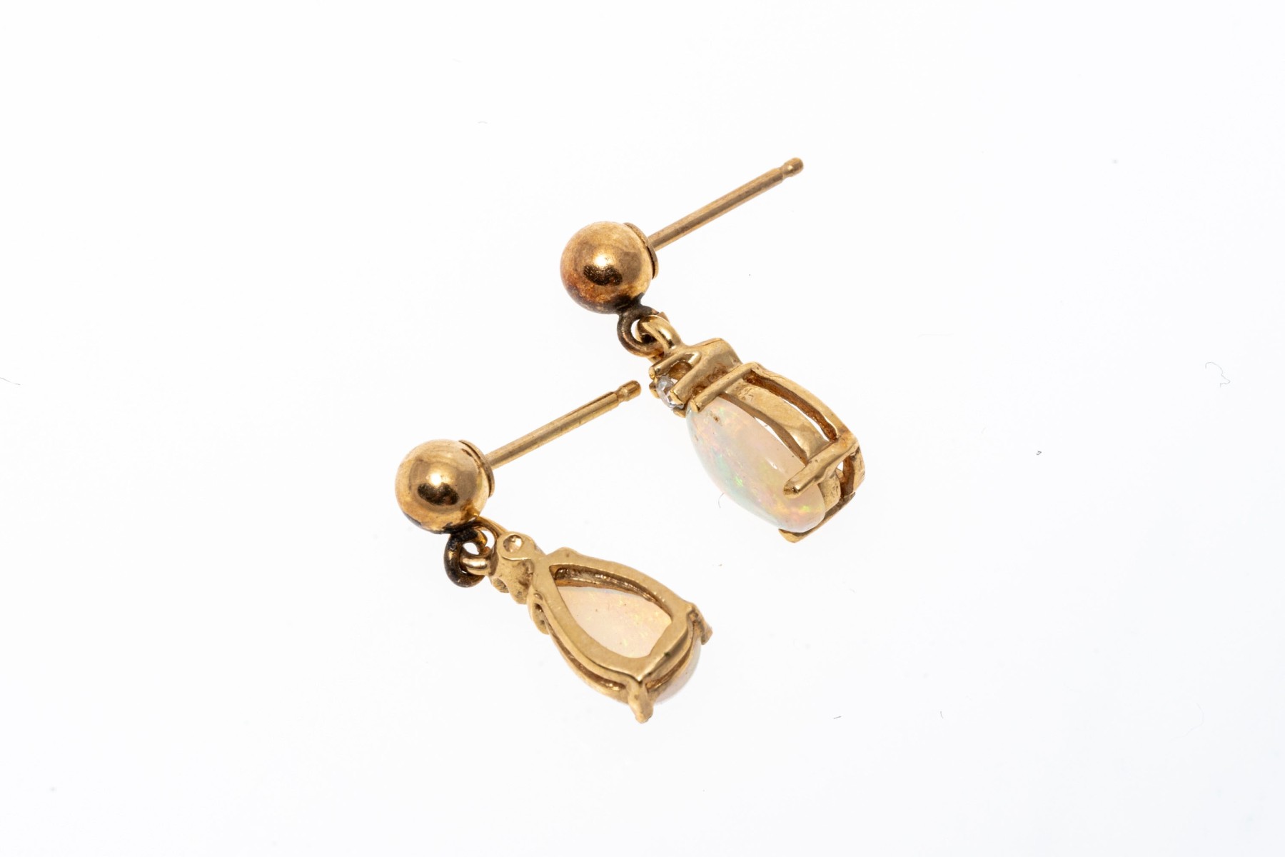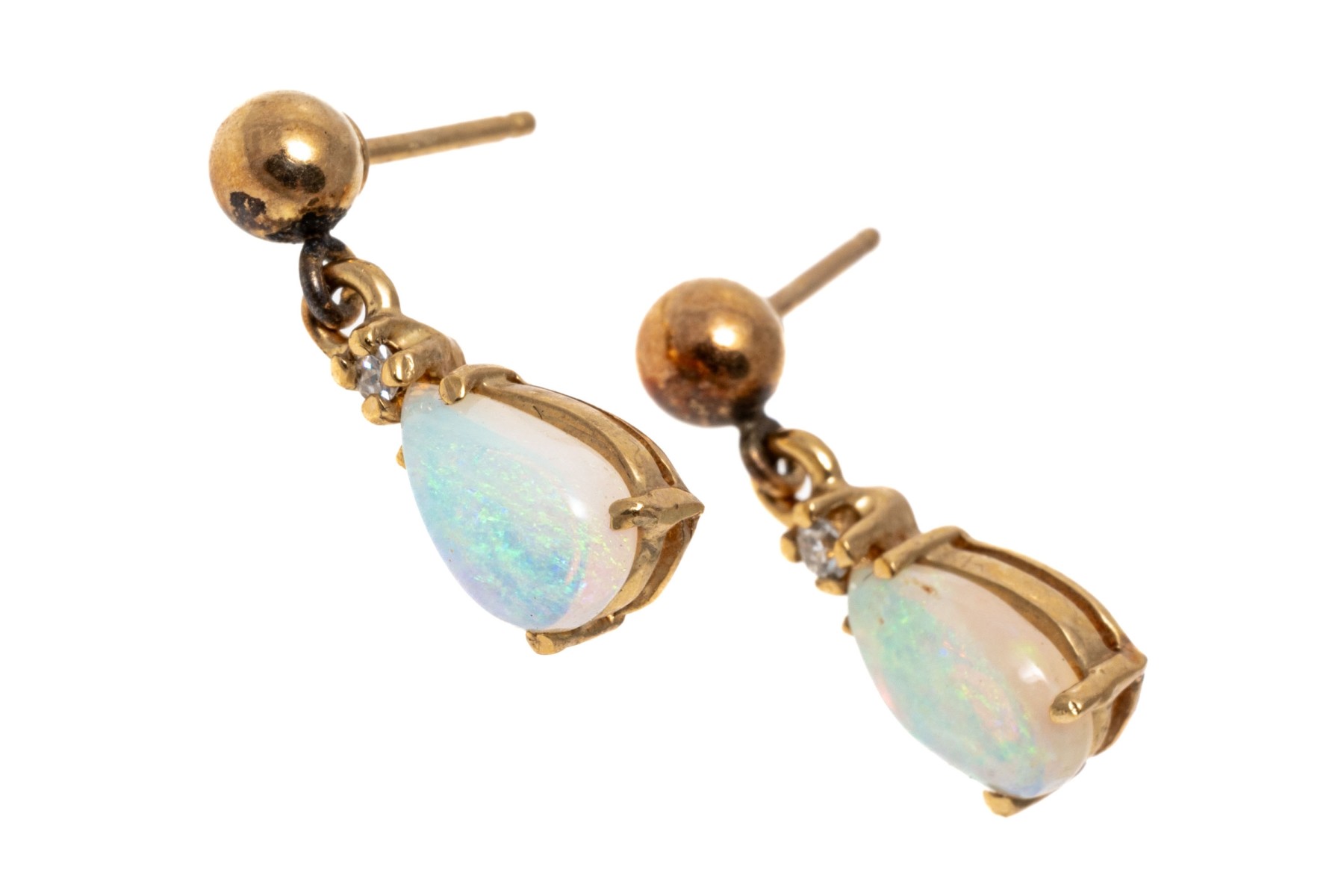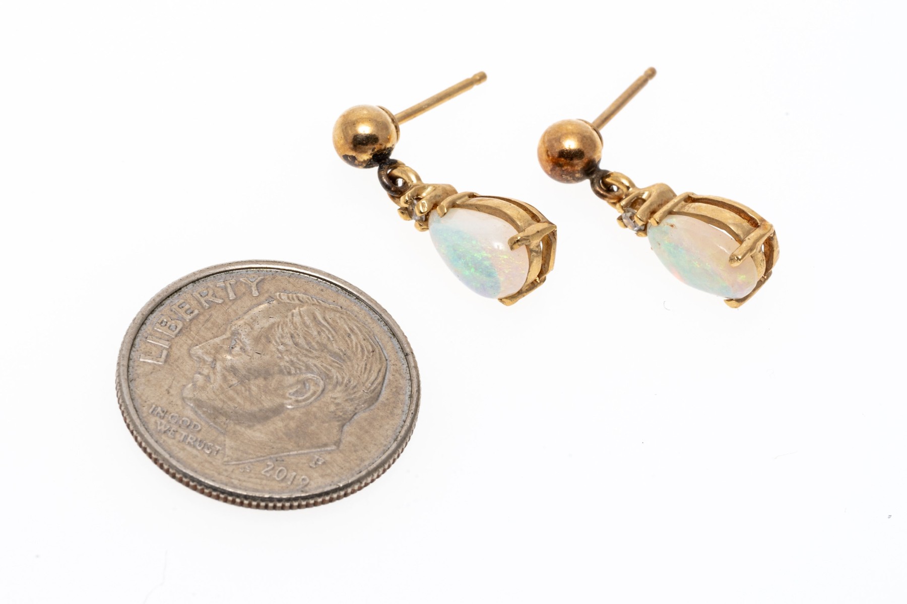 14k yellow gold pretty diamond accented pear white opal drop pendant earrings, finished with posts and clutch style backs, app .0.02 TCW