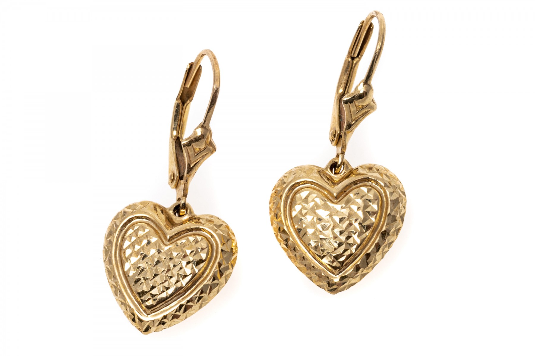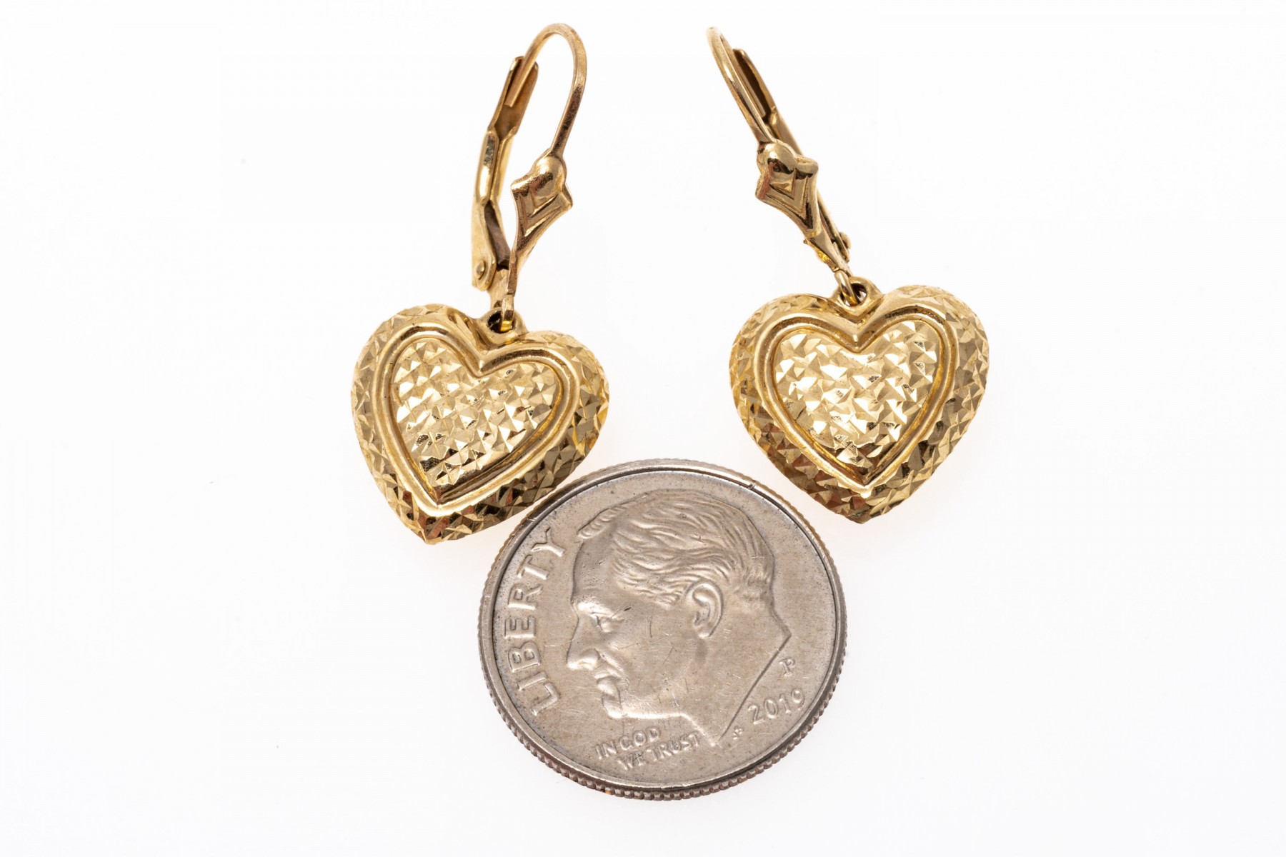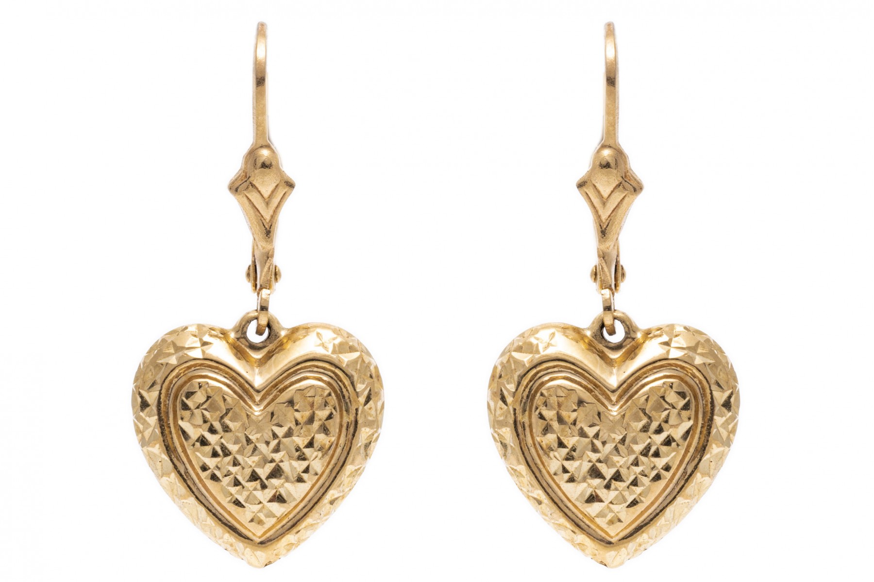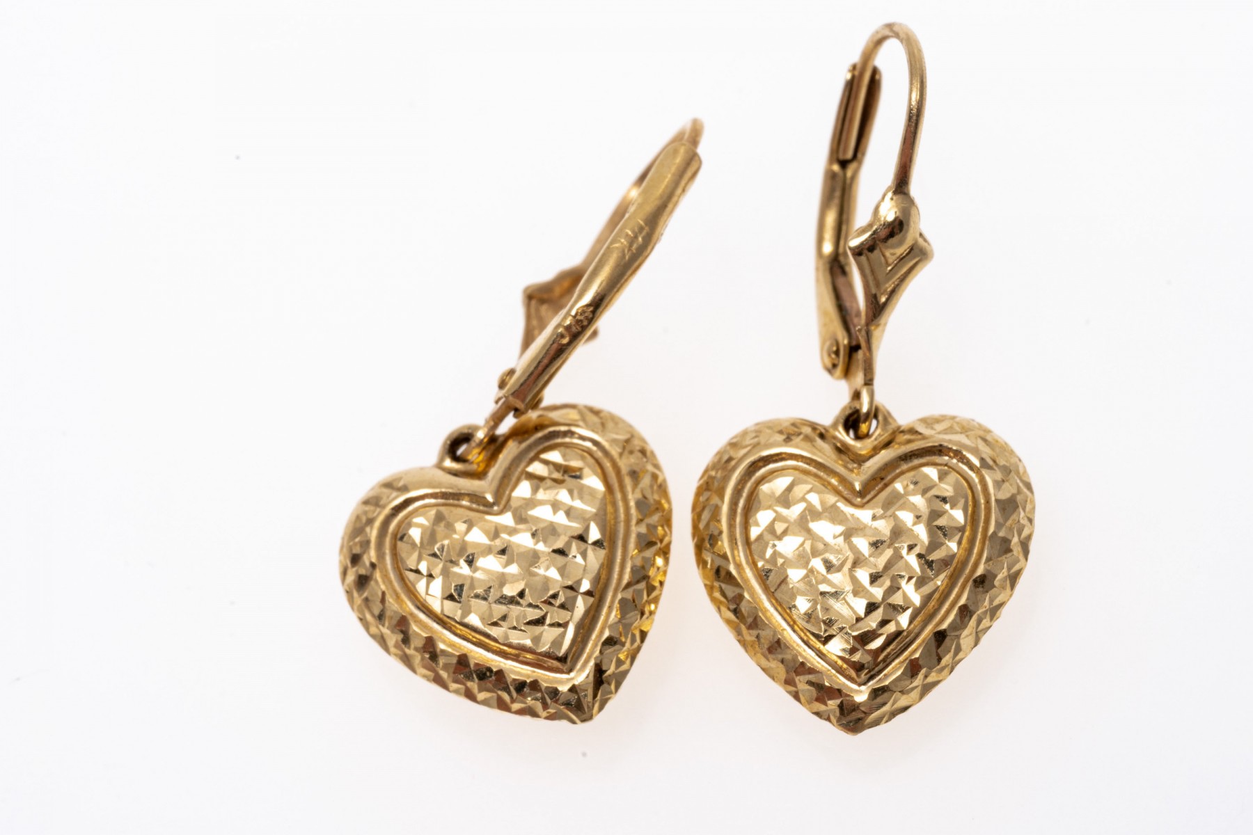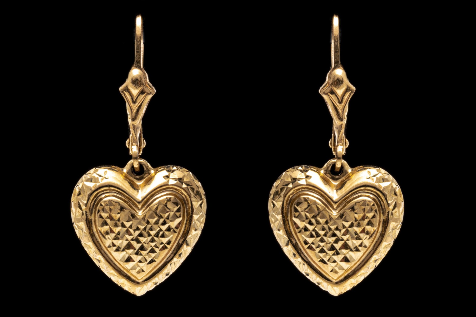 14k yellow gold earrings. These pretty yellow gold drop earrings feature a puffed heart dangle, with diamond cut patterning. The earrings have wires, with lever style backs.