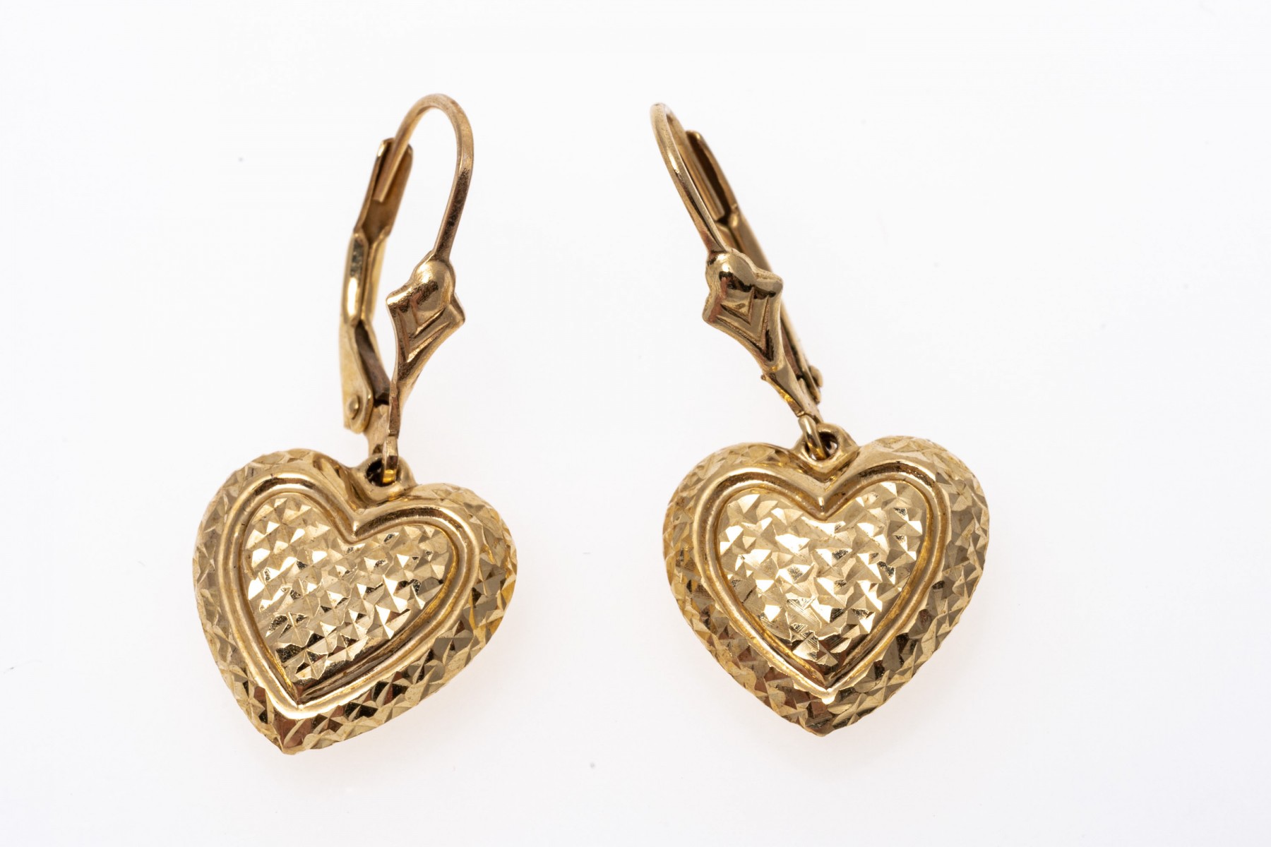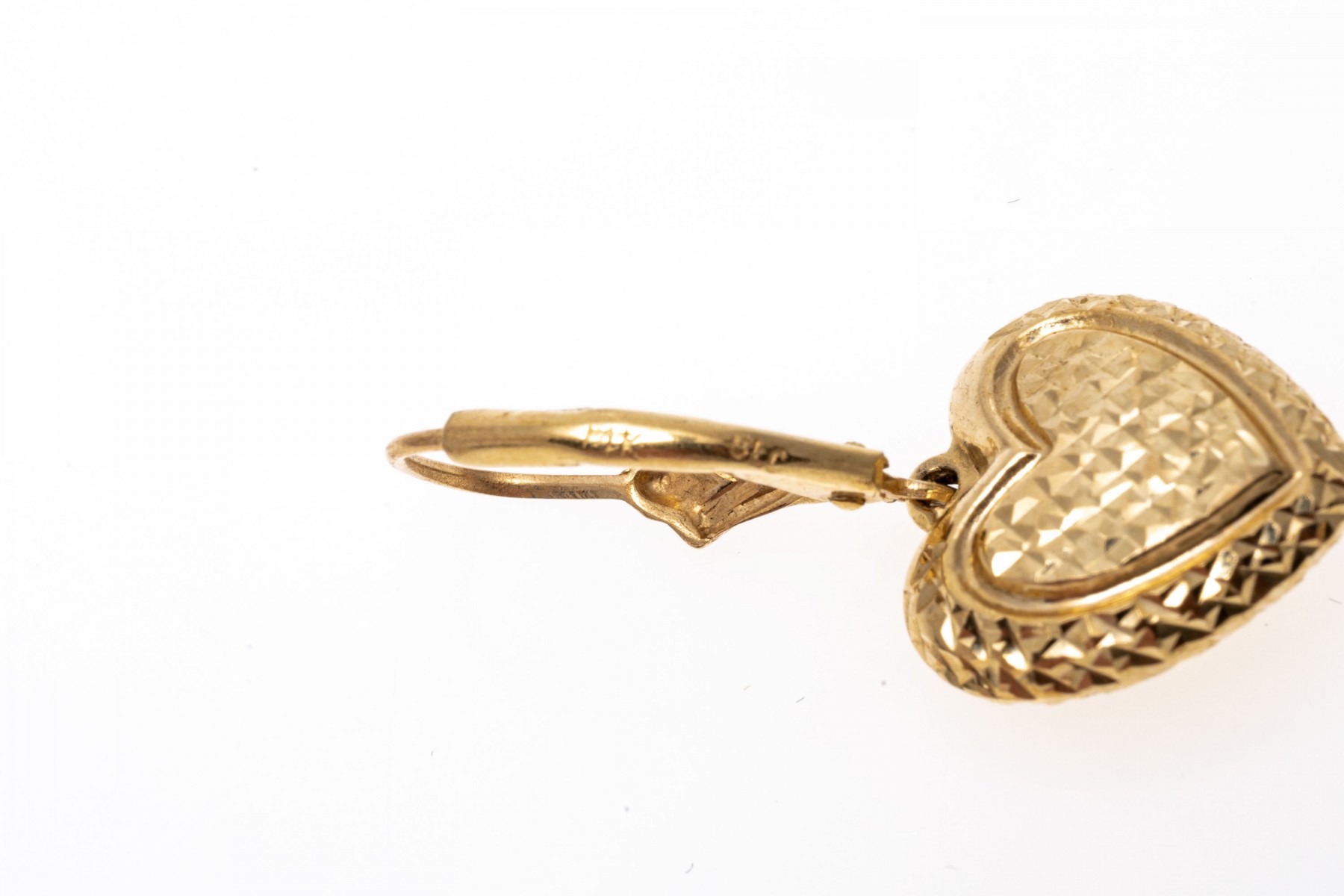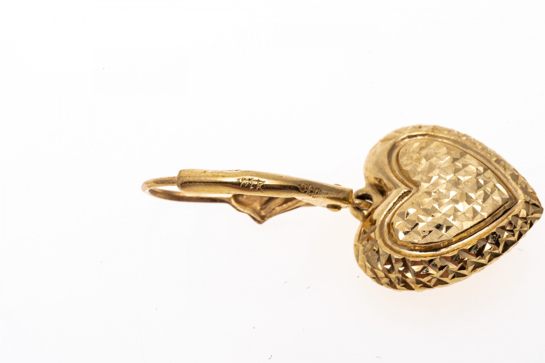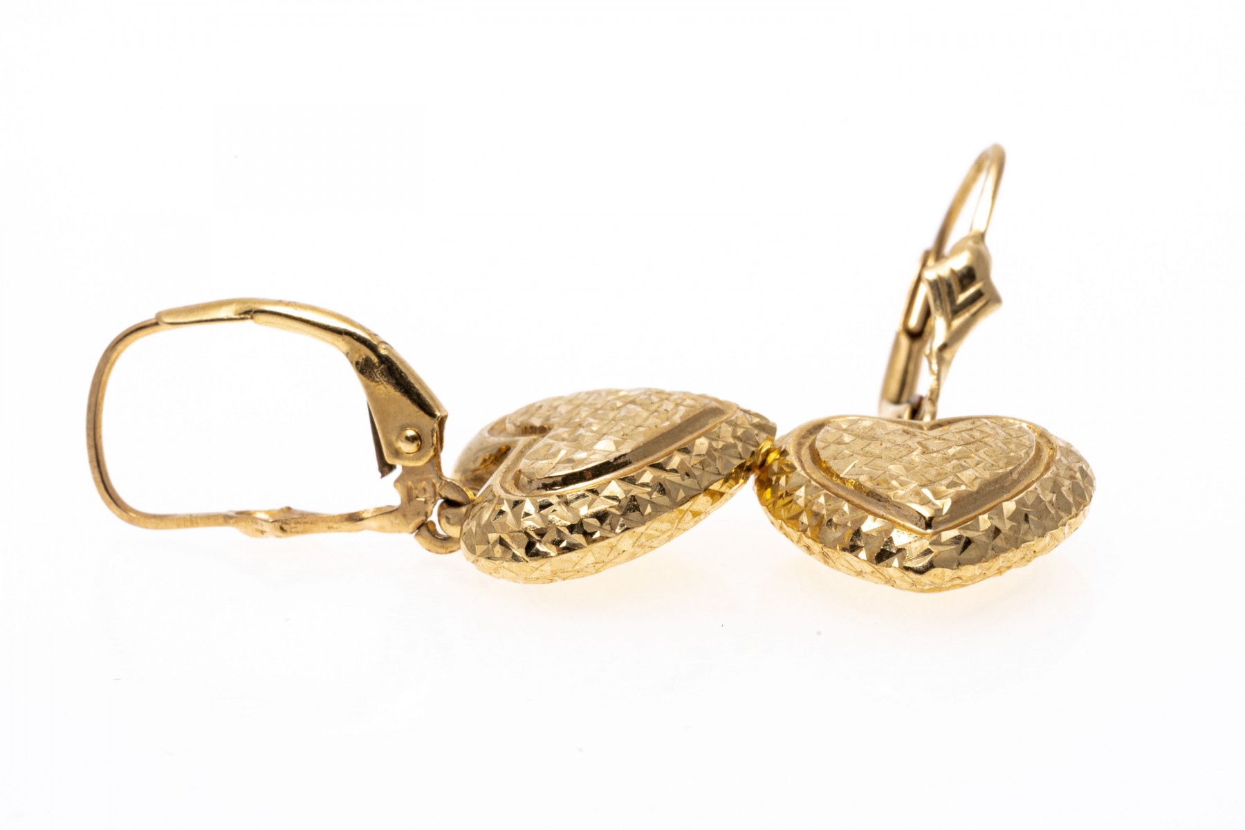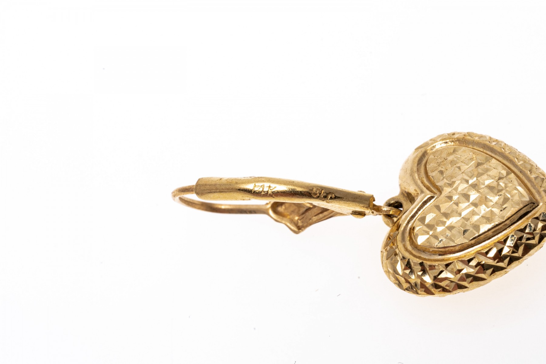 14k yellow gold earrings. These pretty yellow gold drop earrings feature a puffed heart dangle, with diamond cut patterning. The earrings have wires, with lever style backs.