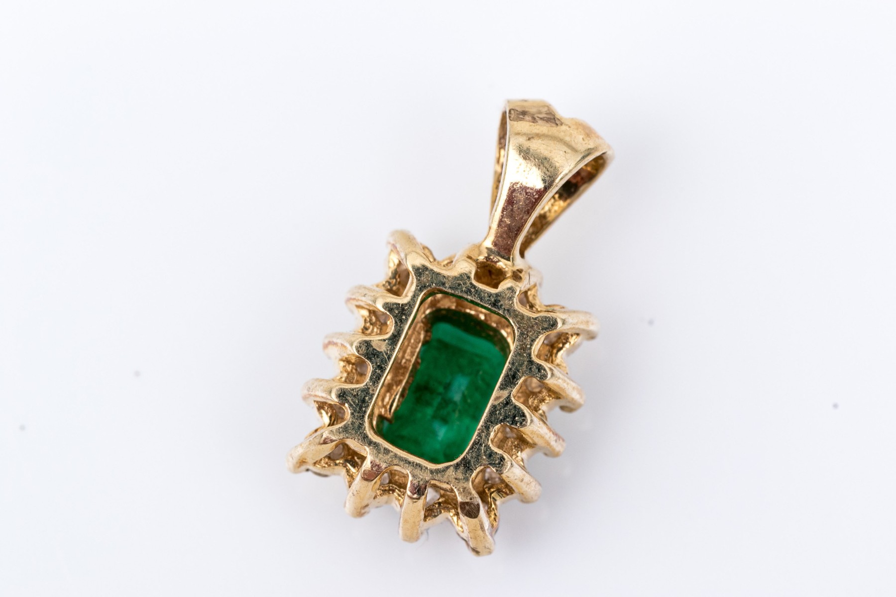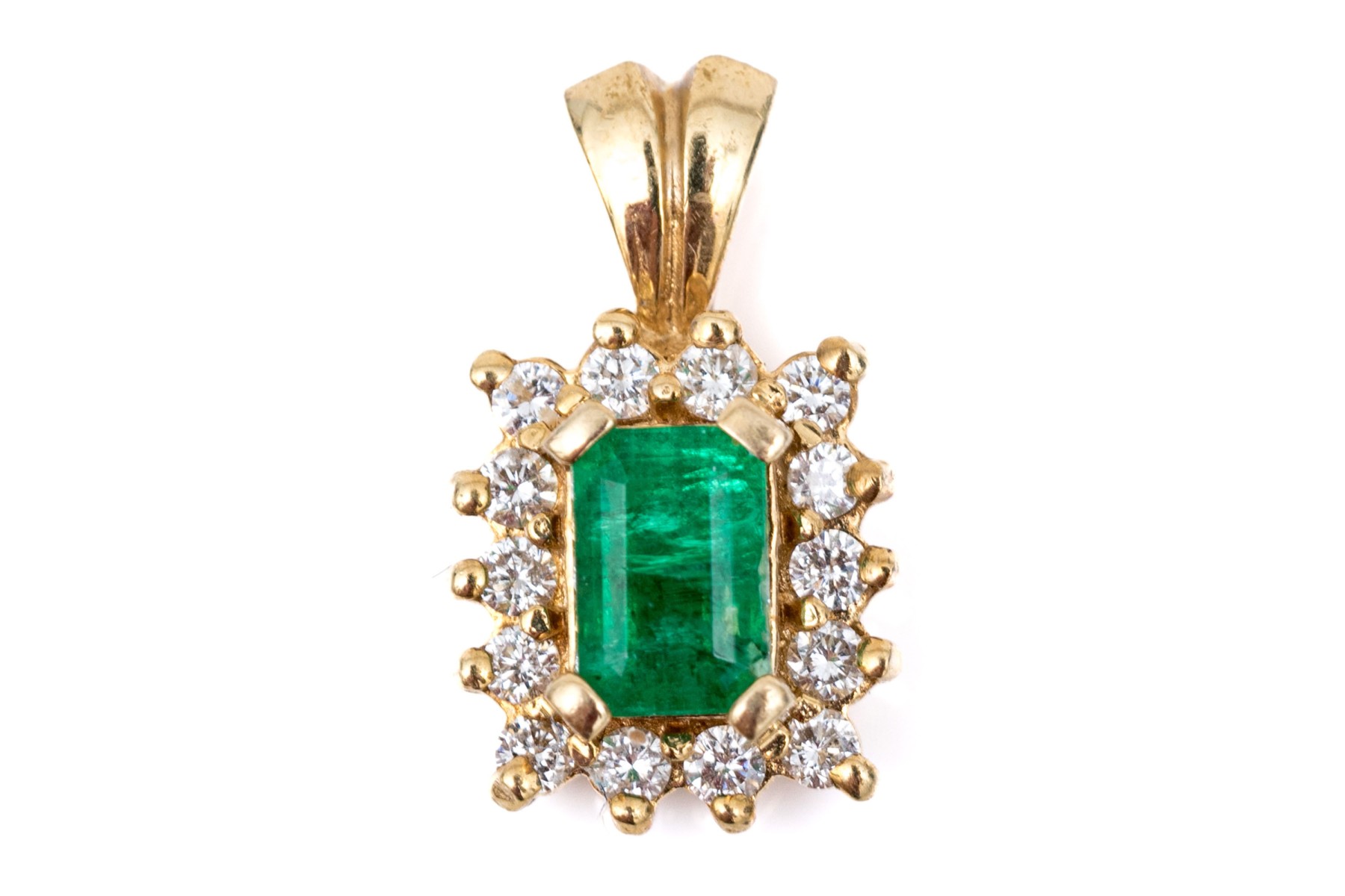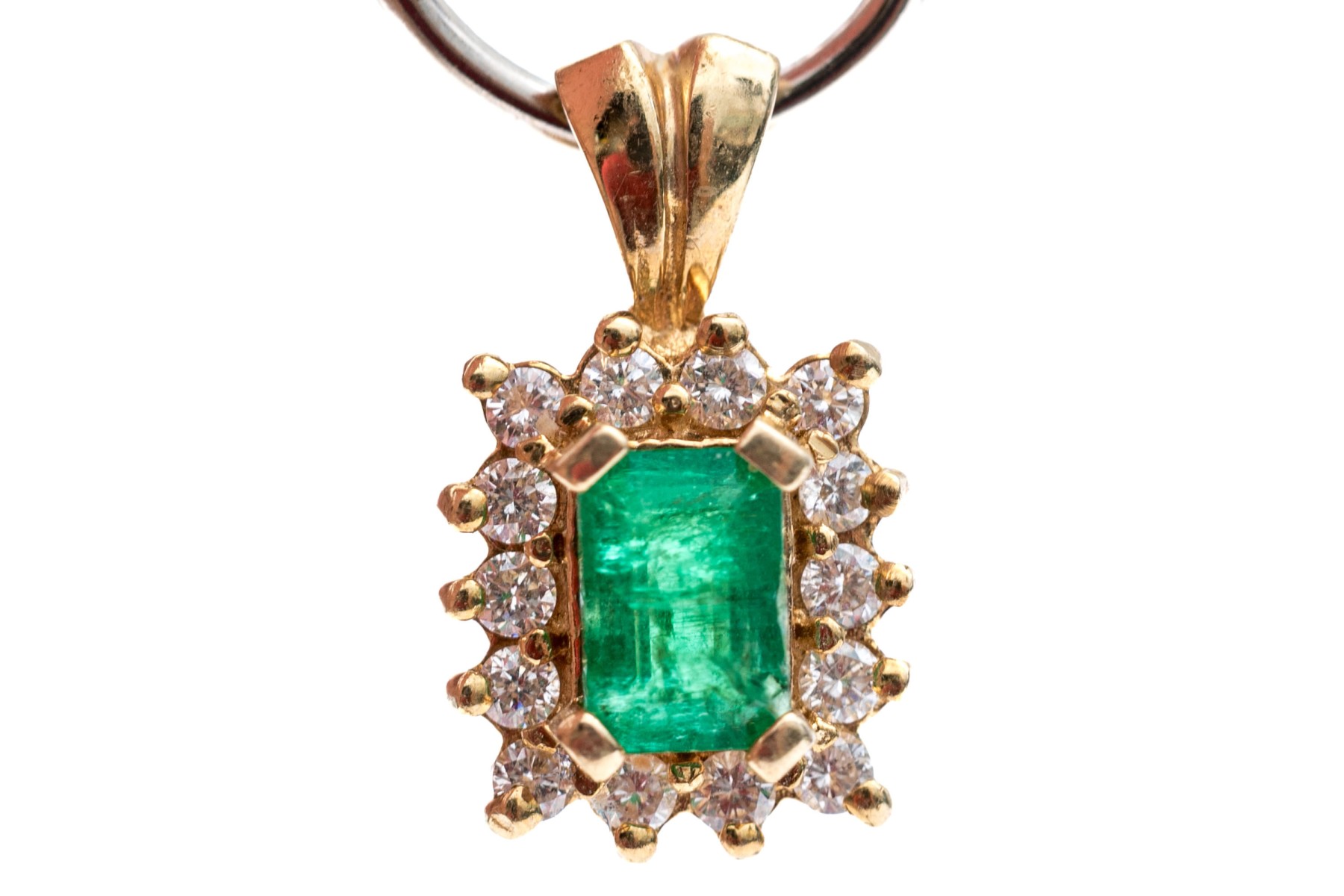 14k yellow gold pretty emerald cut emerald and diamond halo pendant, emerald app. 0.33 CTS, and diamonds app. 0.14 TCW, prong set, finished with a split bale