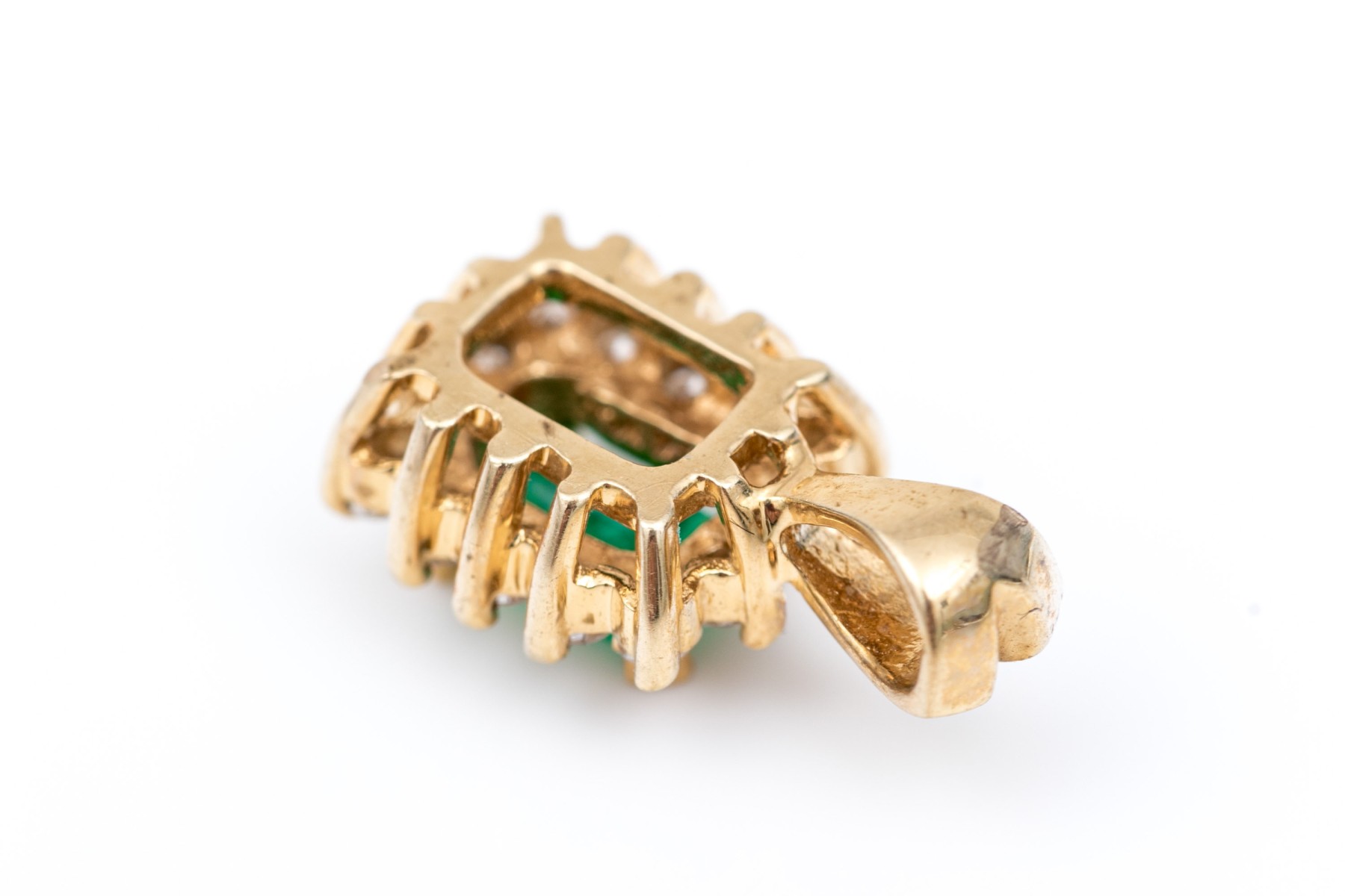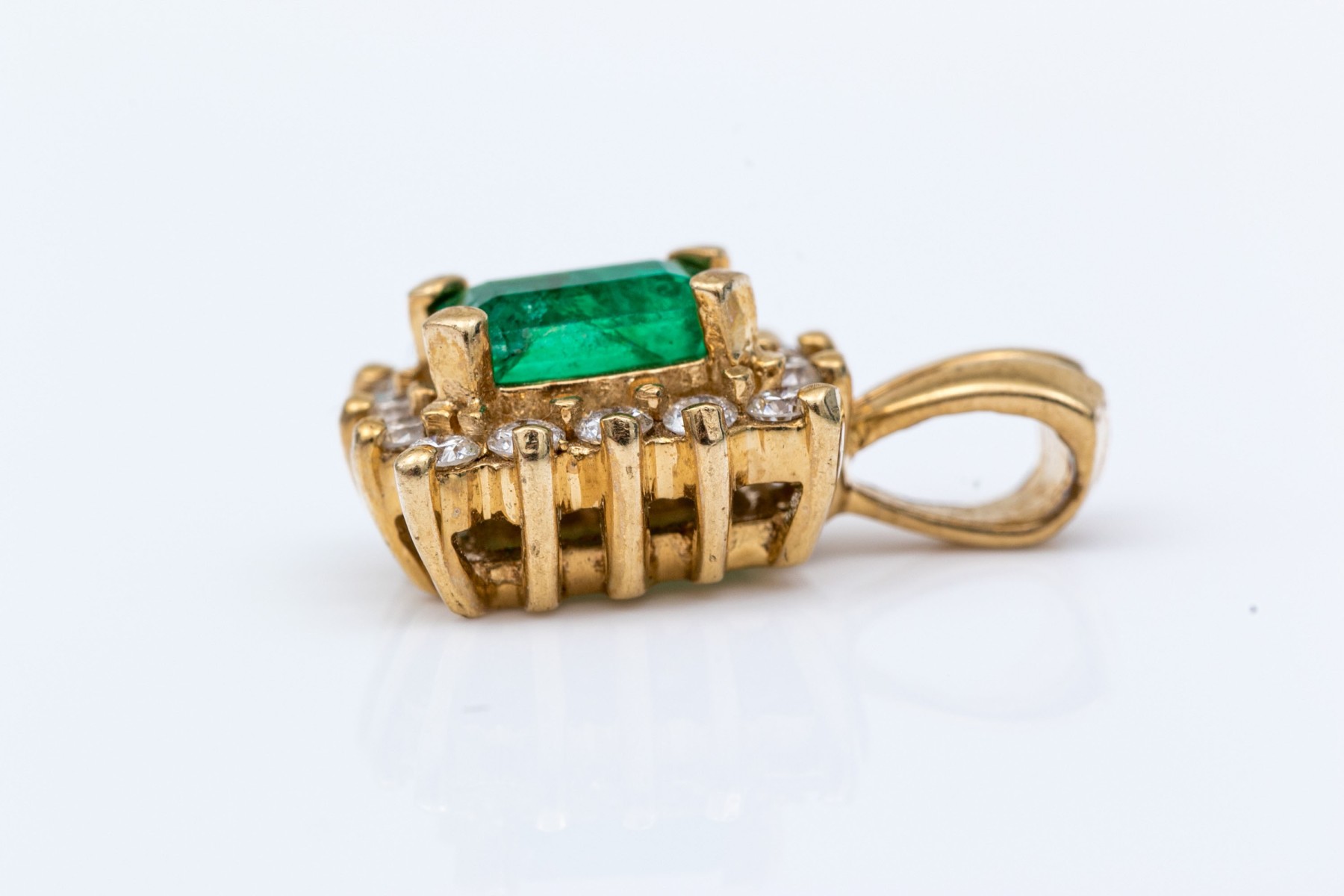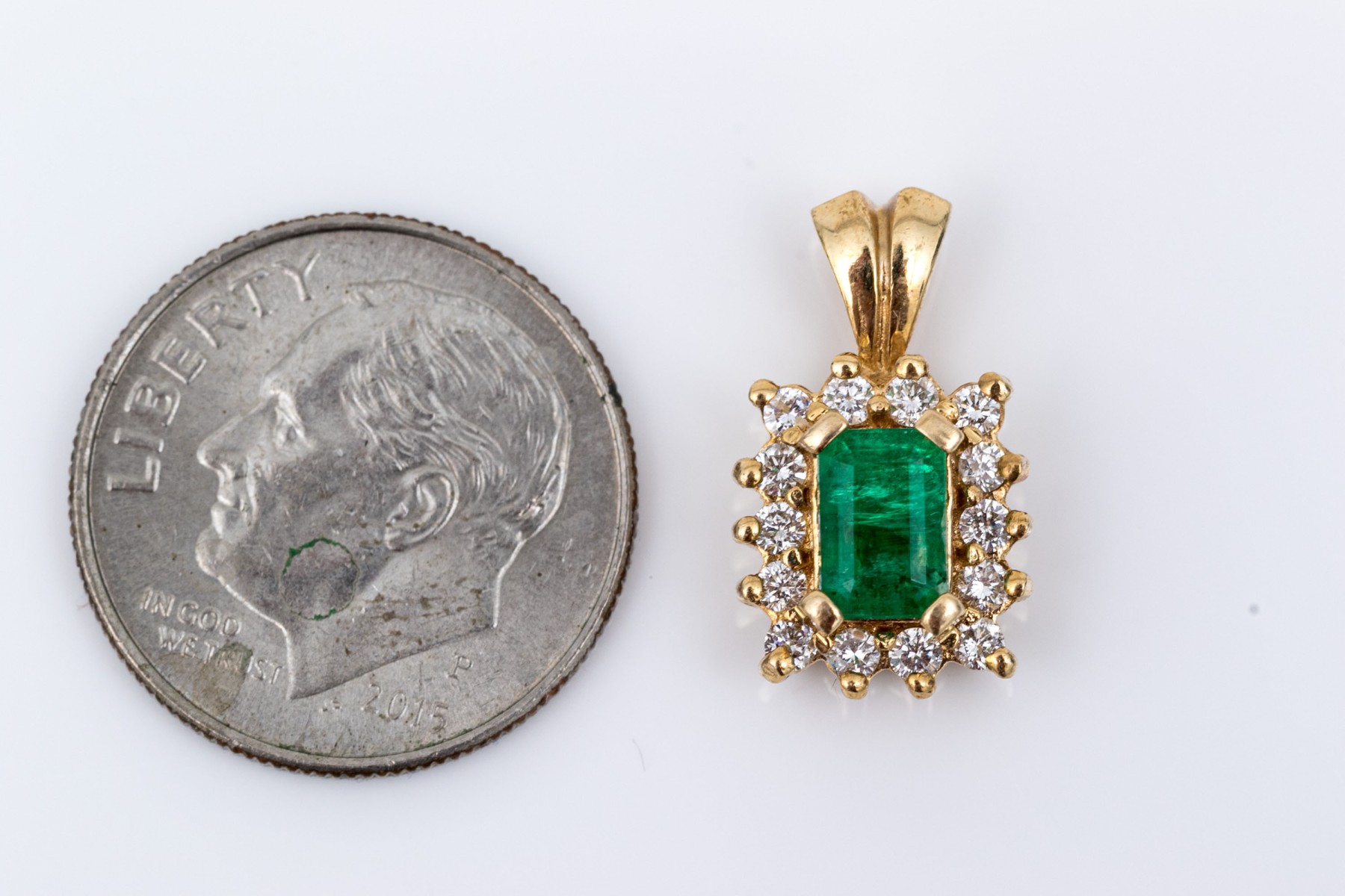 14k yellow gold pretty emerald cut emerald and diamond halo pendant, emerald app. 0.33 CTS, and diamonds app. 0.14 TCW, prong set, finished with a split bale