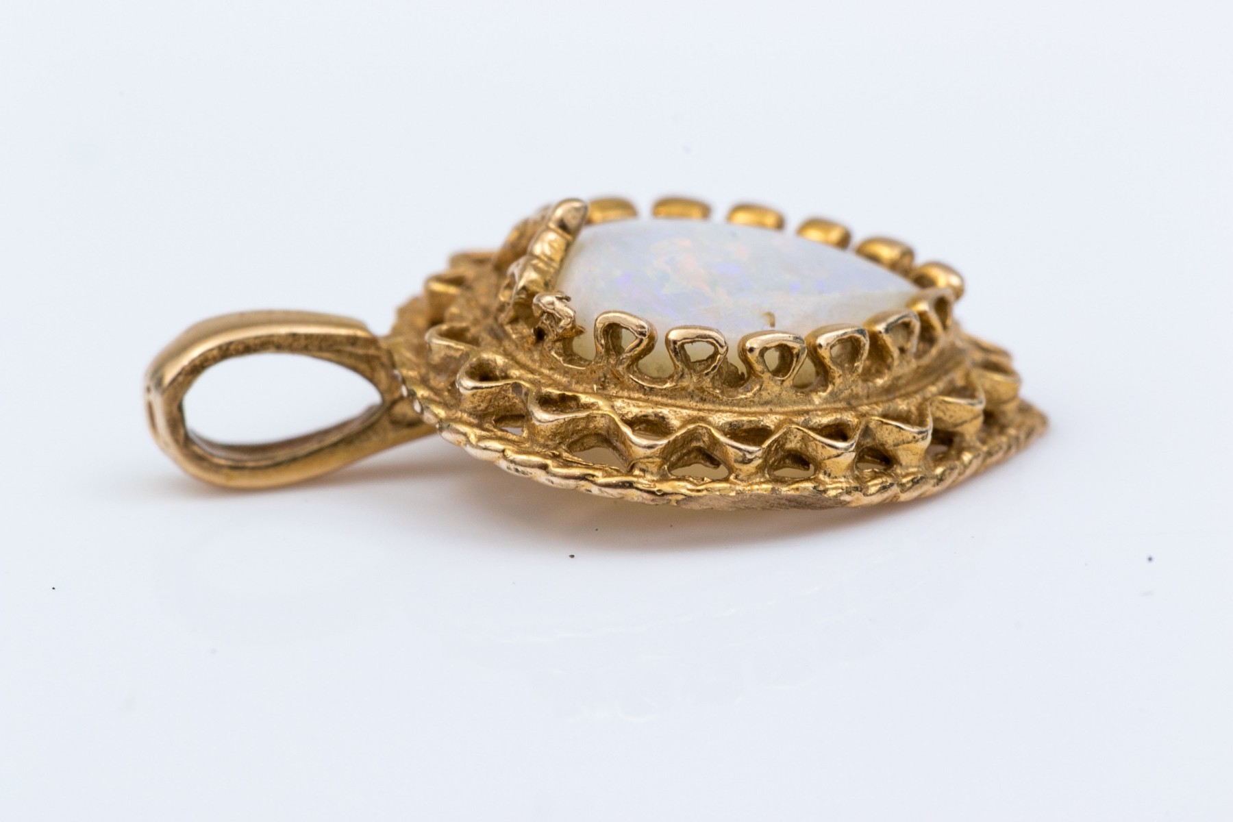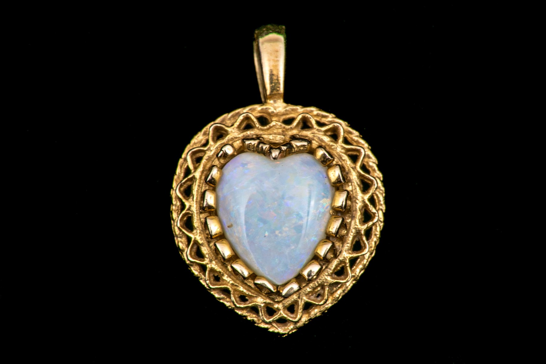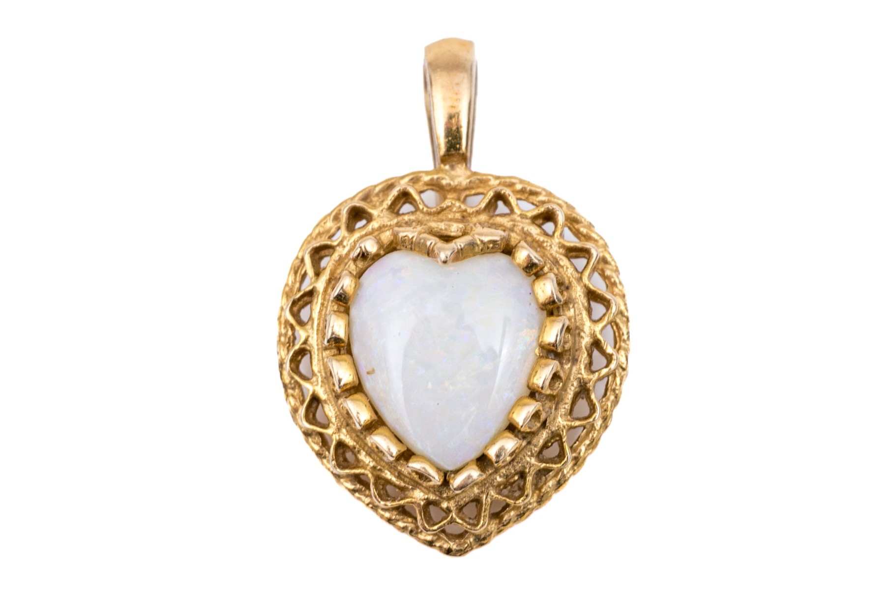 14k yellow gold pretty filigree framed opal heart pendant, finished with a solid bale