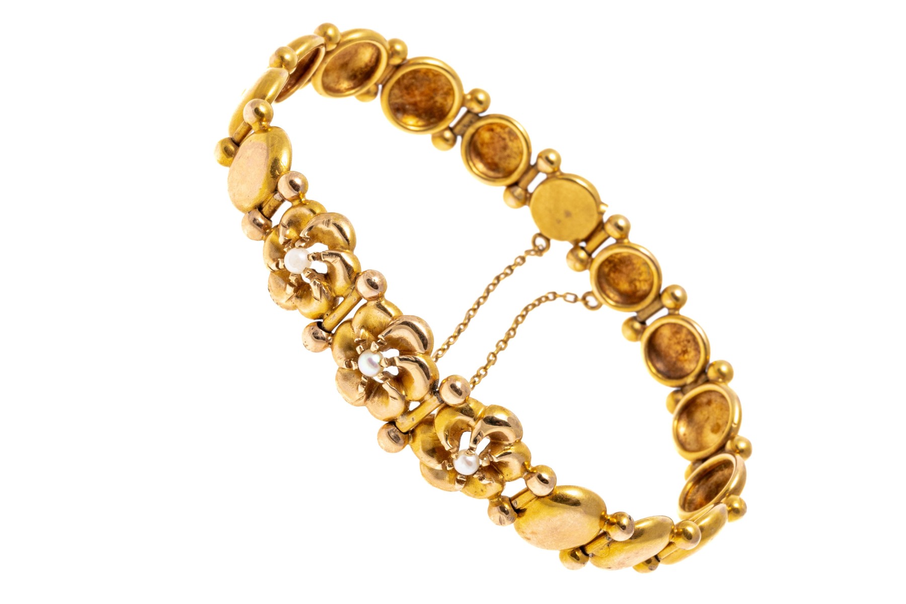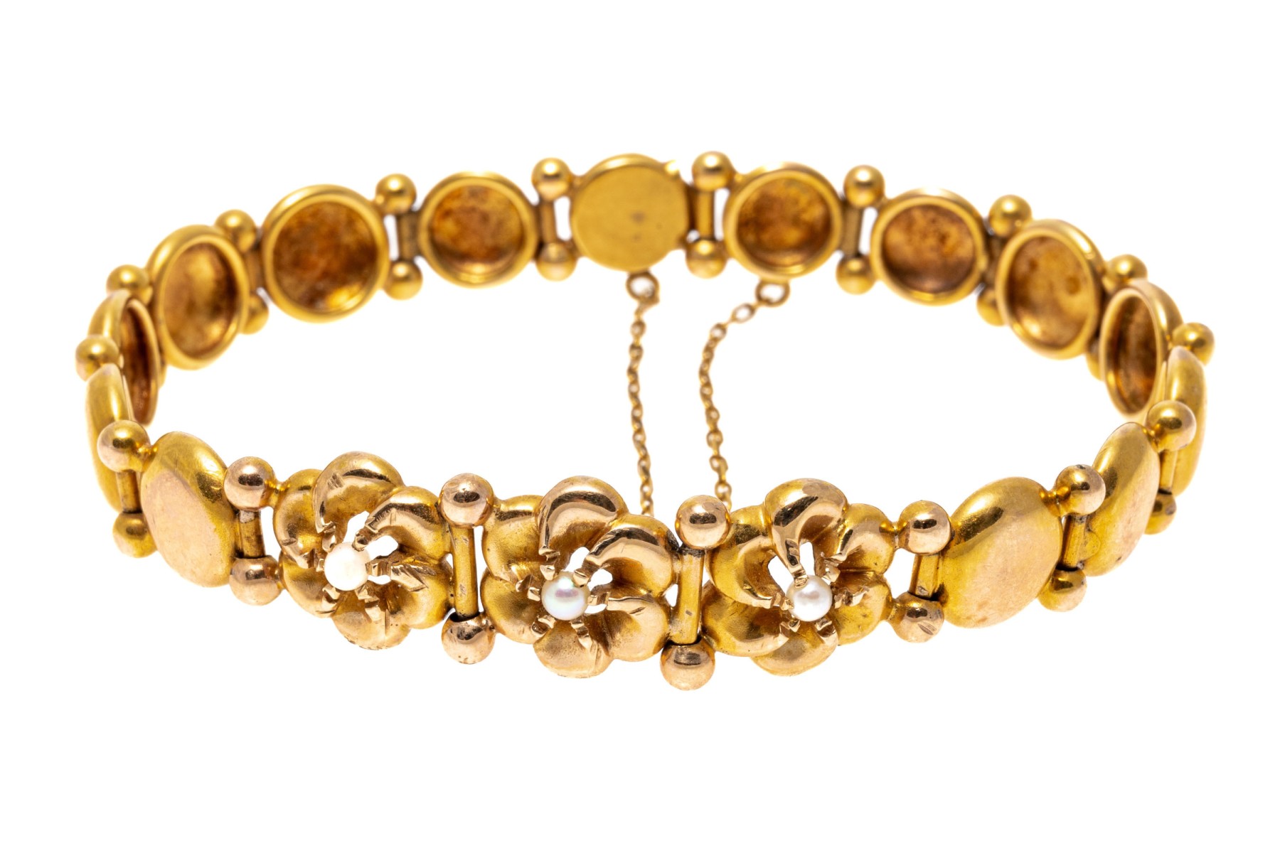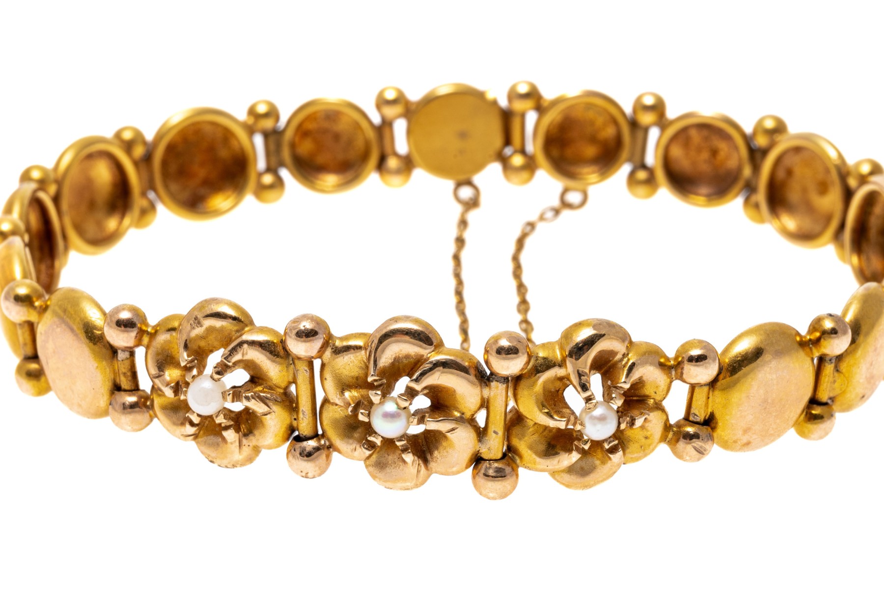 14k yellow gold pretty flower and circle link bracelet, with cultured pearls, finished with a hidden box clasp and a safety chain