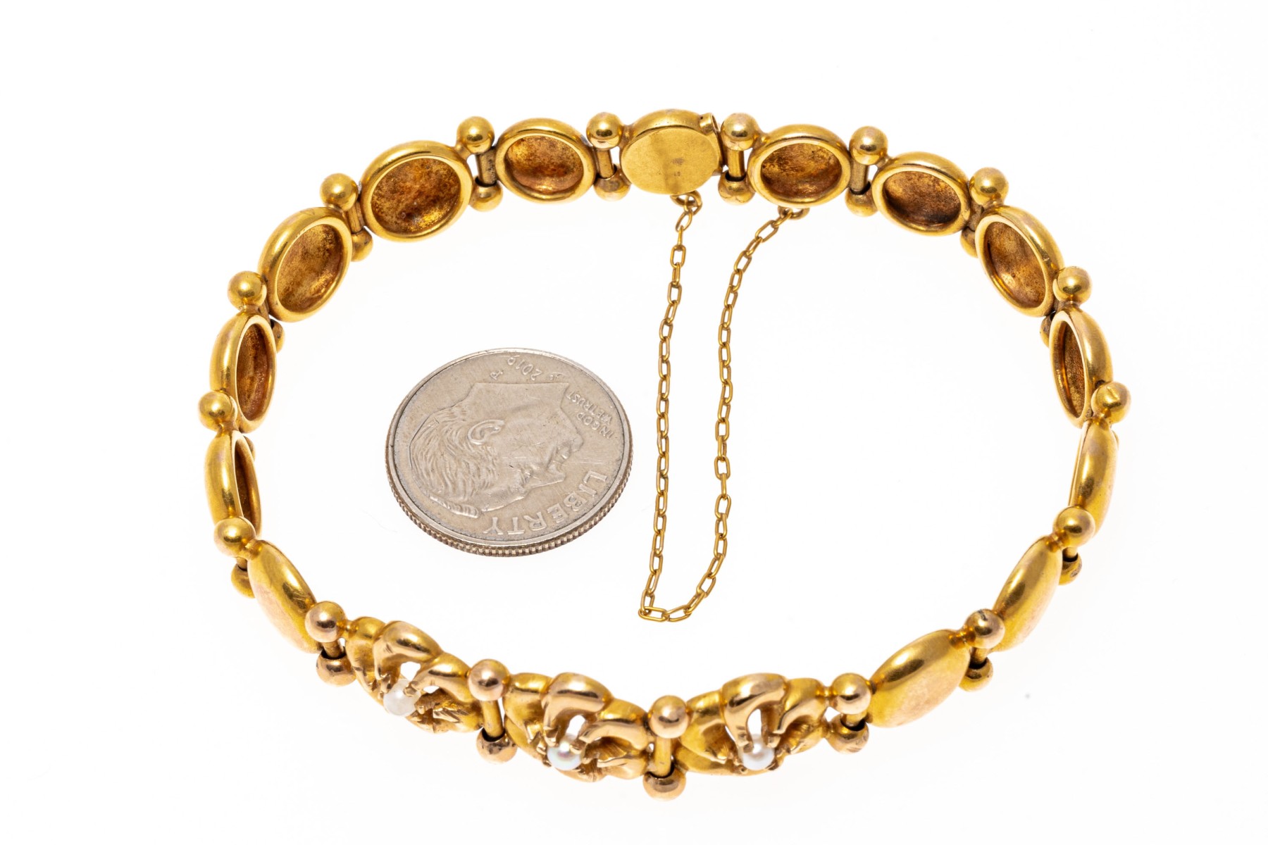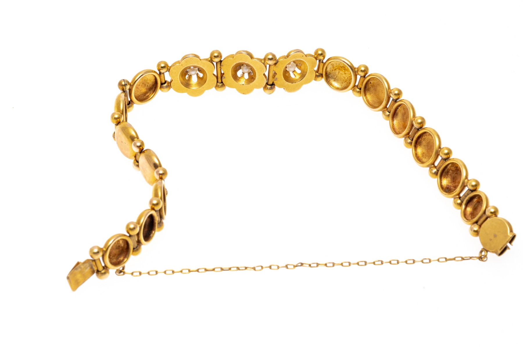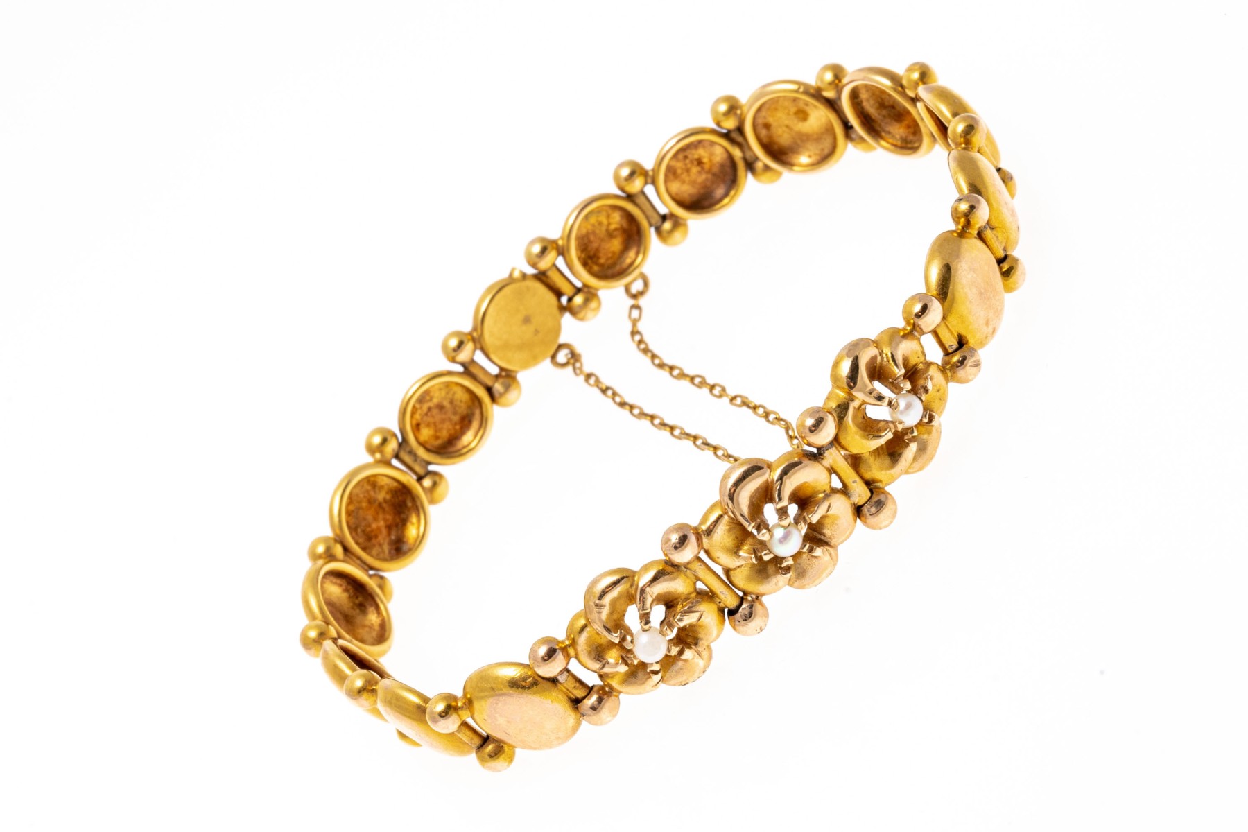 14k yellow gold pretty flower and circle link bracelet, with cultured pearls, finished with a hidden box clasp and a safety chain
