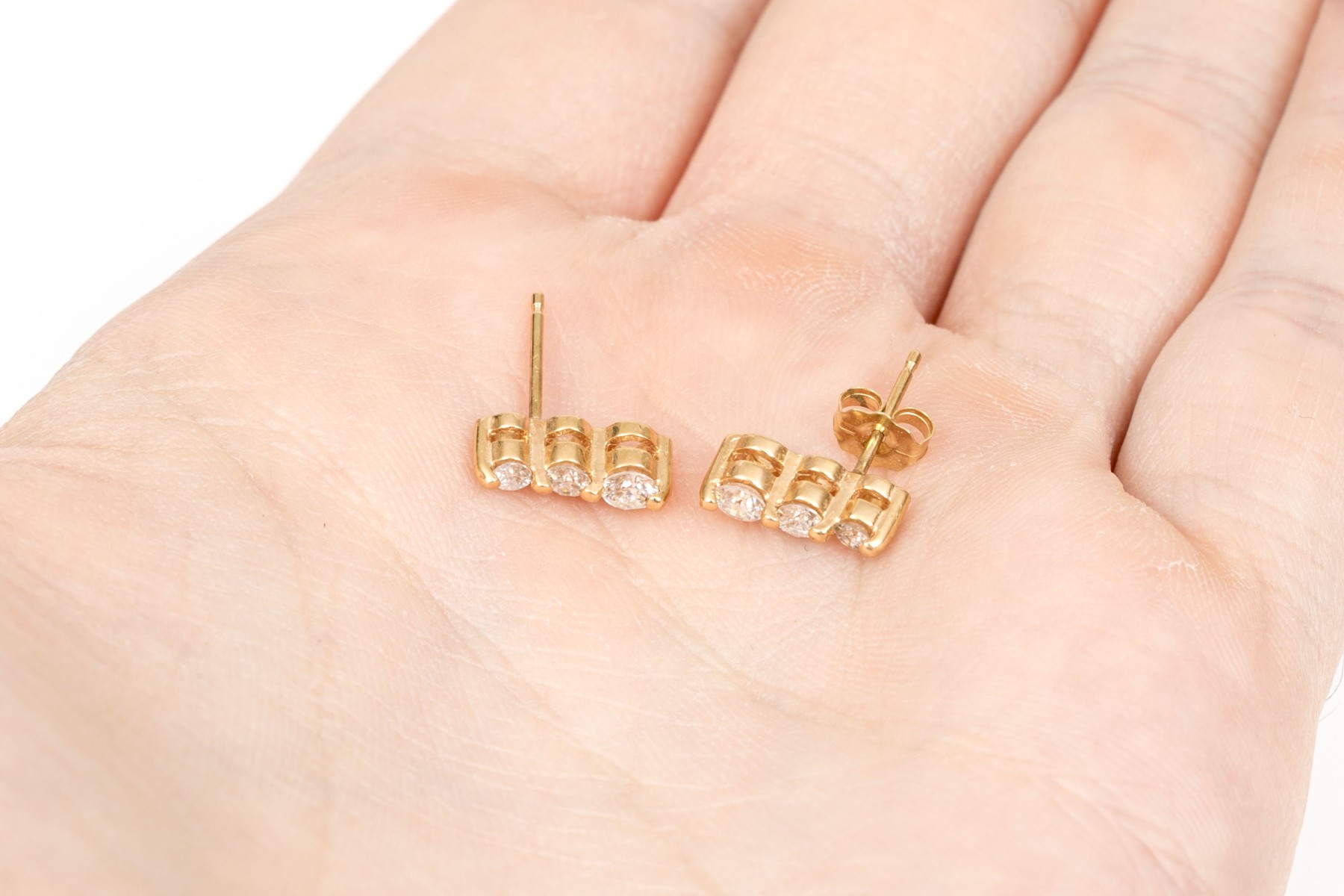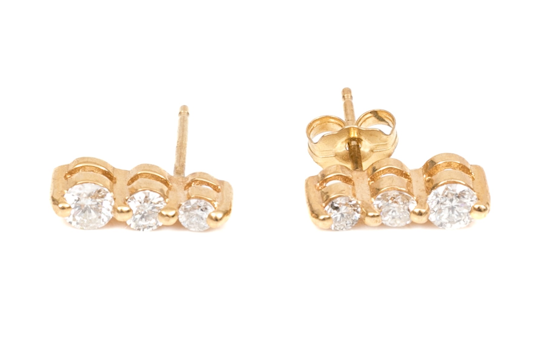 14k yellow gold pretty graduated brilliant diamond triple stack earrings, app. 0.40 TCW, Si2 to I1 clarity, J K to L color, finished with posts and clutch style backs