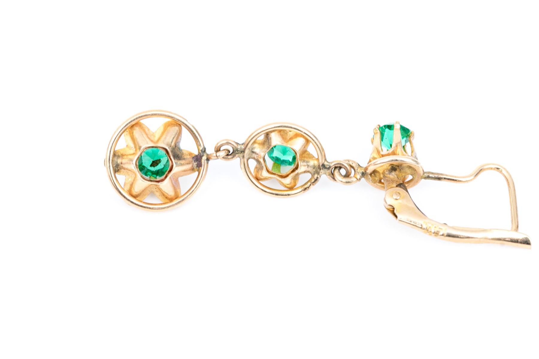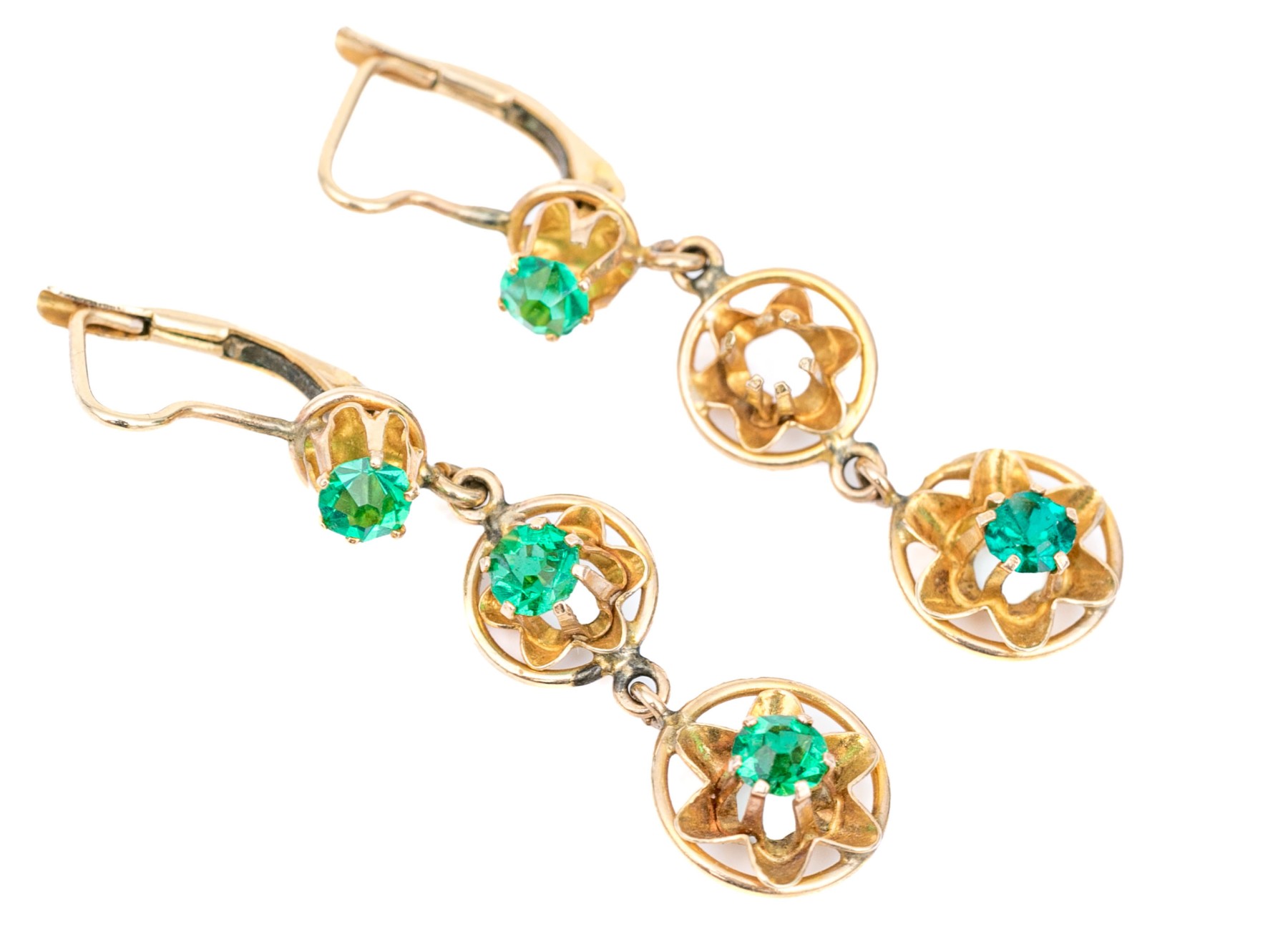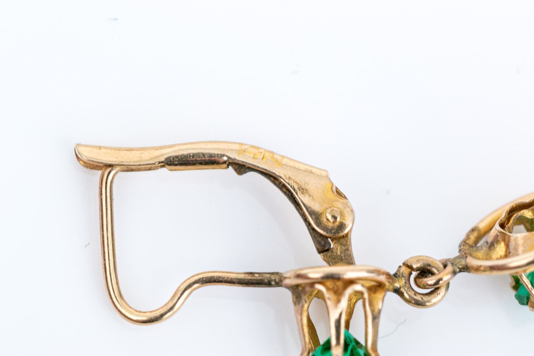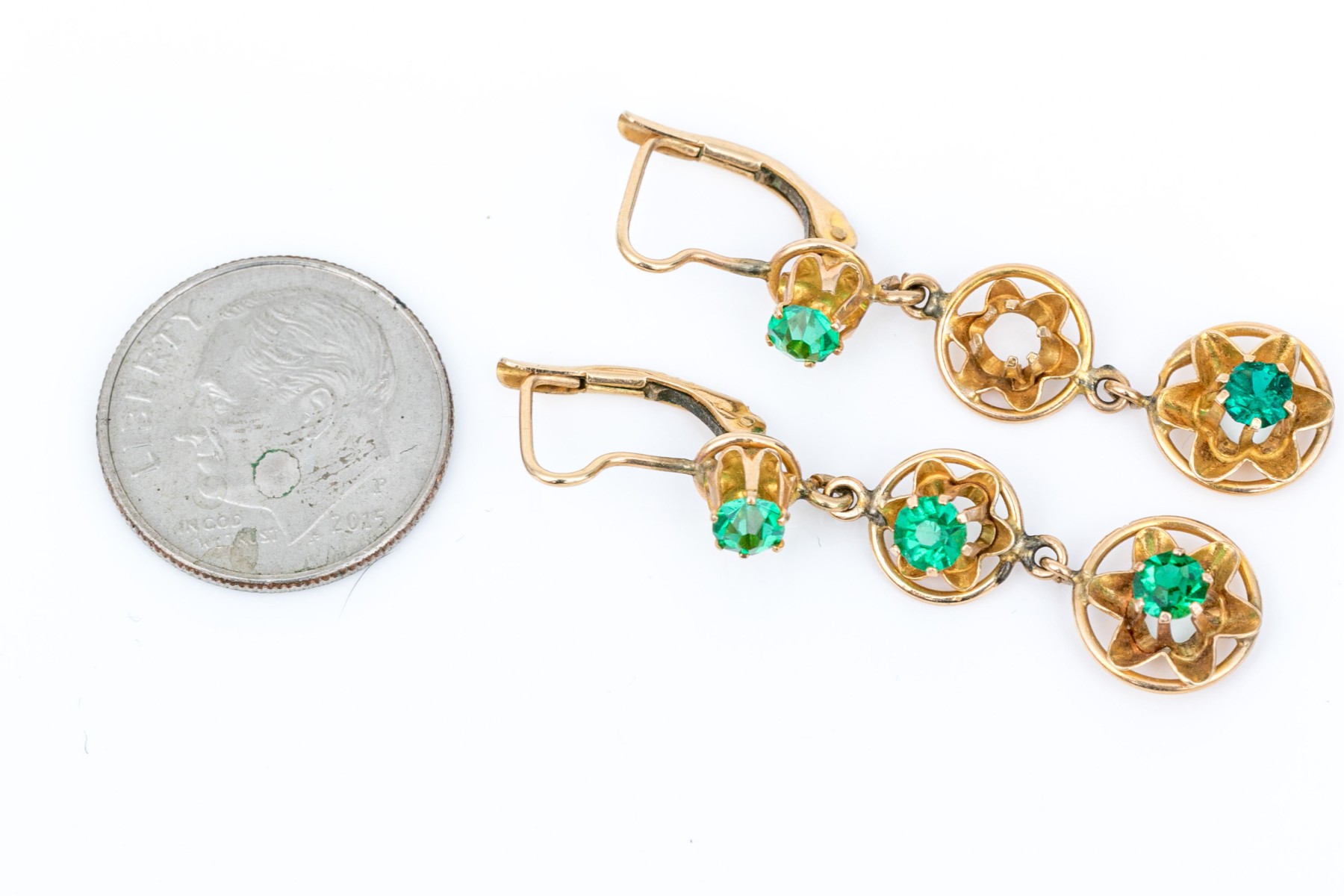 14k yellow gold pretty green cz drop earrings, finished with lever style backs
