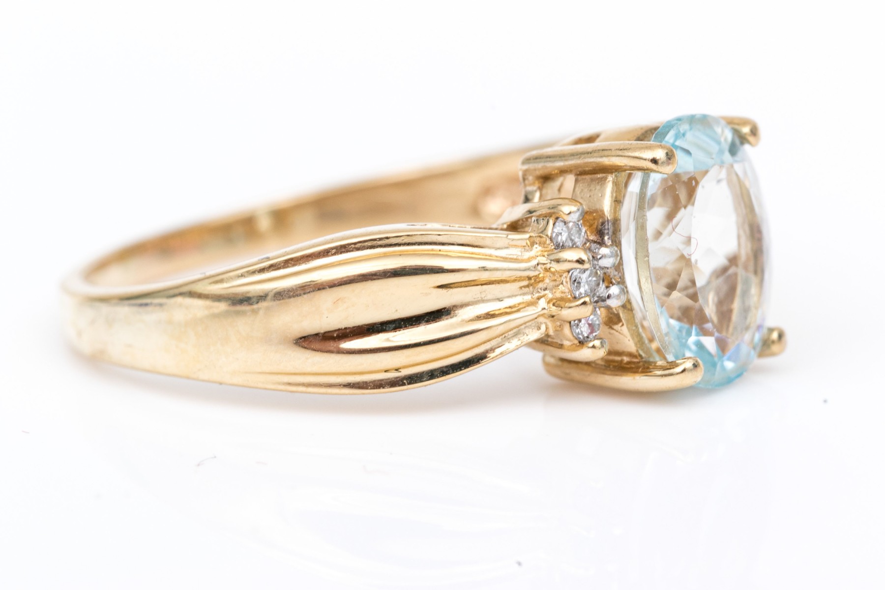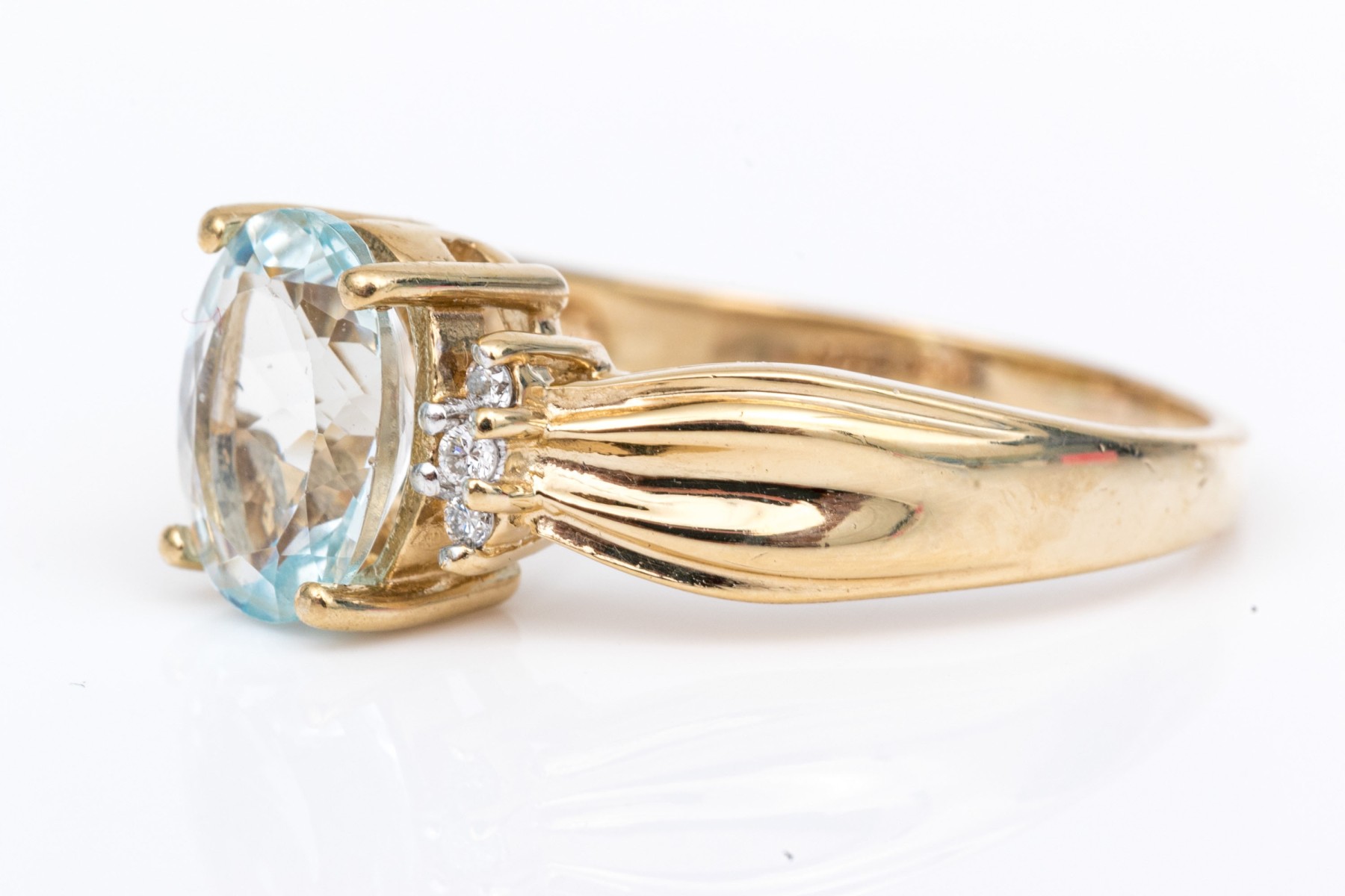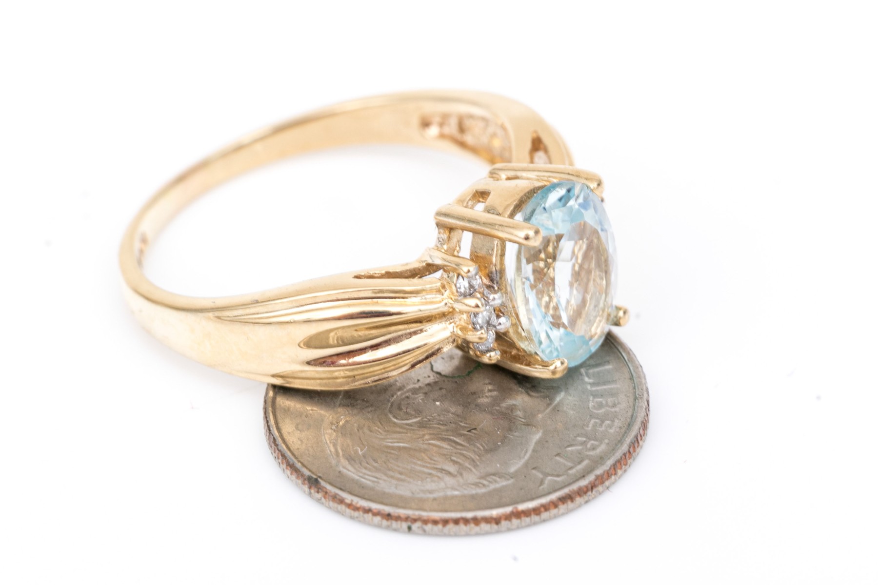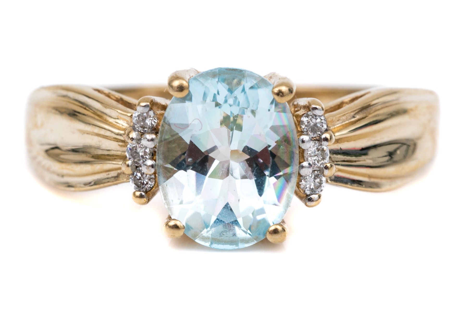 14k yellow gold pretty oval aquamarine and diamond ring, size 8.25. This lovely ring features an oval faceted pale blue aquamarine center, app. 1.59 CTS, prong set and flanked by gathered shoulders, set with round faceted diamonds, app. 0.06 TCW, also prong set
