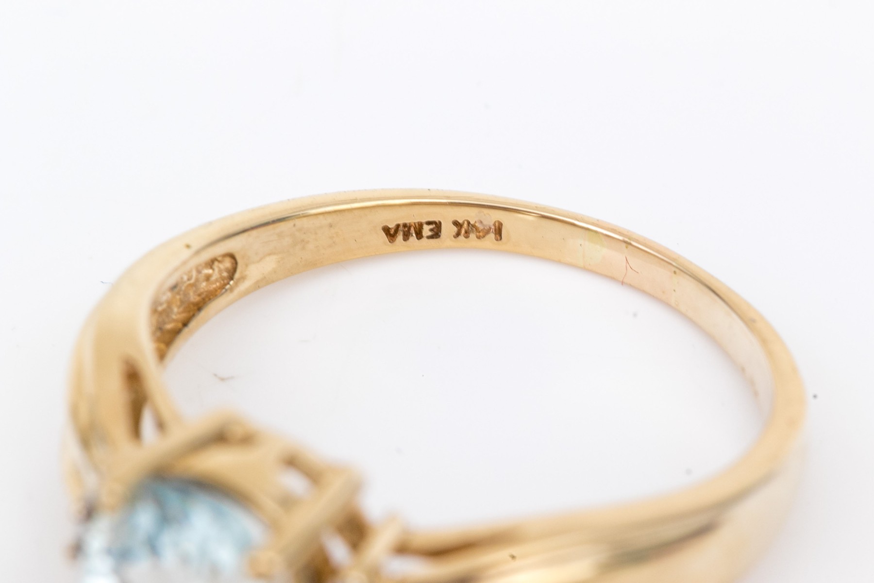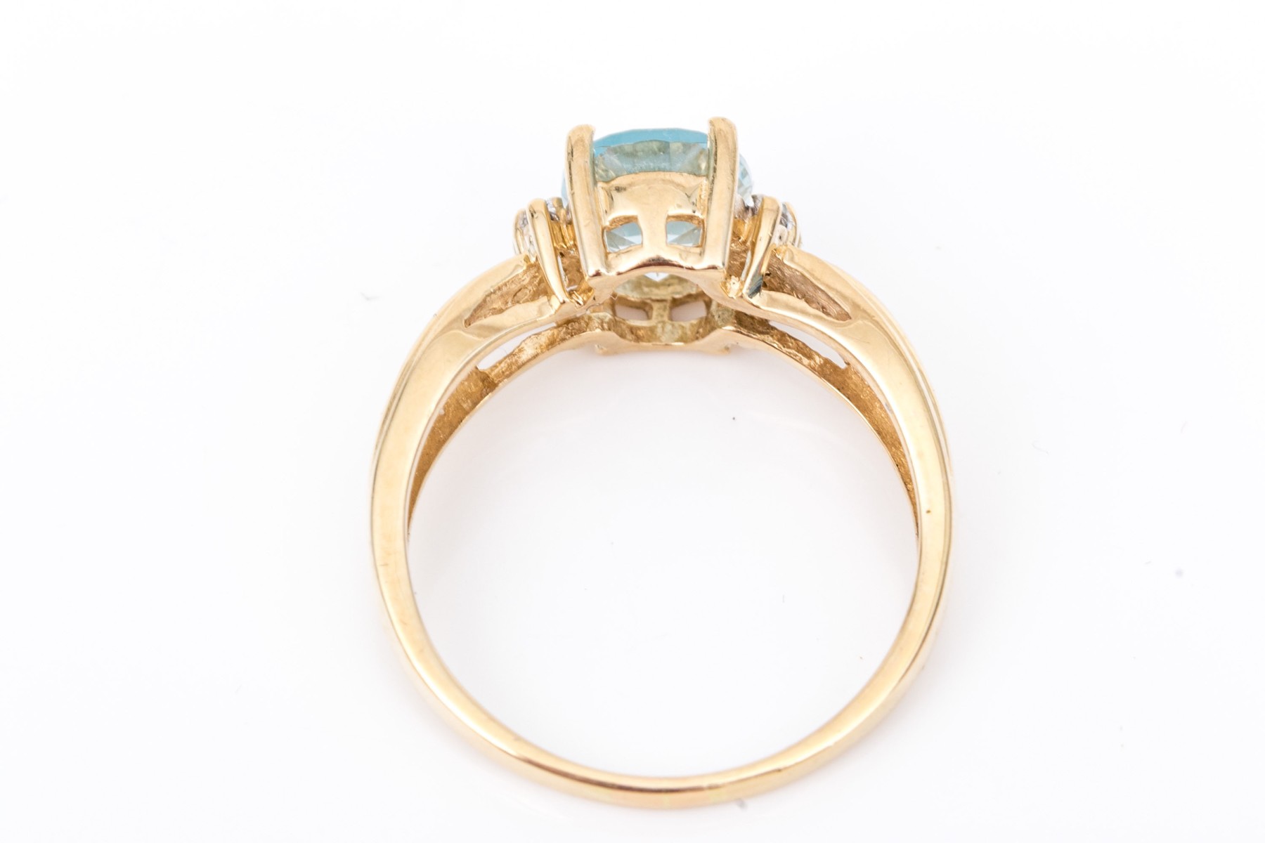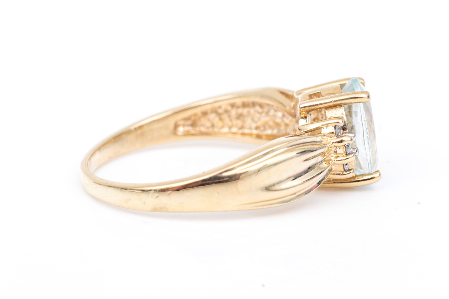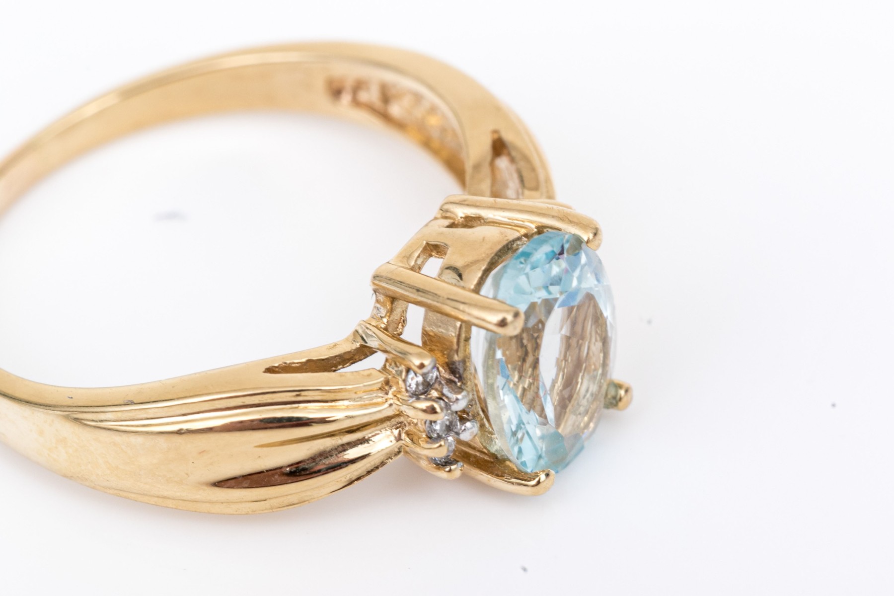 14k yellow gold pretty oval aquamarine and diamond ring, size 8.25. This lovely ring features an oval faceted pale blue aquamarine center, app. 1.59 CTS, prong set and flanked by gathered shoulders, set with round faceted diamonds, app. 0.06 TCW, also prong set
