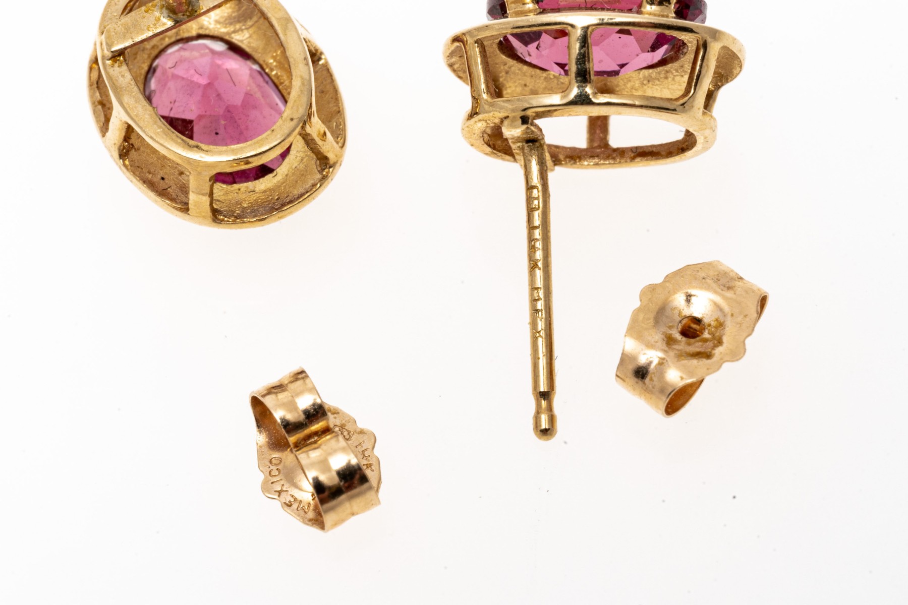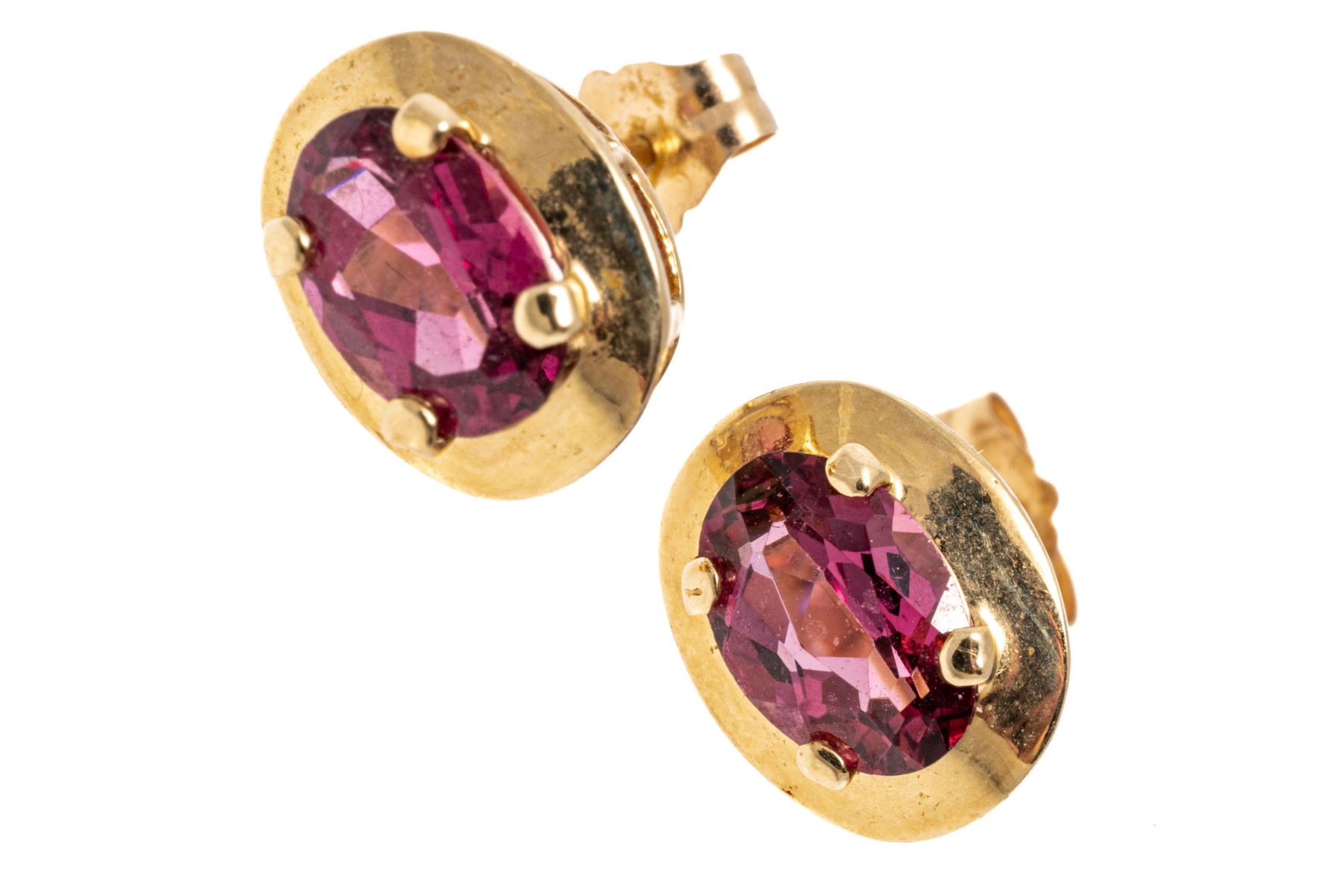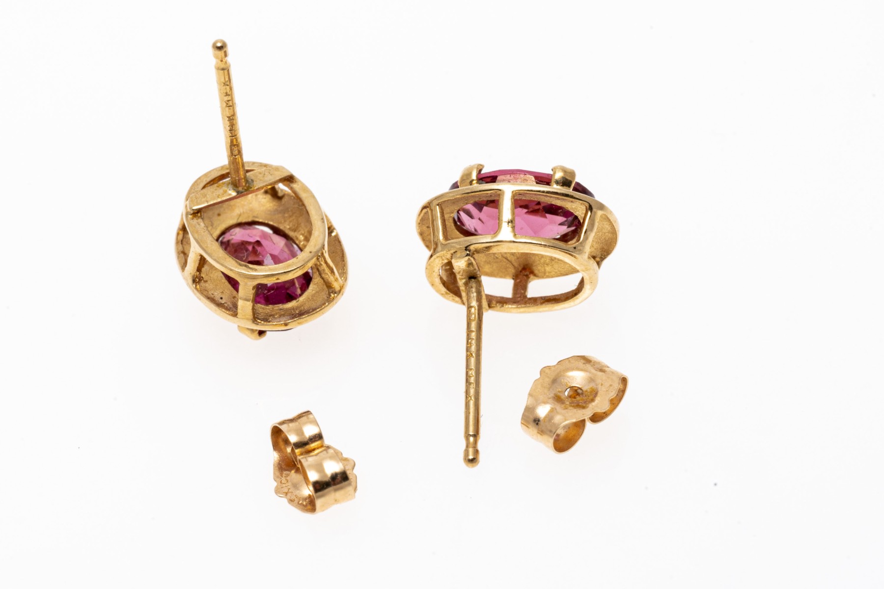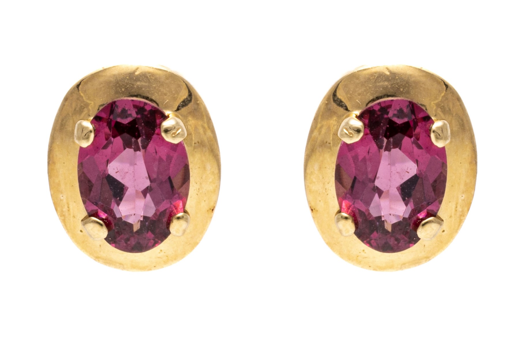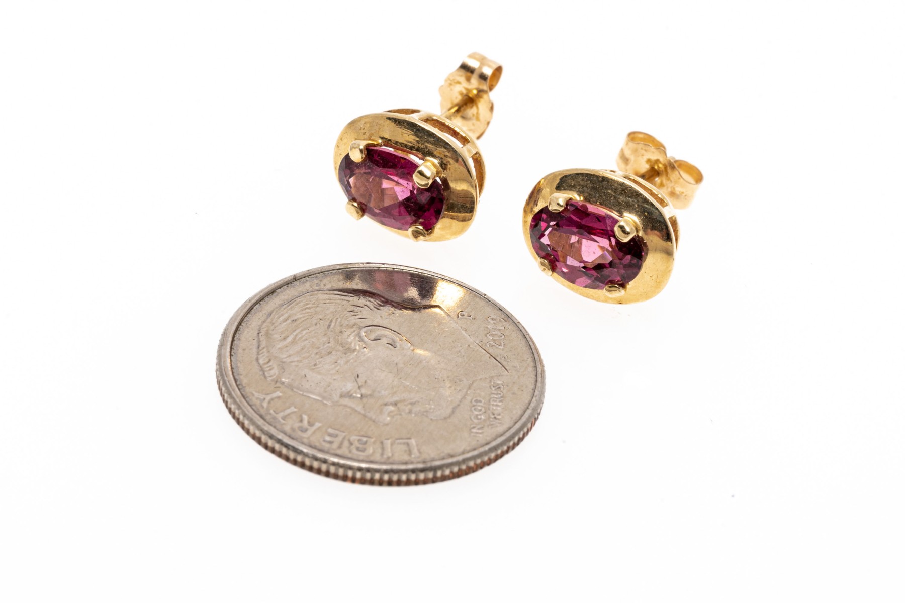 14K yellow gold pretty oval faceted rhodolite garnet and gold framed earrings, approximately 1.56 TCW, prong set. The earrings are finished with posts and clutch style backs.