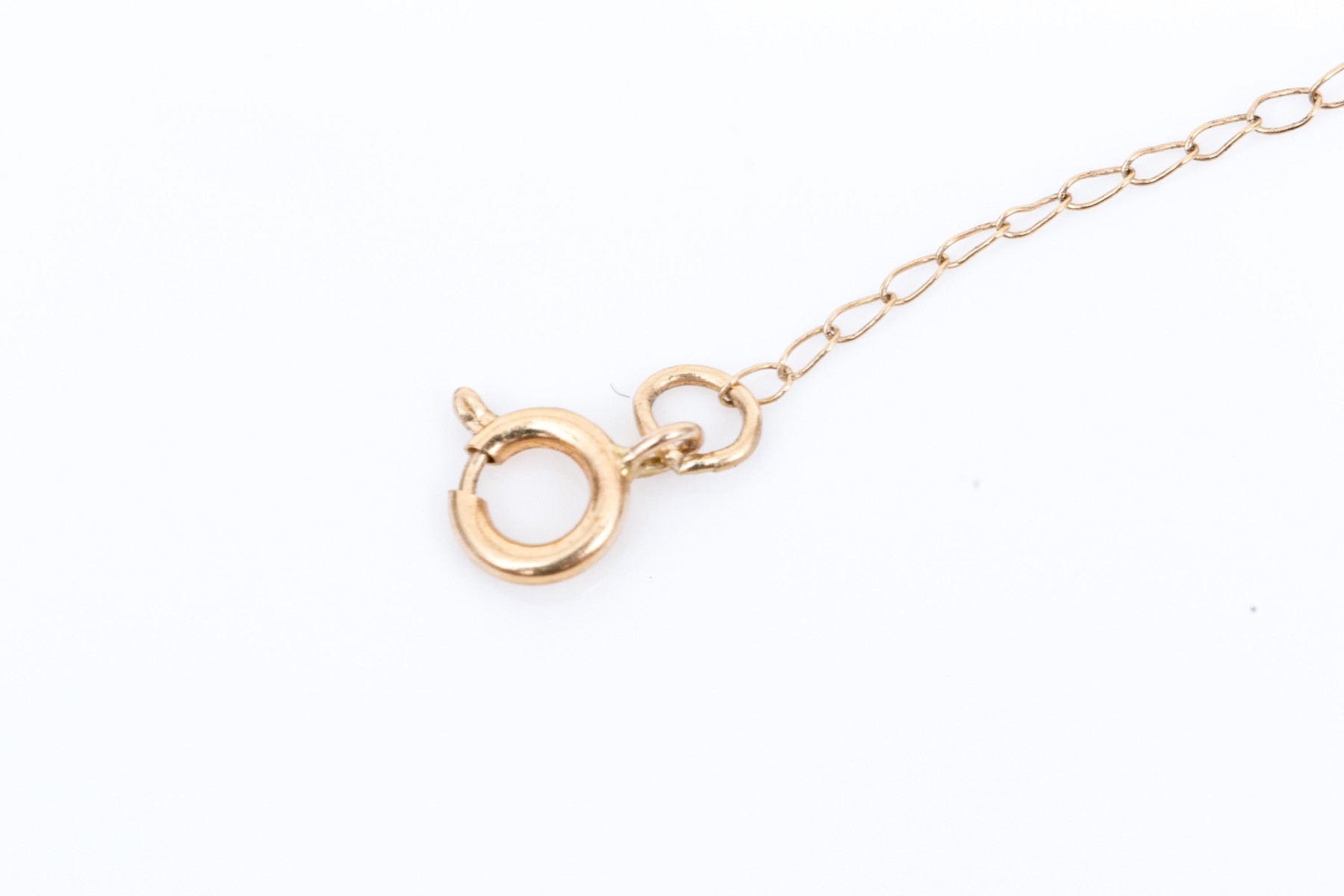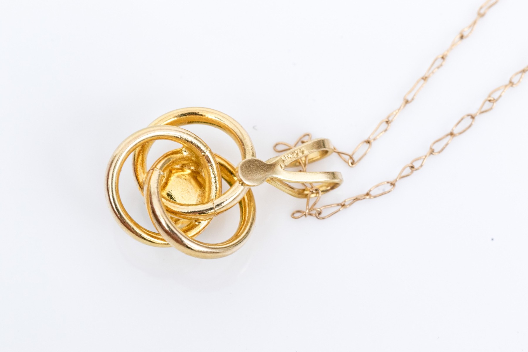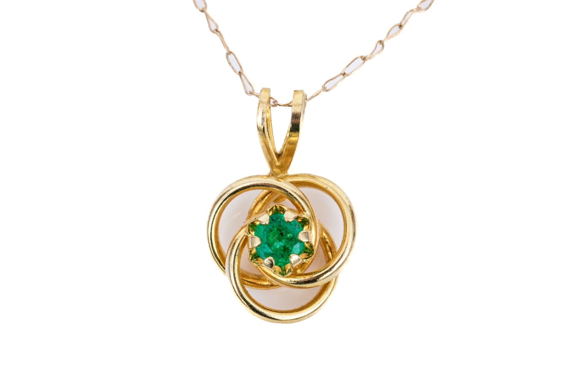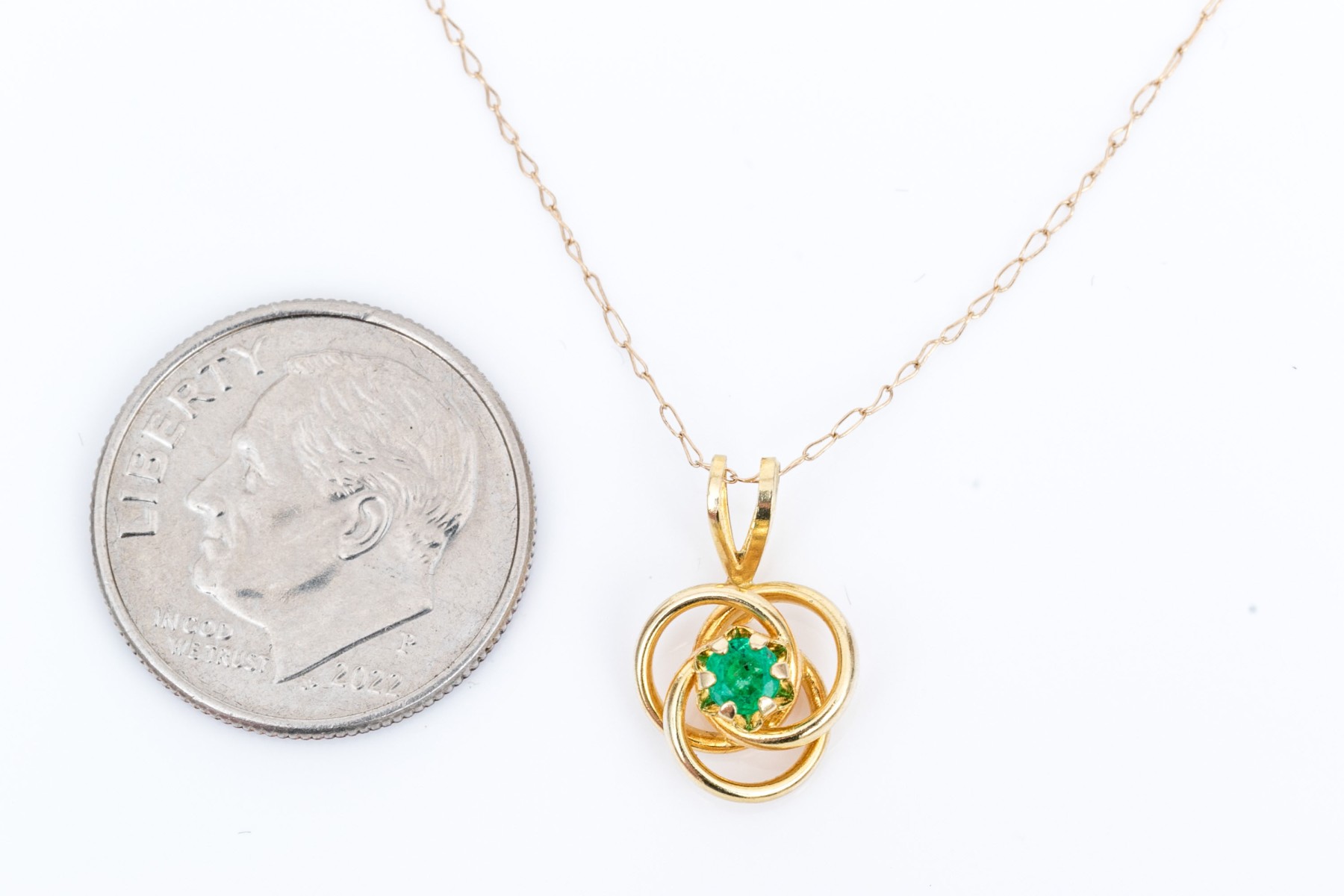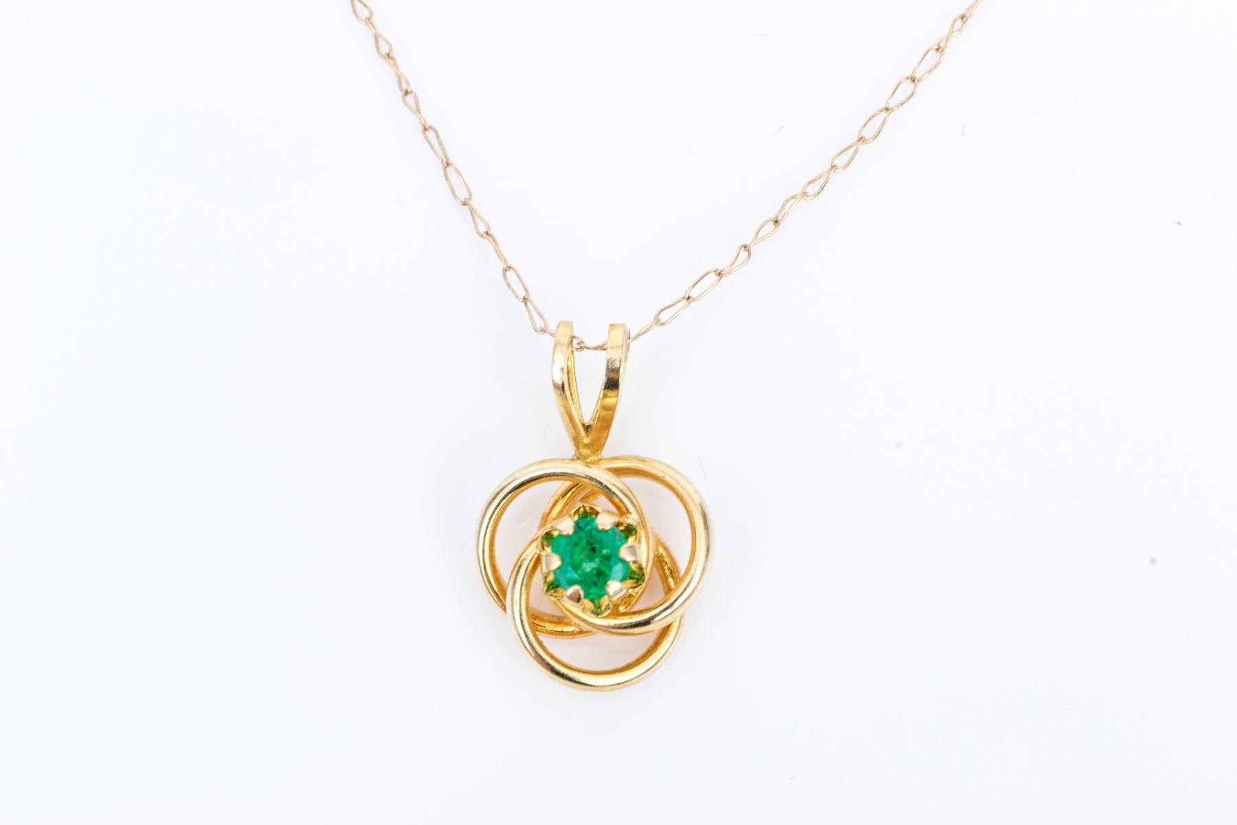 14k yellow gold pretty simple emerald knot pendant, 0.12 CTS, prong set, finished with a fine cable link style chain