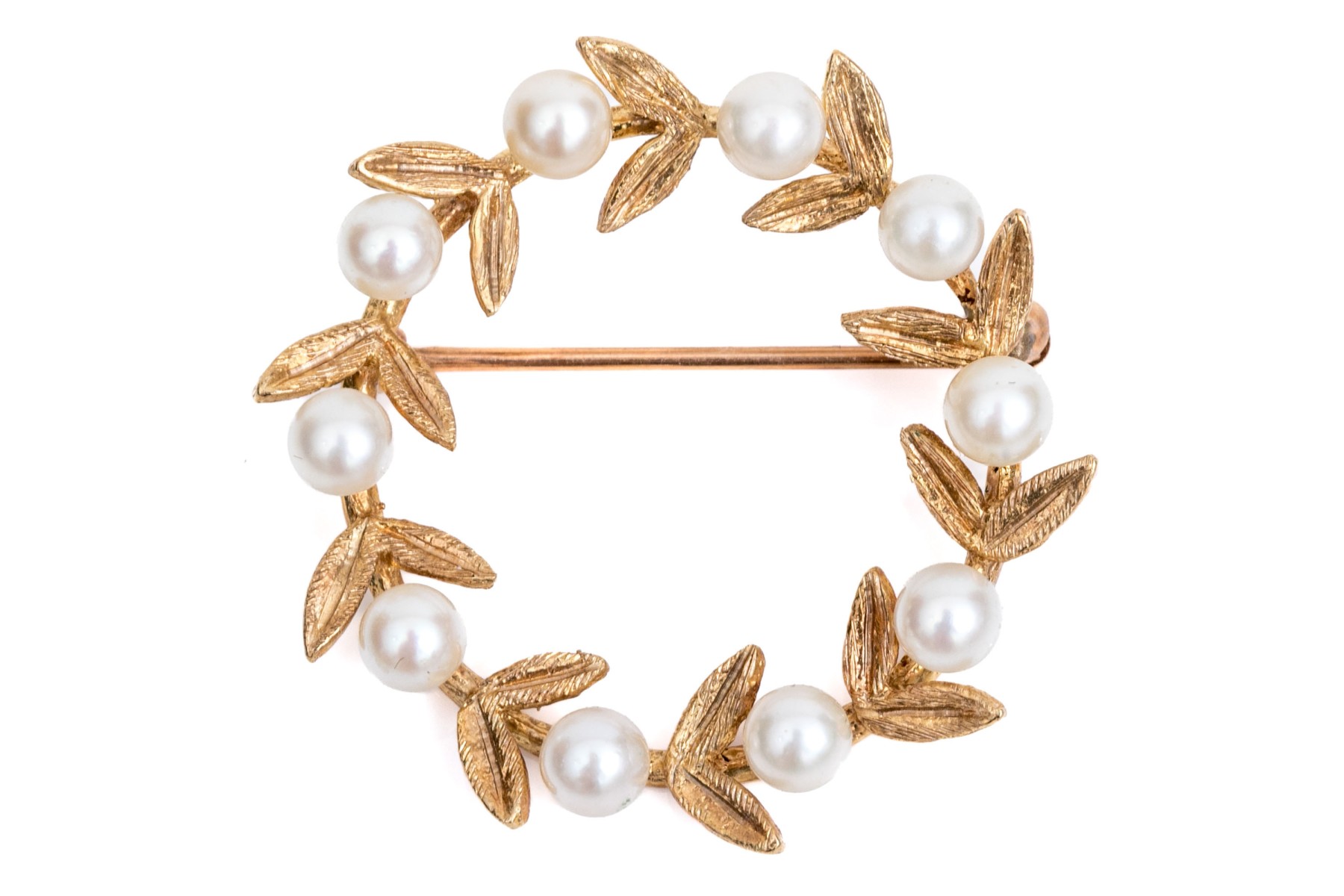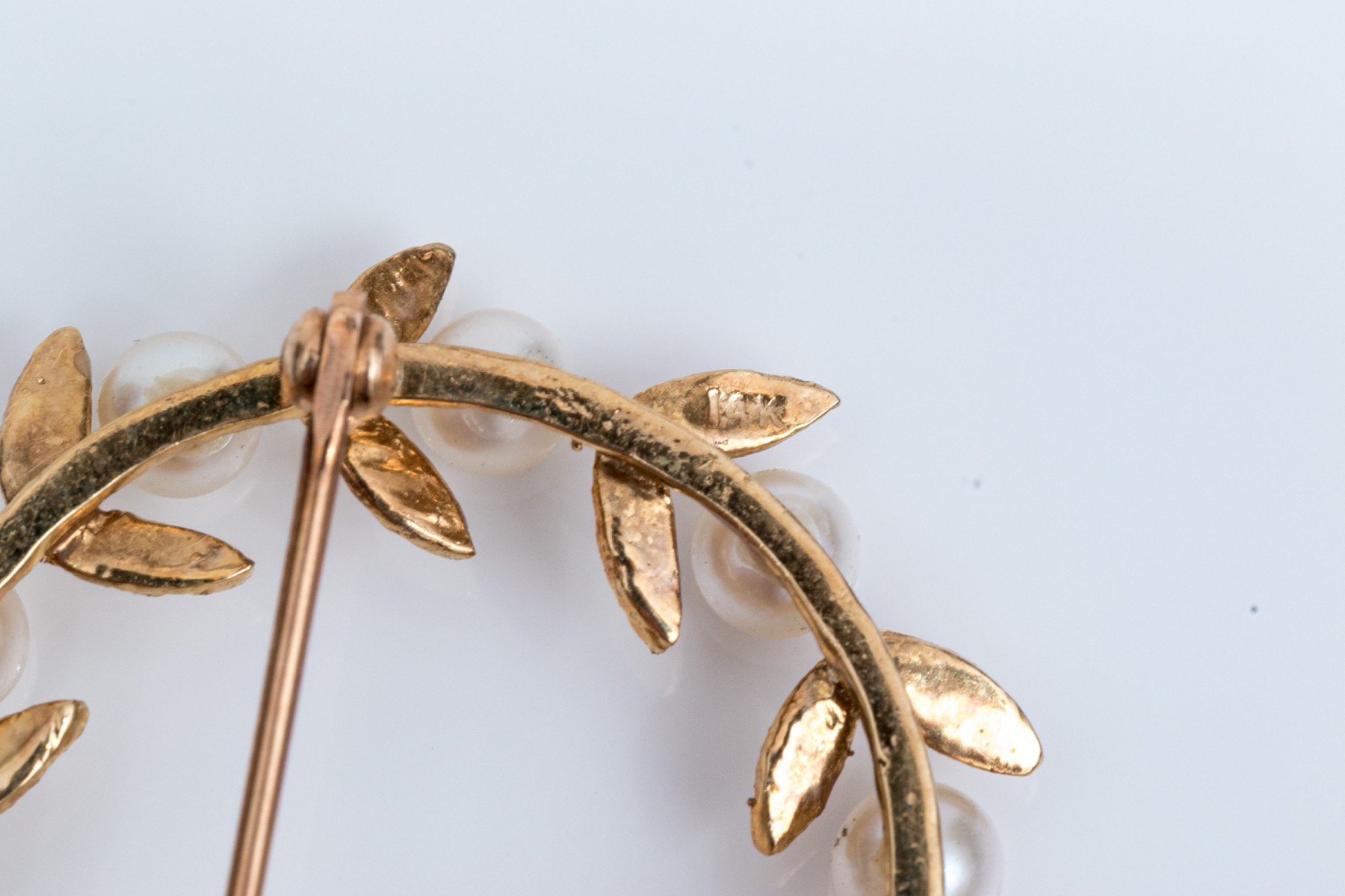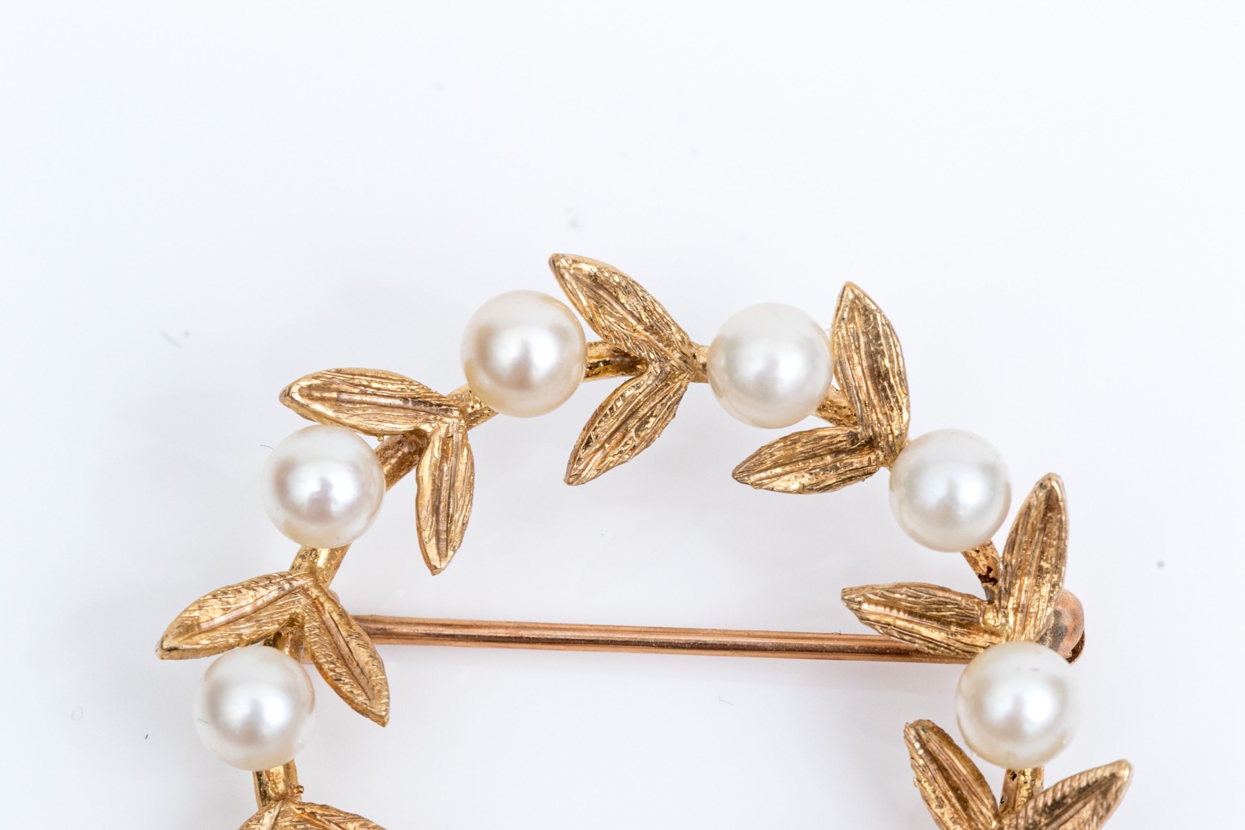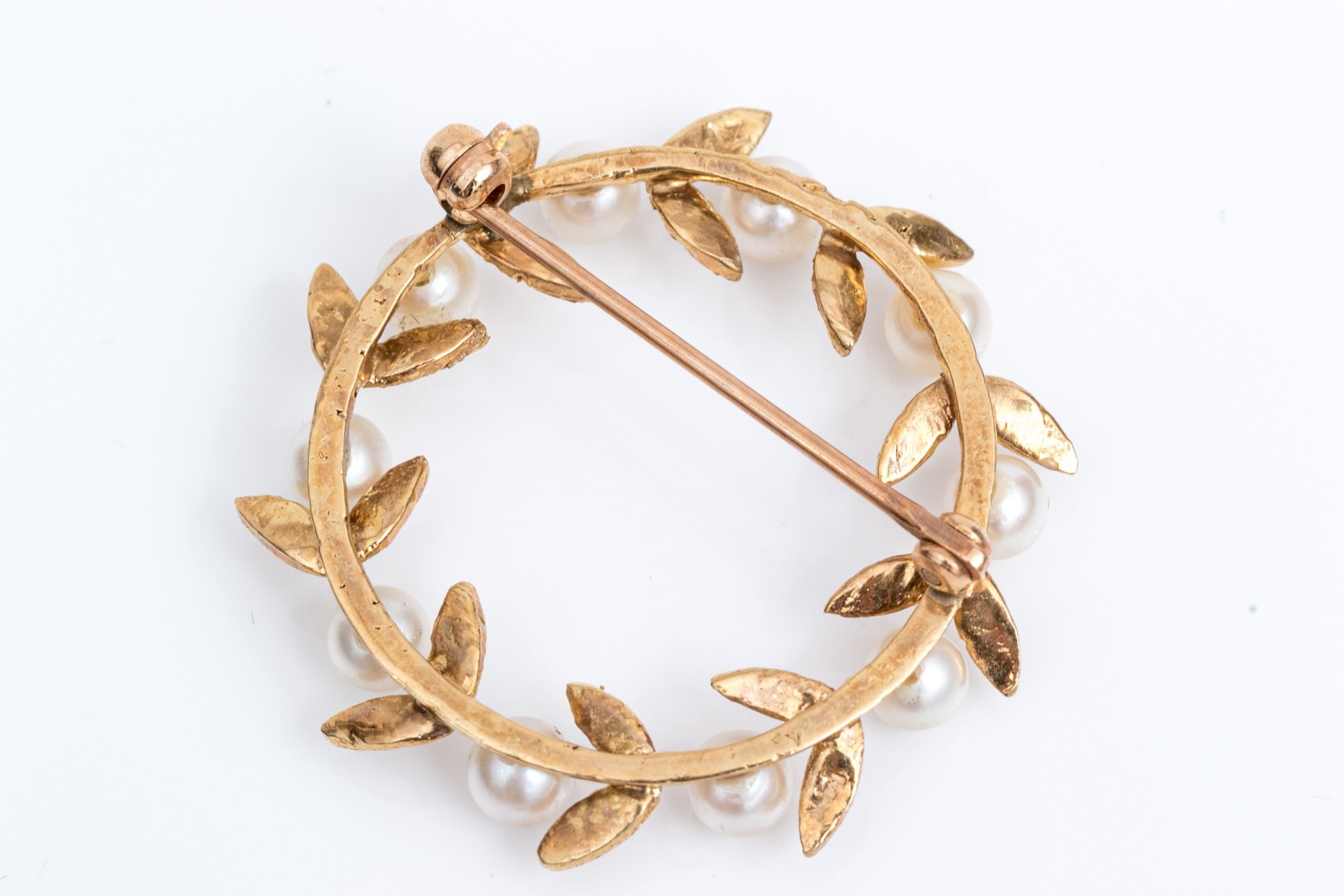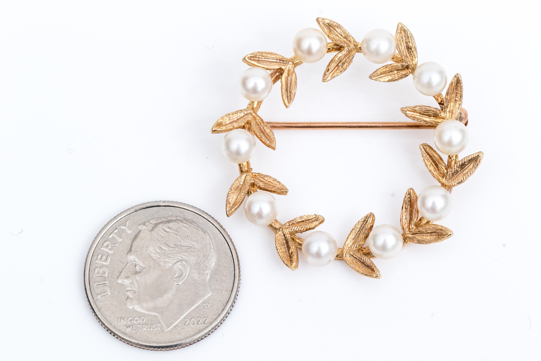 14k yellow gold pretty vintage 3.5 mm cultured pearl and leaf motif circle brooch, Florentine finished