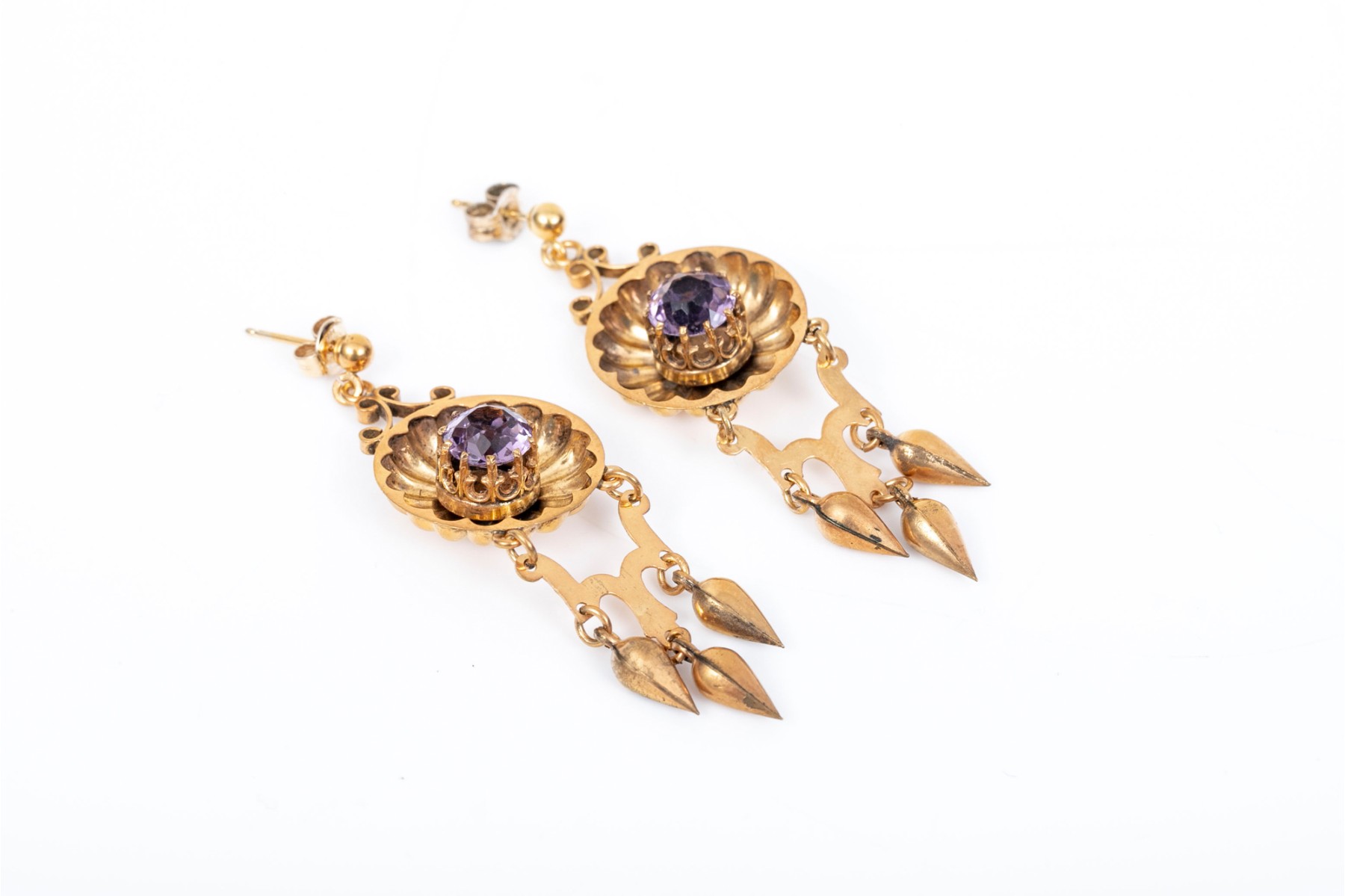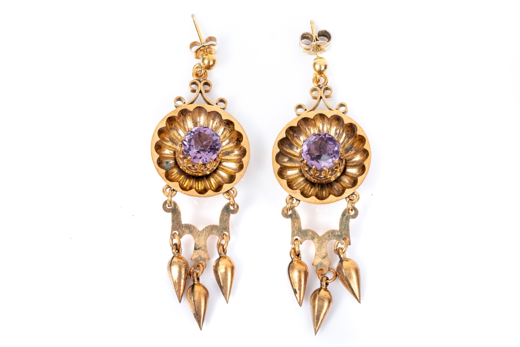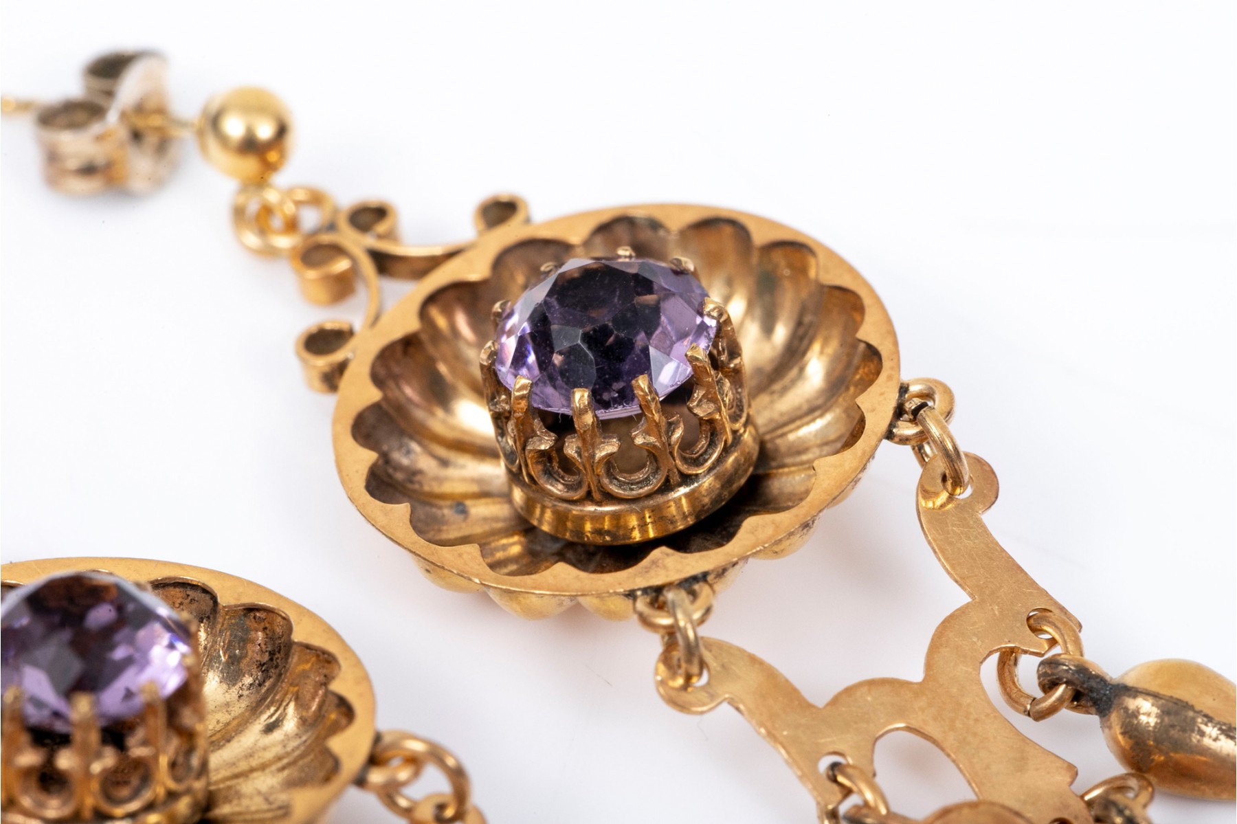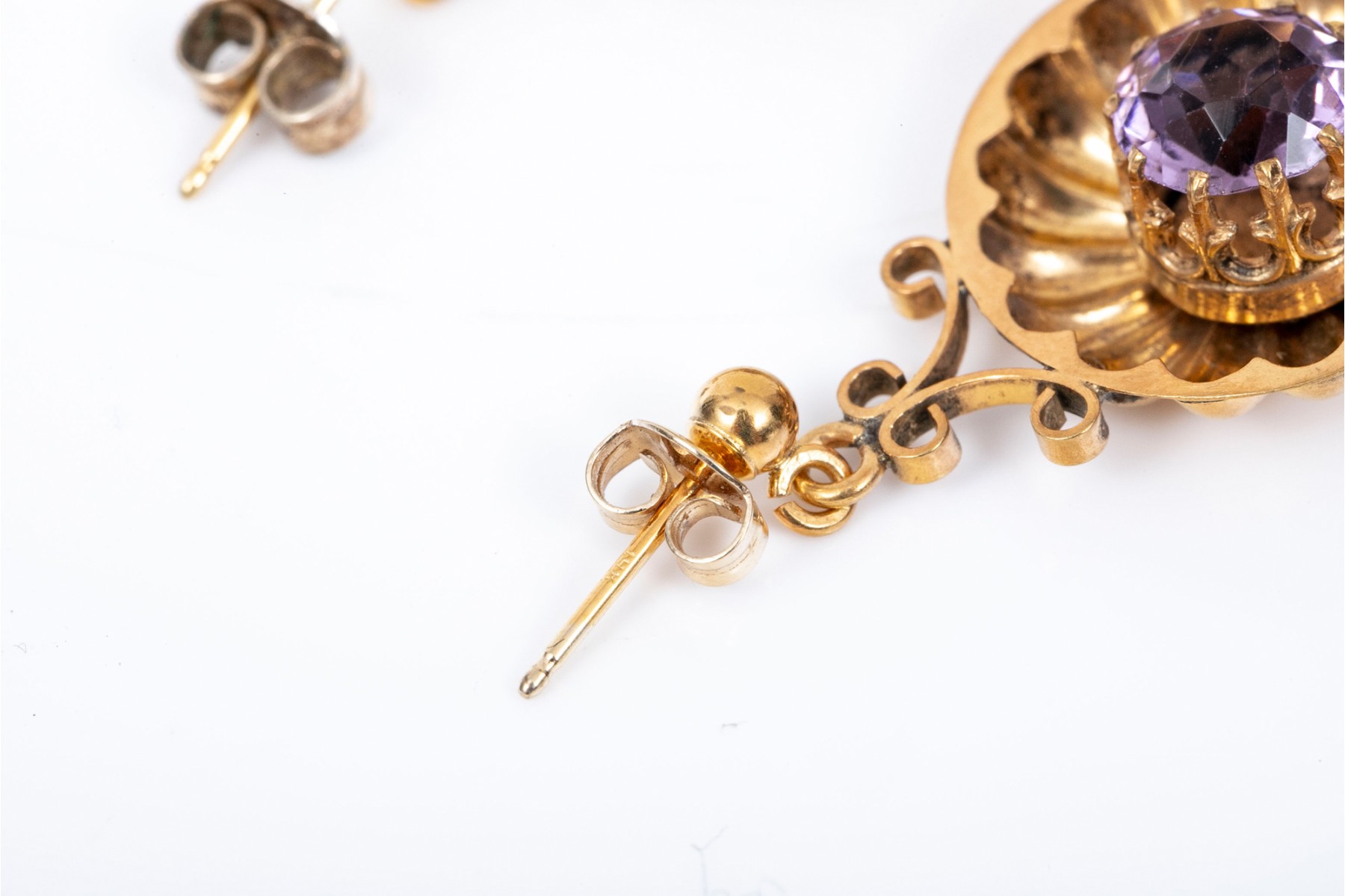 14k yellow gold earrings. These pretty yellow gold vintage earrings are a drop style, with pendants set with round faceted, pale purple color glass centers, prong set. The earrings are finished with posts and clutch style backs.
