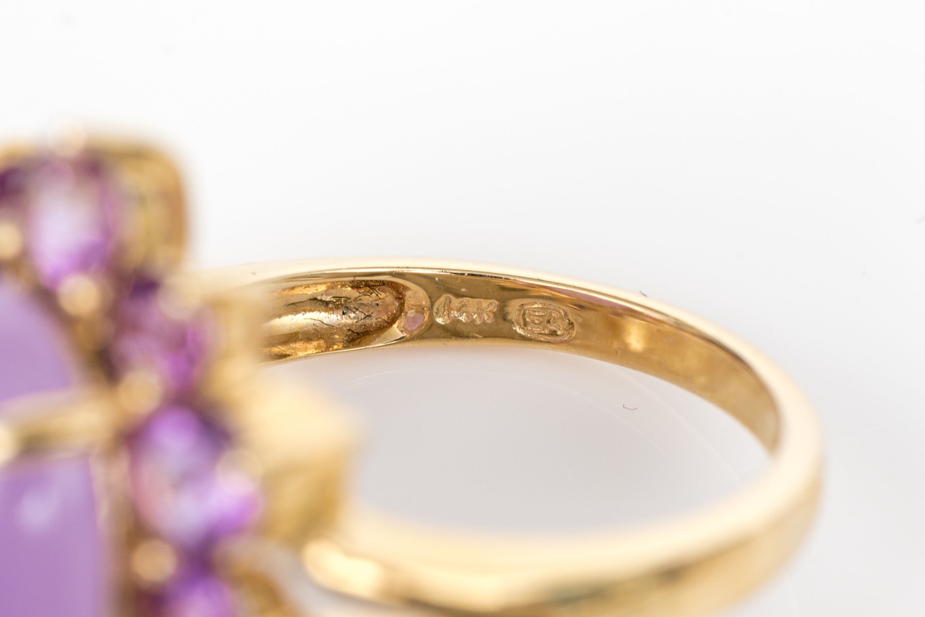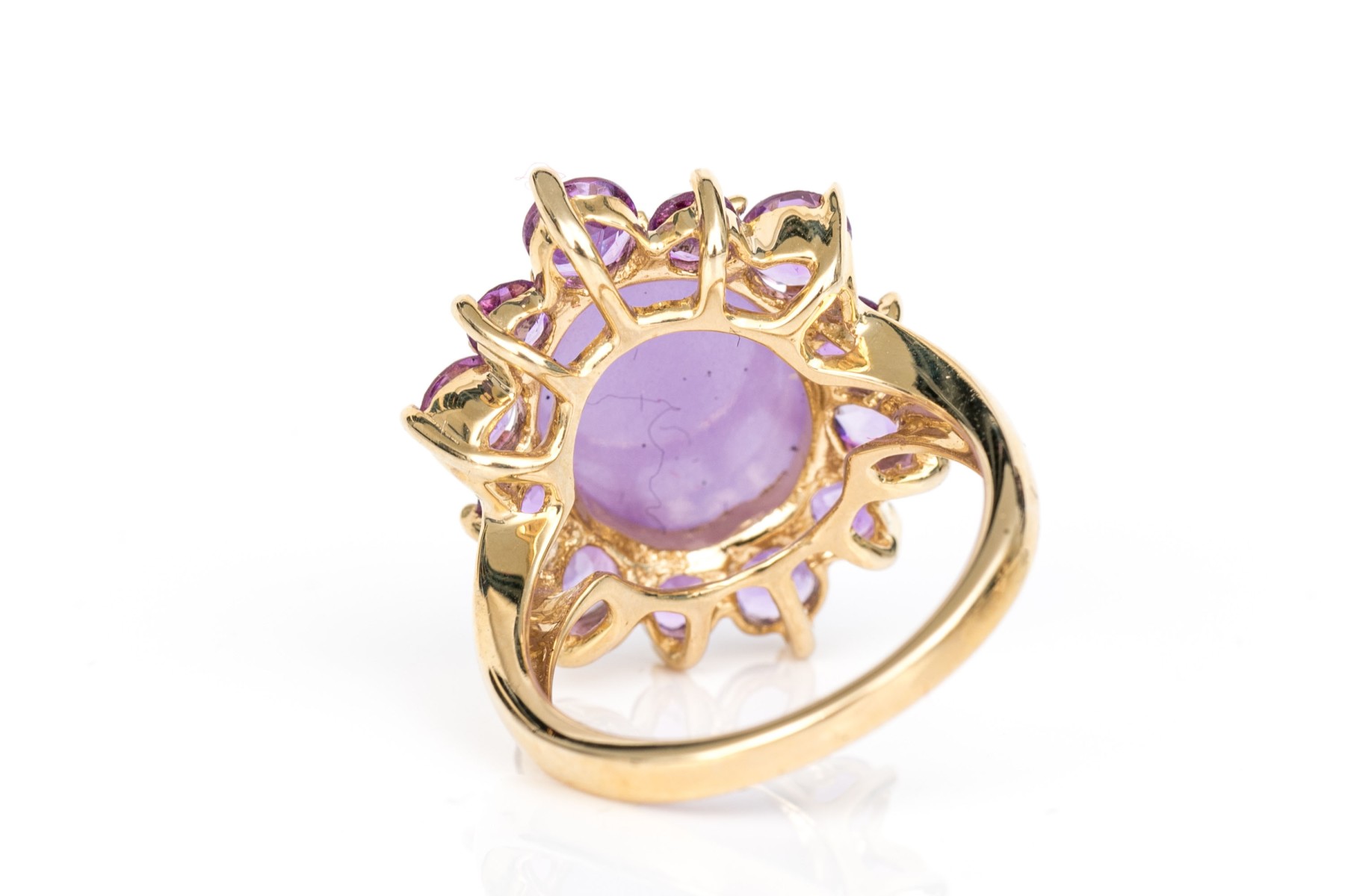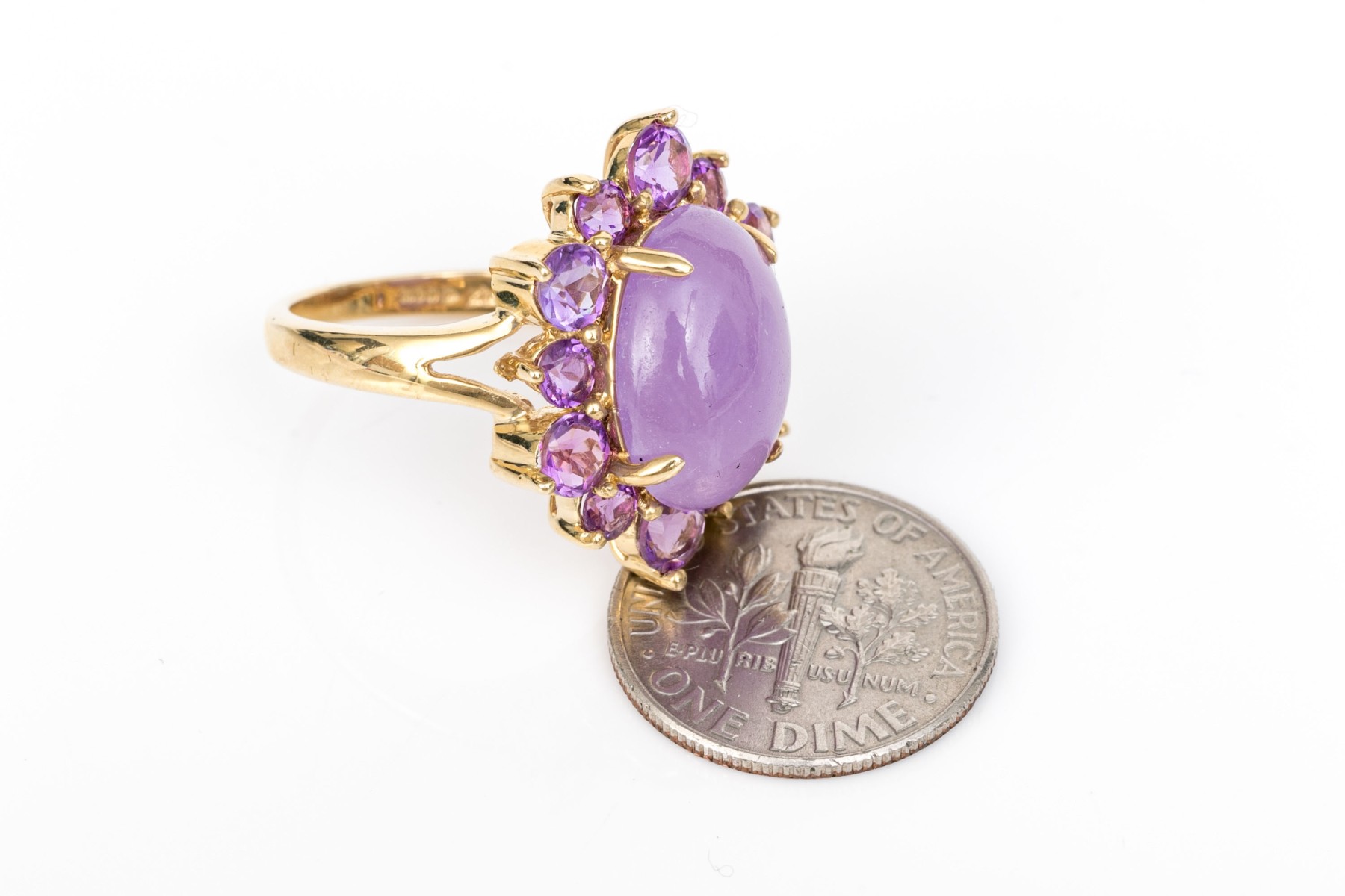 14k yellow gold purple aventurine and amethyst halo cocktail ring, size 6. This impactful ring is set with a center oval purple aventurine quartz cabachon, surrounded by a frame of round faceted amethysts, approximately 0.96 TCW, prong set