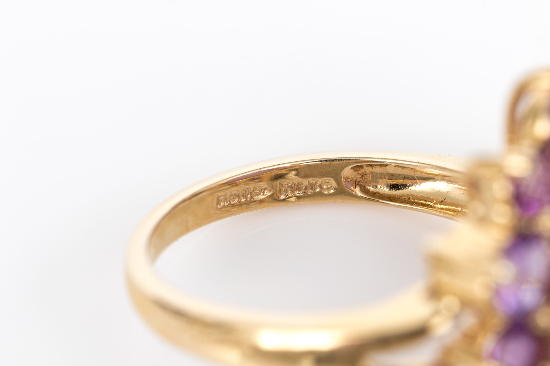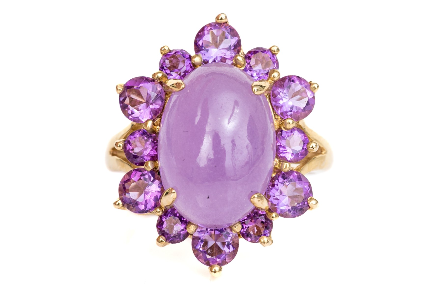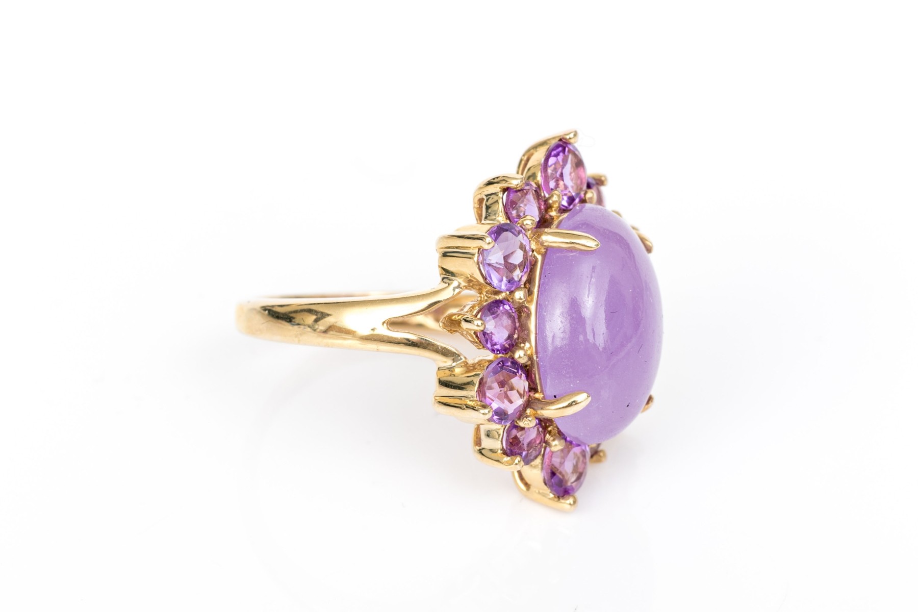14k yellow gold purple aventurine and amethyst halo cocktail ring, size 6. This impactful ring is set with a center oval purple aventurine quartz cabachon, surrounded by a frame of round faceted amethysts, approximately 0.96 TCW, prong set