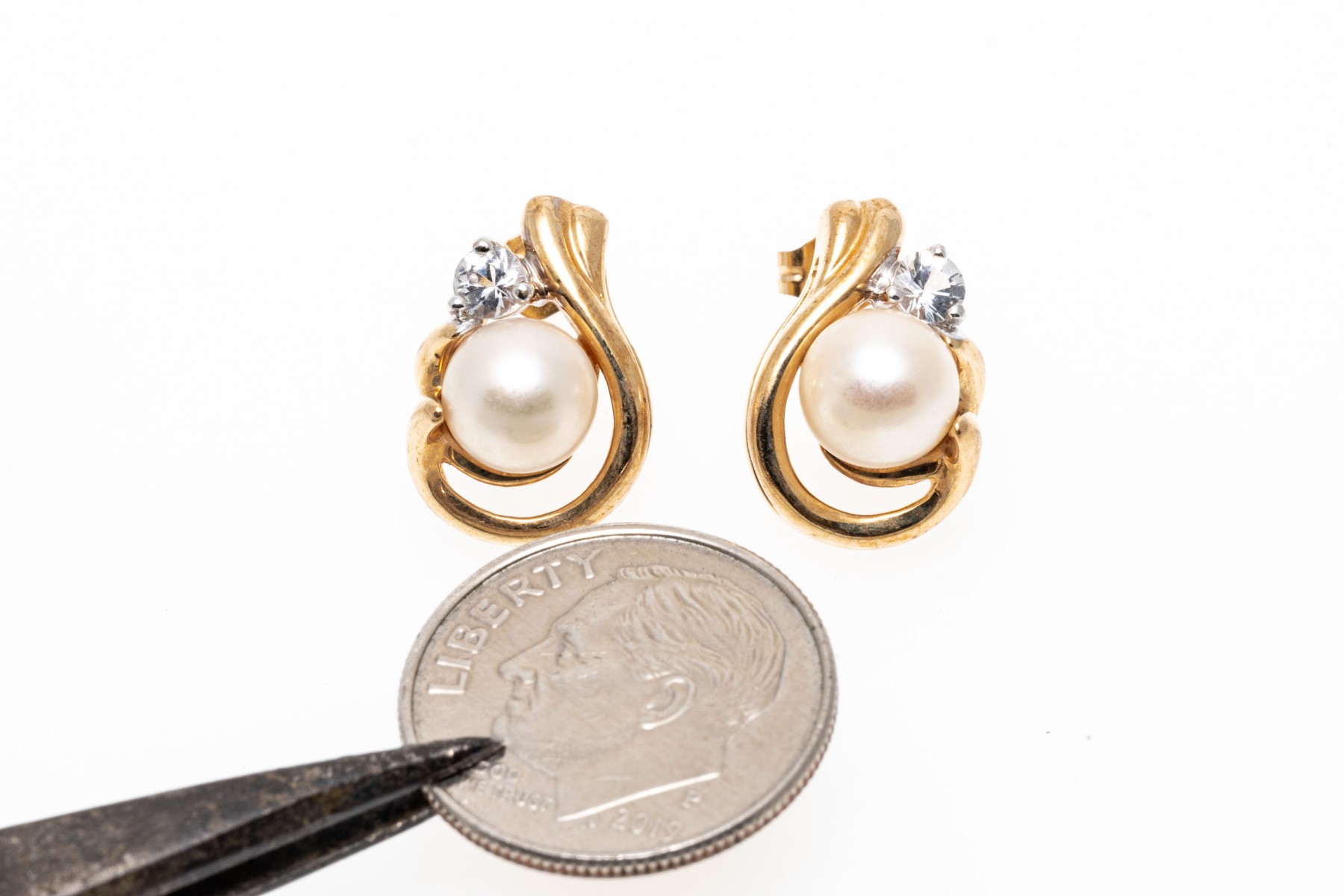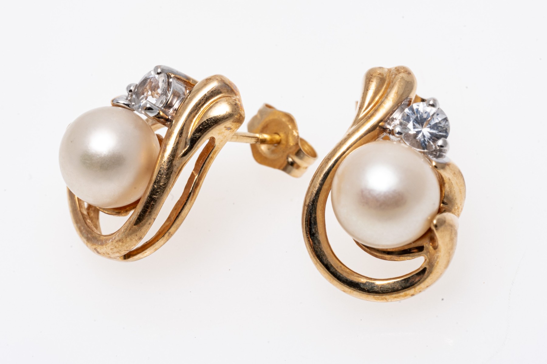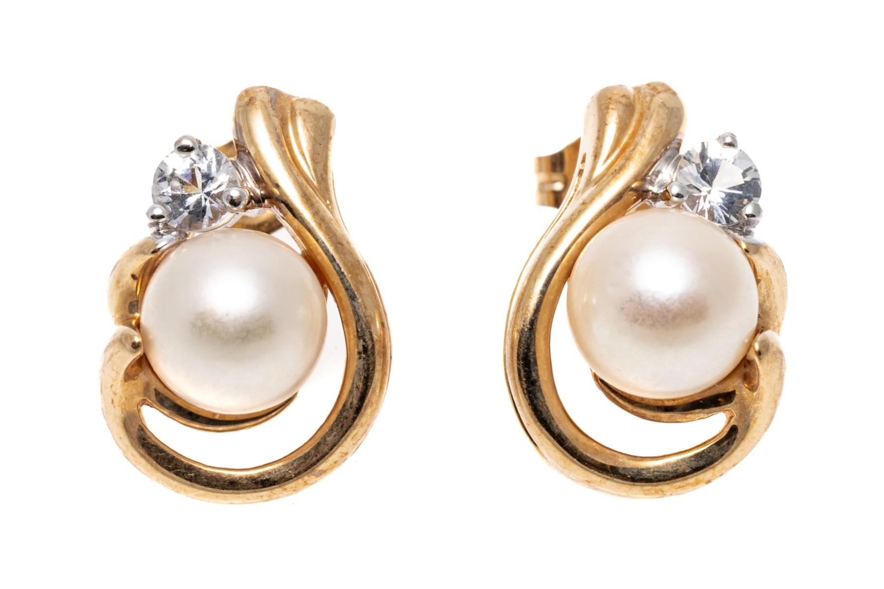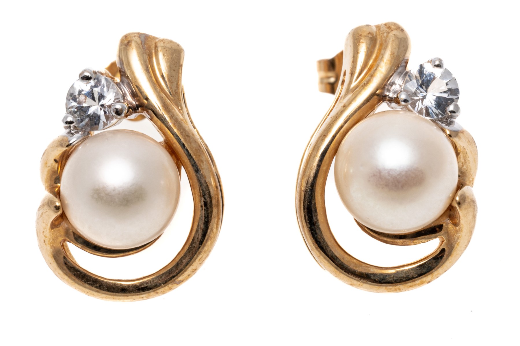 14k yellow gold retro 6.5 mm cultured pearl and white sapphire swirl earrings, finished by posts with clutch style backs