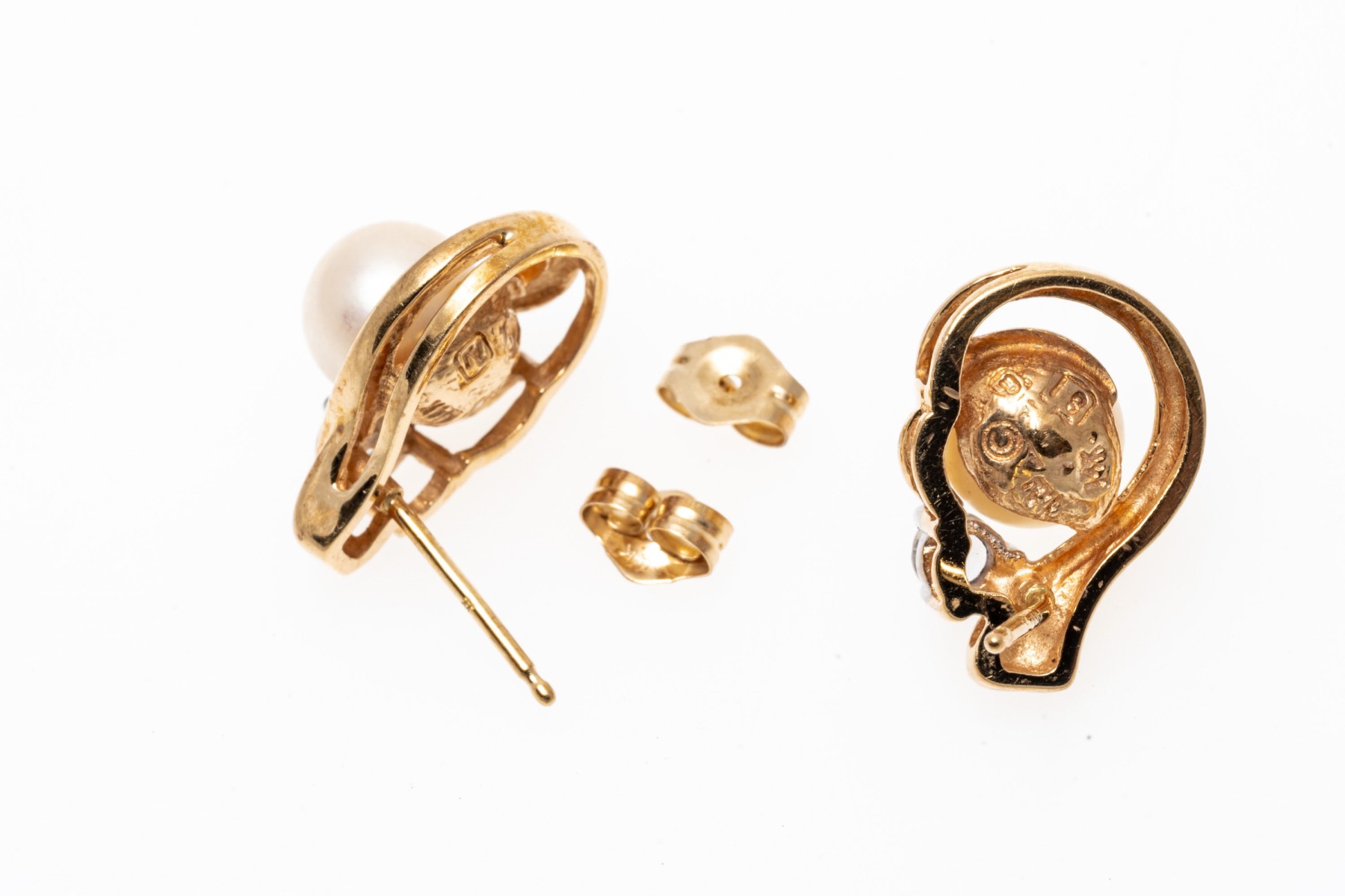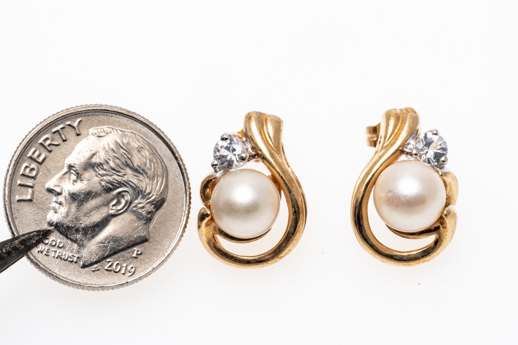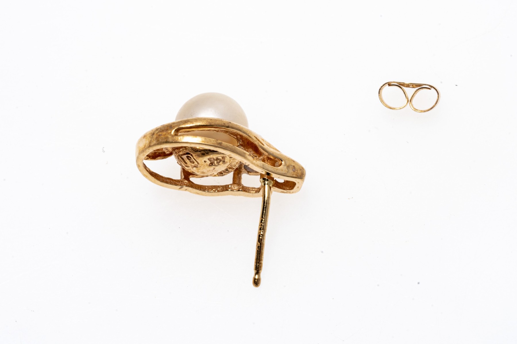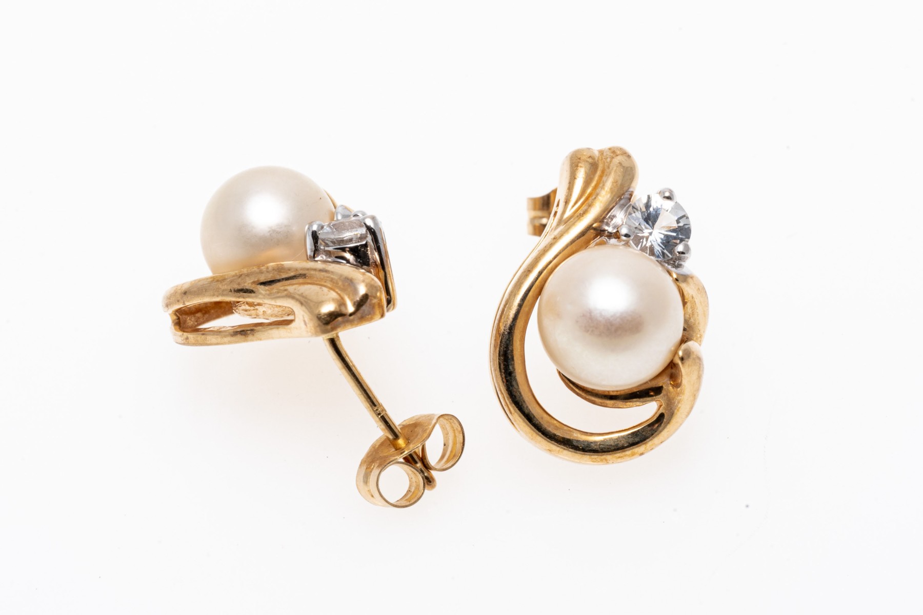 14k yellow gold retro 6.5 mm cultured pearl and white sapphire swirl earrings, finished by posts with clutch style backs